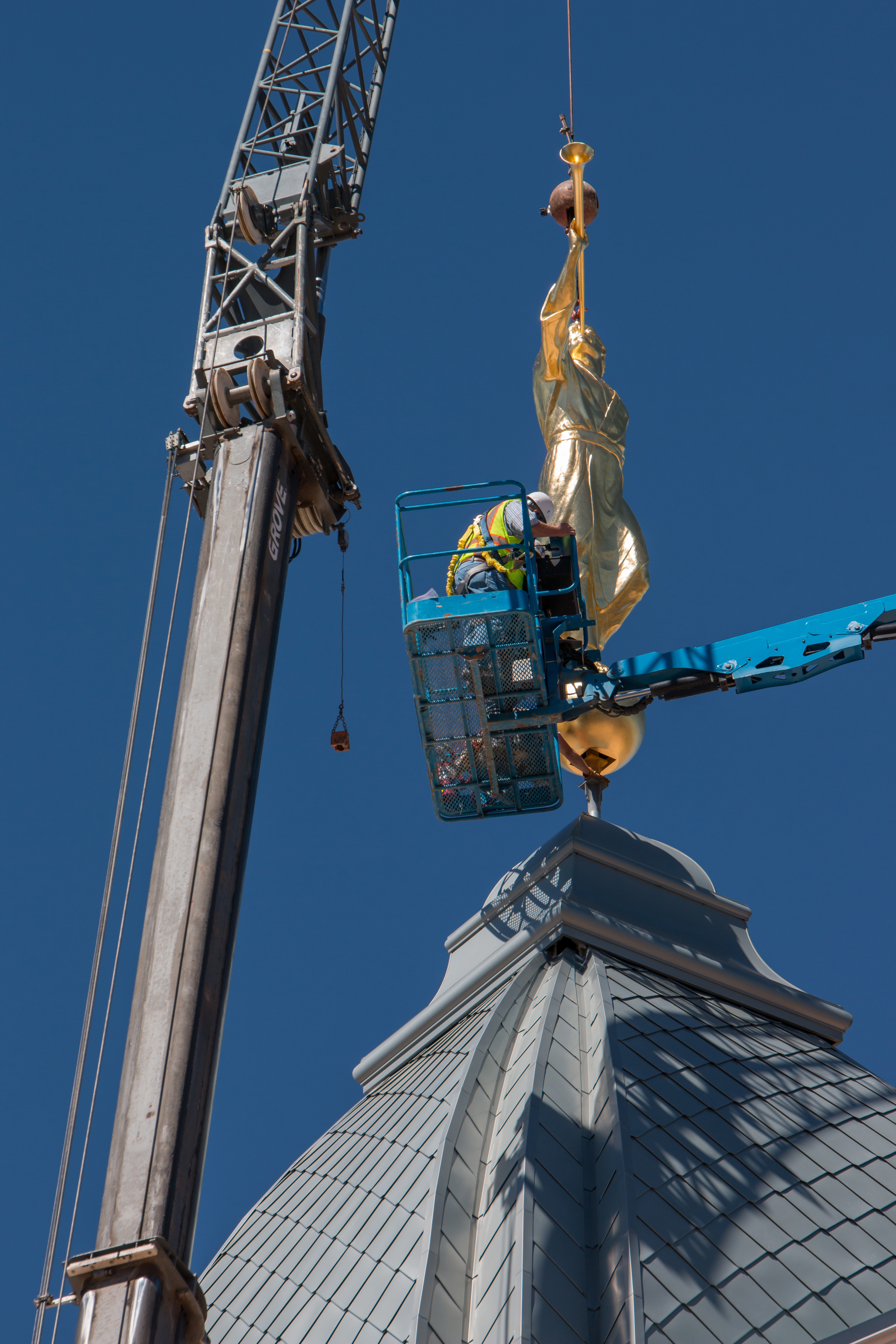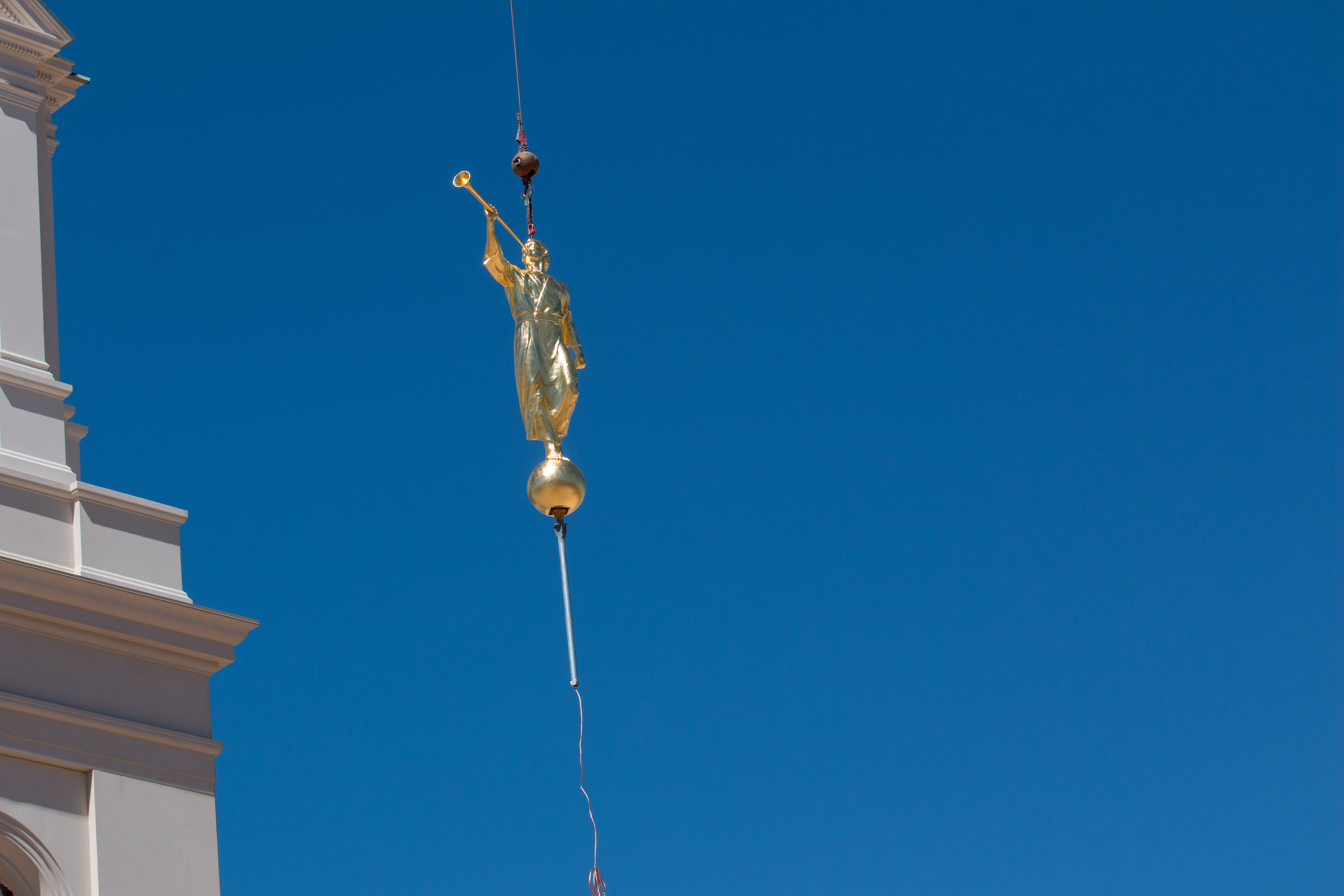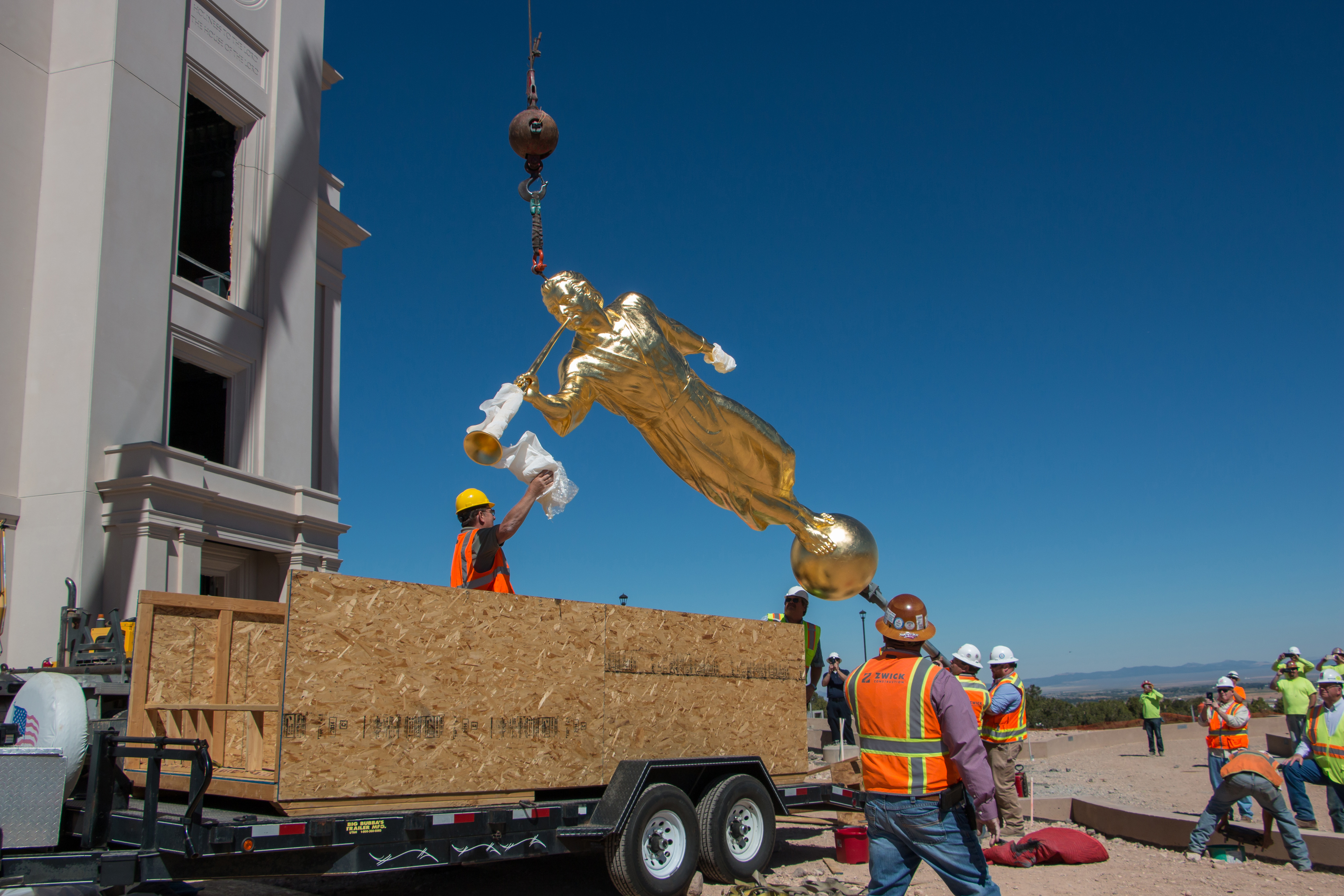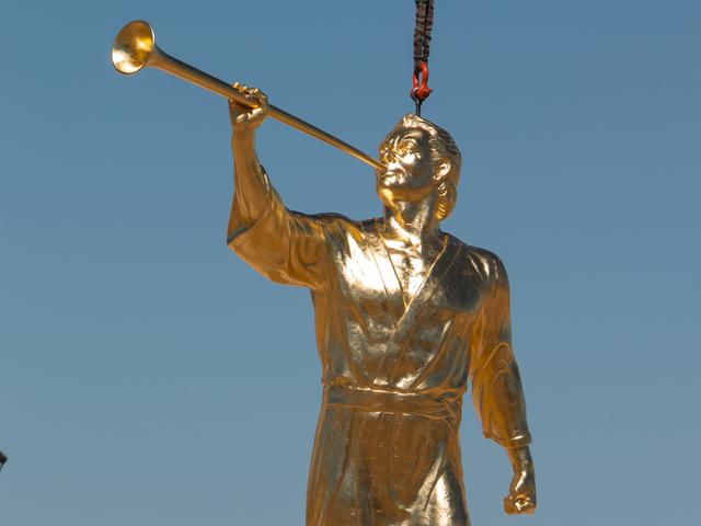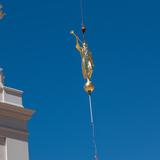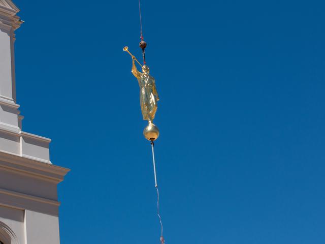 Though there was no formal announcement of the statue’s placement, Latter-day Saints and neighbors to the new temple gathered to watch the process from uncrating the statue to lifting it high into the air; workers guided the gold-plated figure onto the top of the temple.