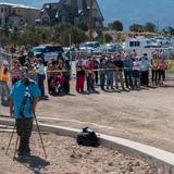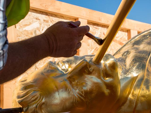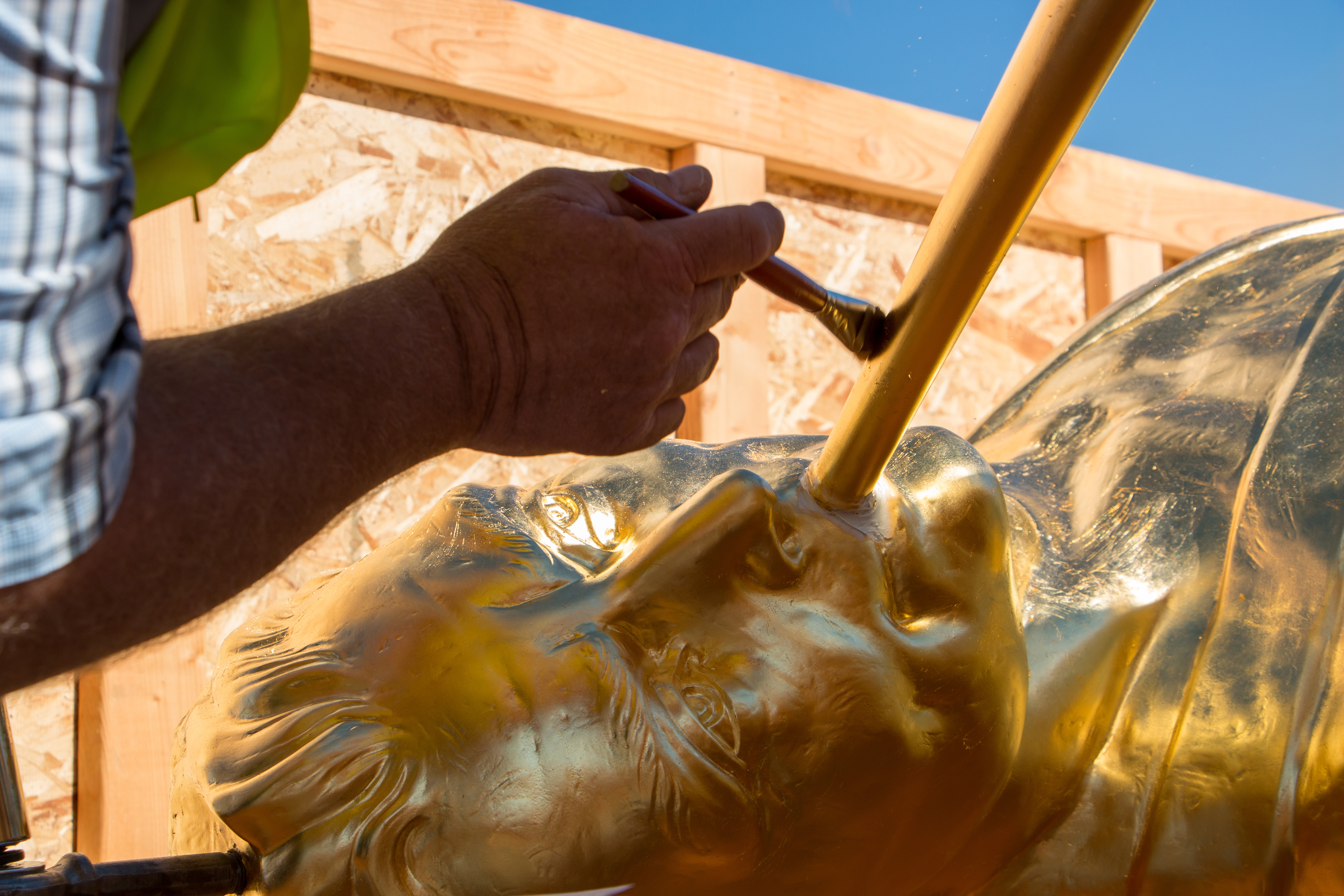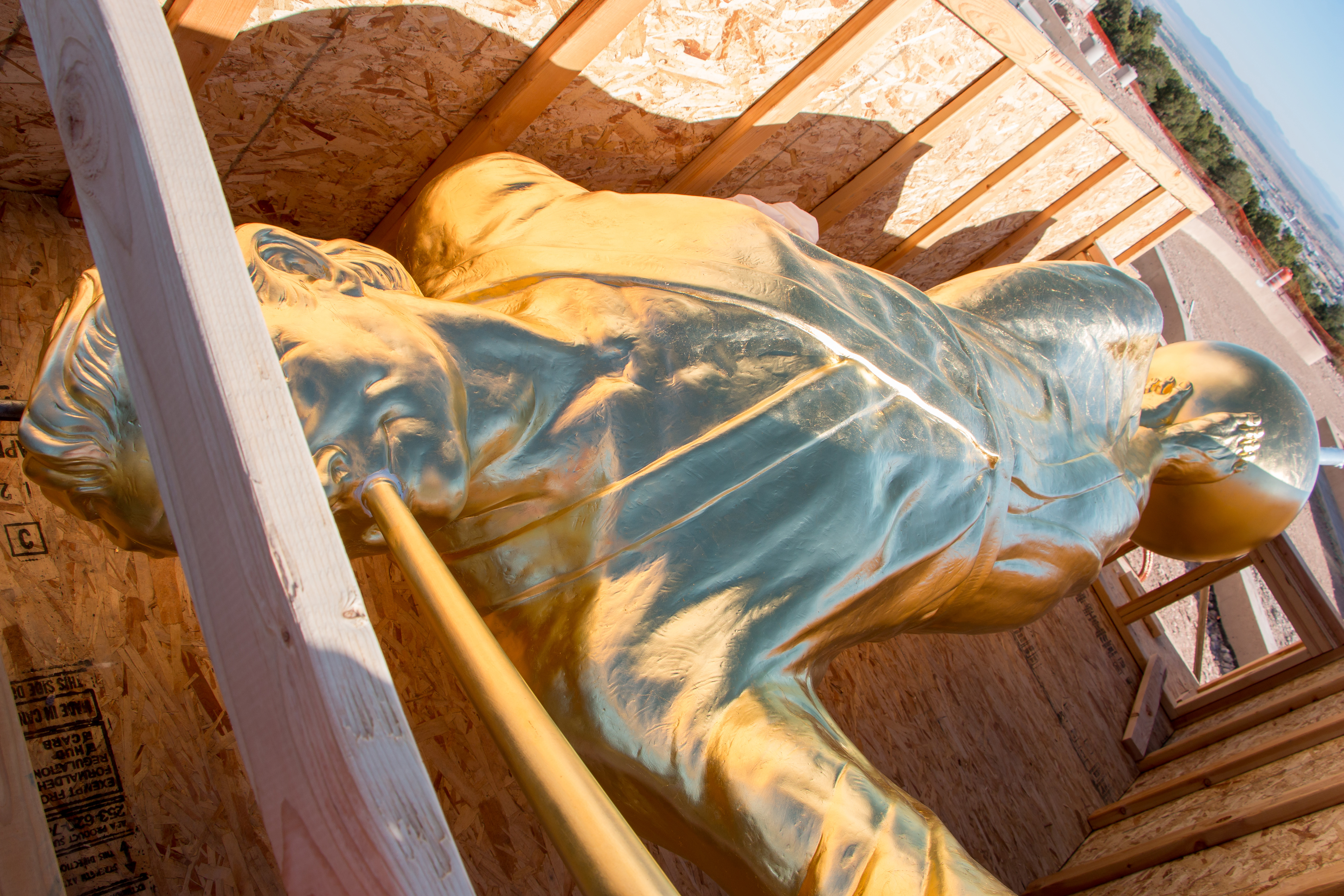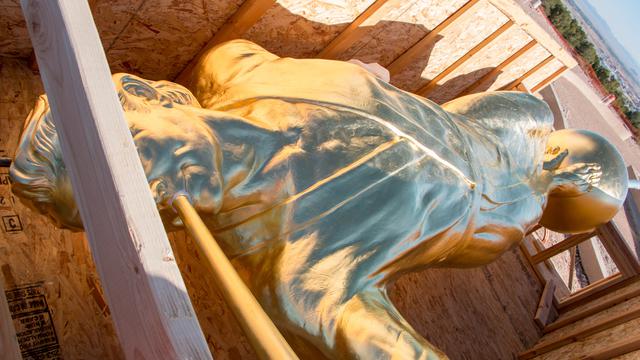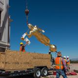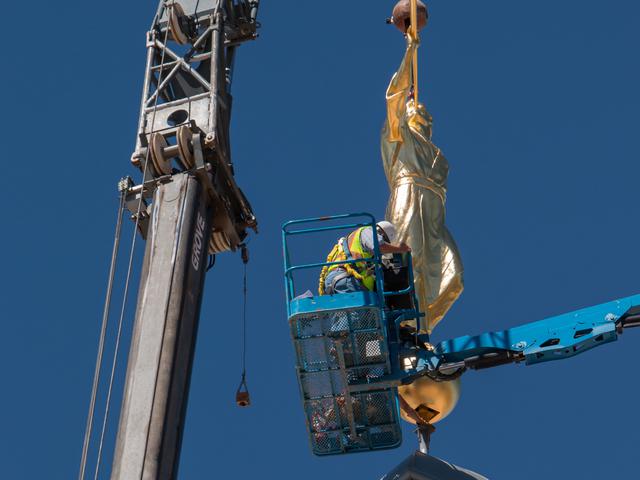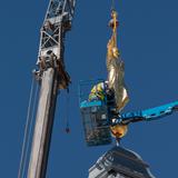 Though there was no formal announcement of the statue’s placement, Latter-day Saints and neighbors to the new temple gathered to watch the process from uncrating the statue to lifting it high into the air; workers guided the gold-plated figure onto the top of the temple.
