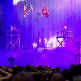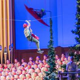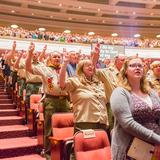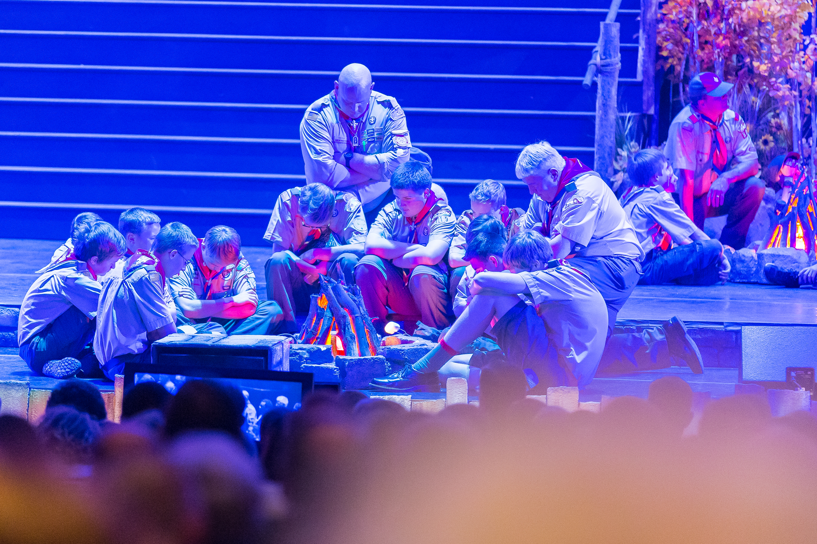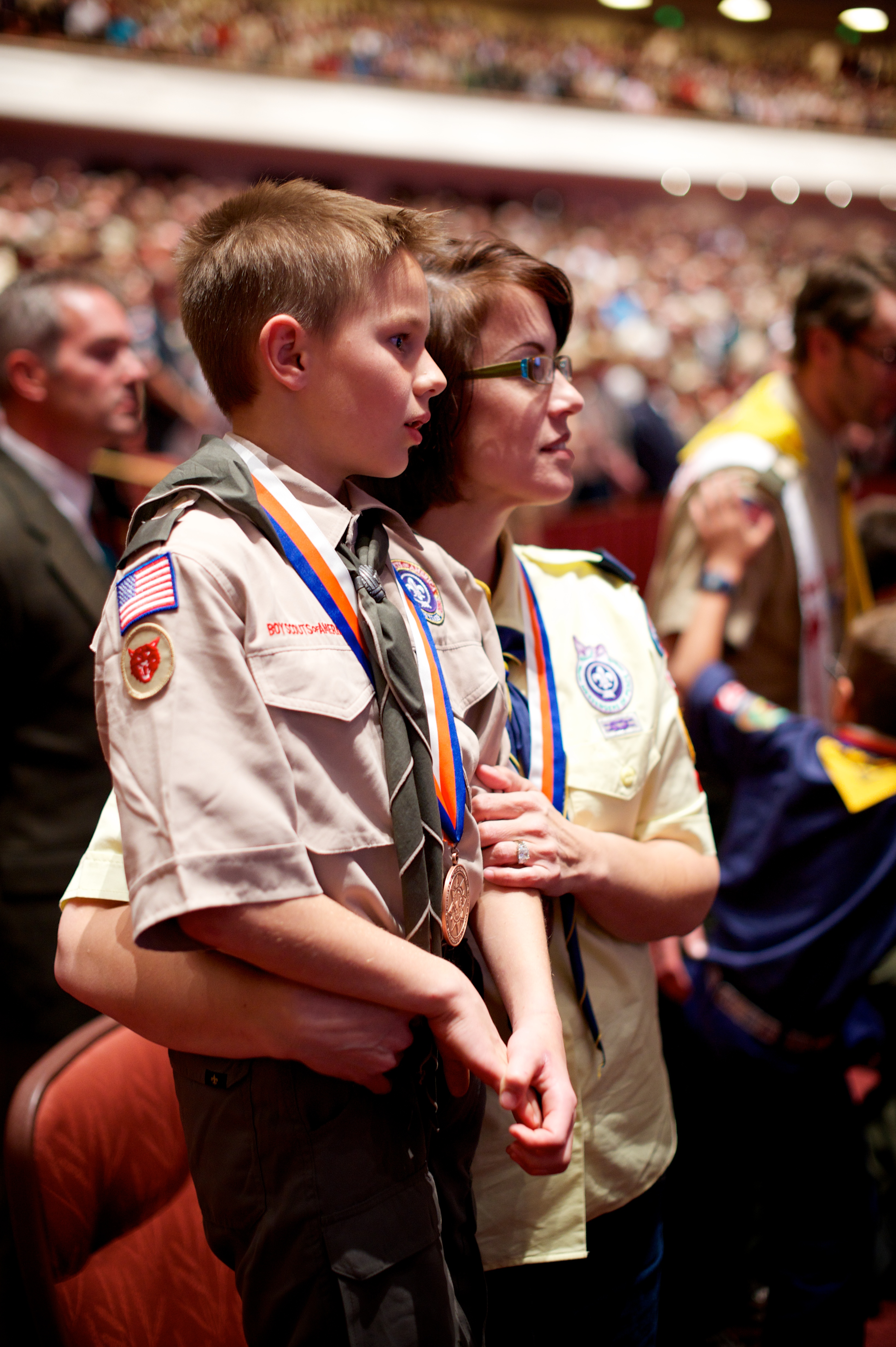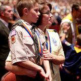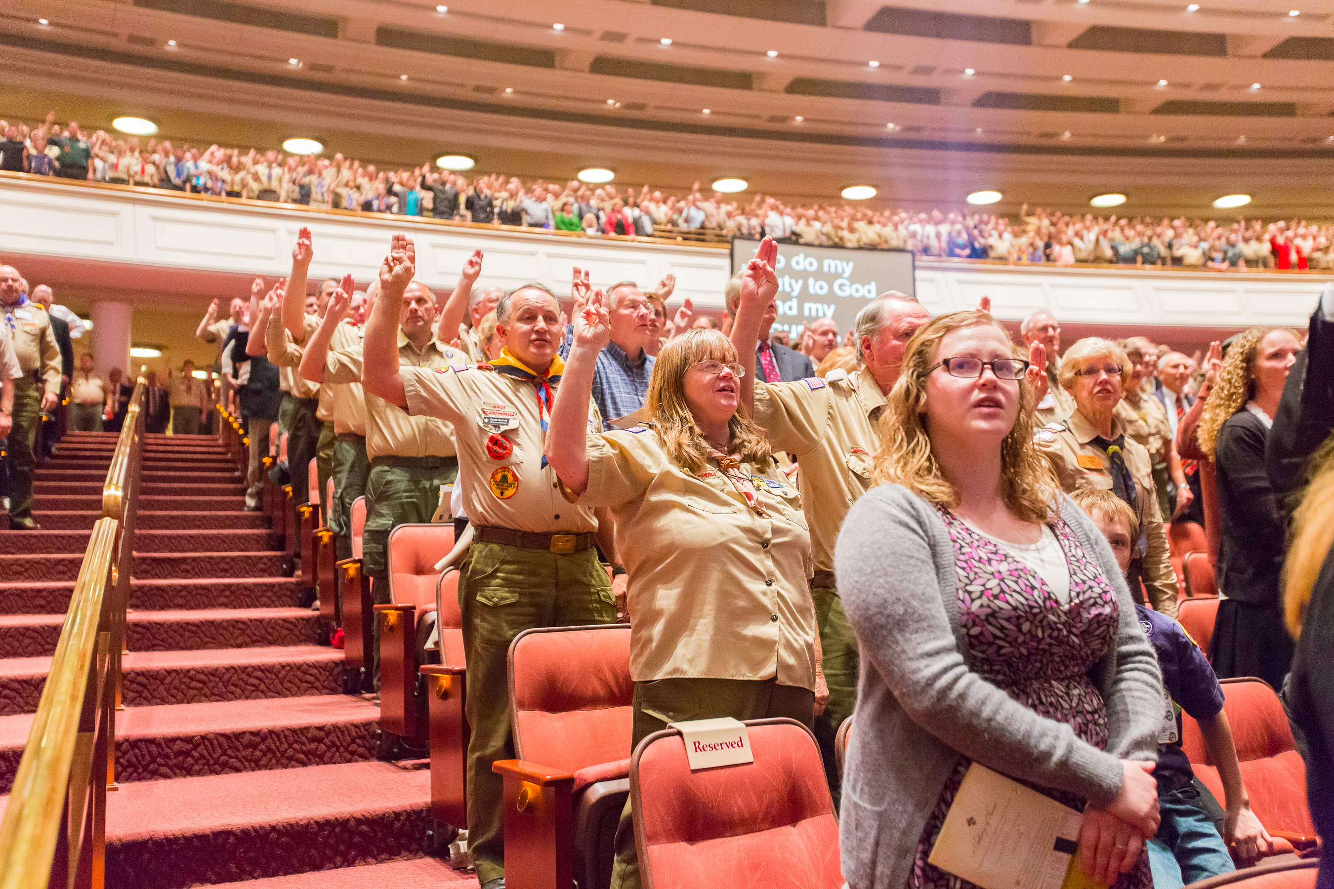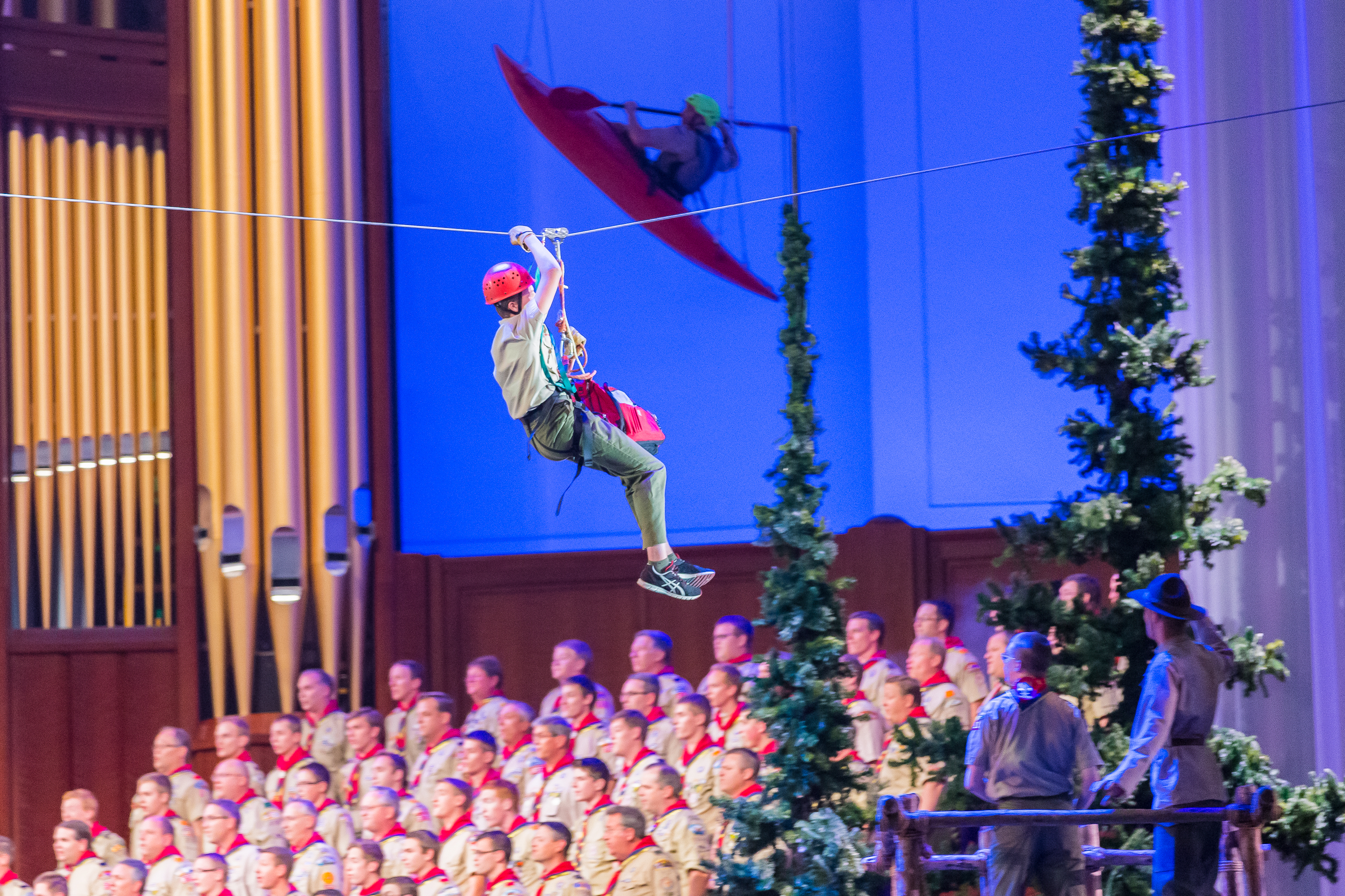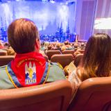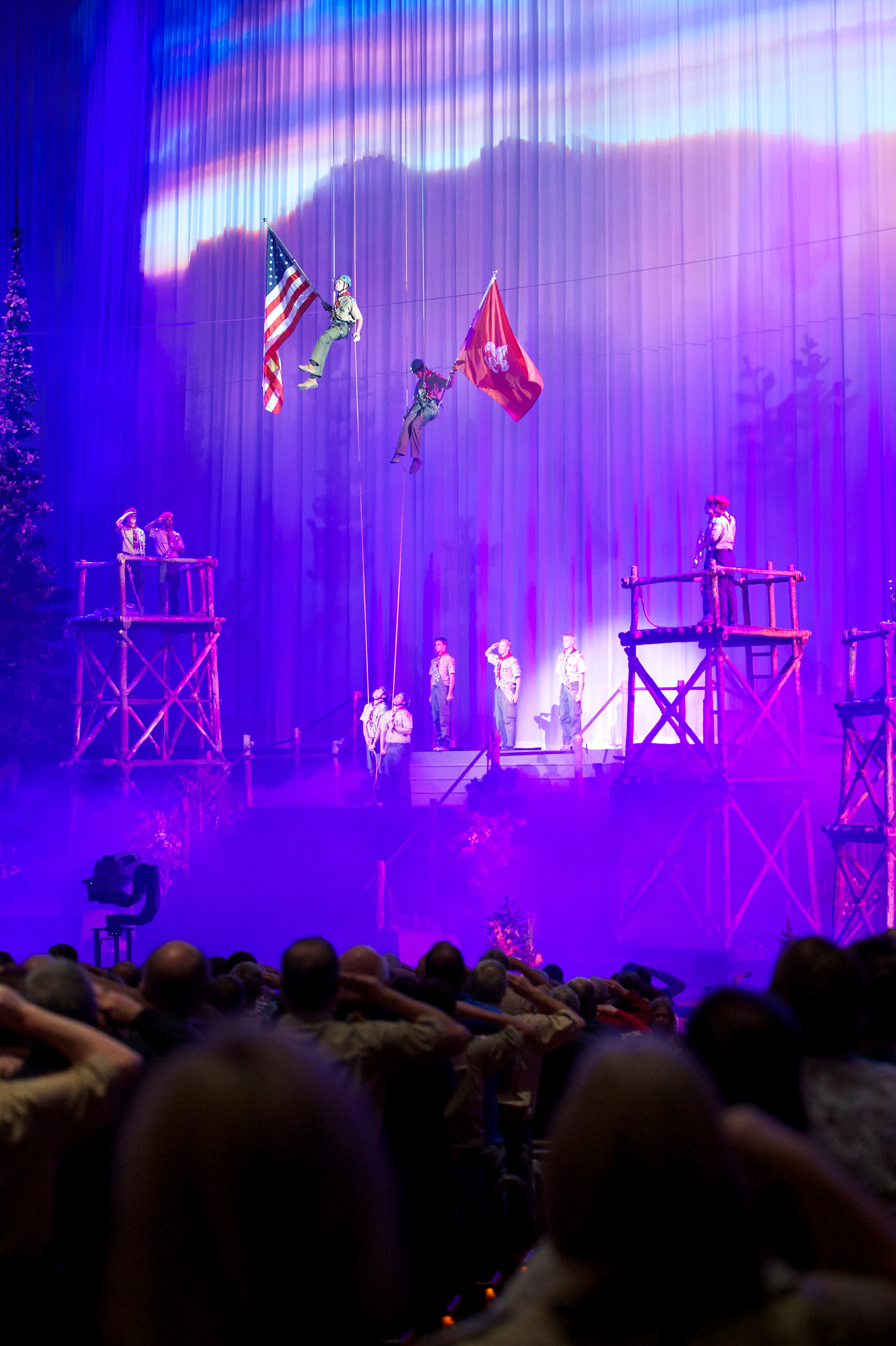 The 90-minute program started off with two Boy Scouts rappelling from the rafters down to the stage carrying the American and Boy Scout flags. Trumpeters, located throughout the Conference Center, sounded the call to attention, a choir of Cub Scouts sang the national anthem and a Scout led the audience in the Pledge of Allegiance.