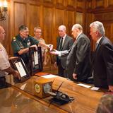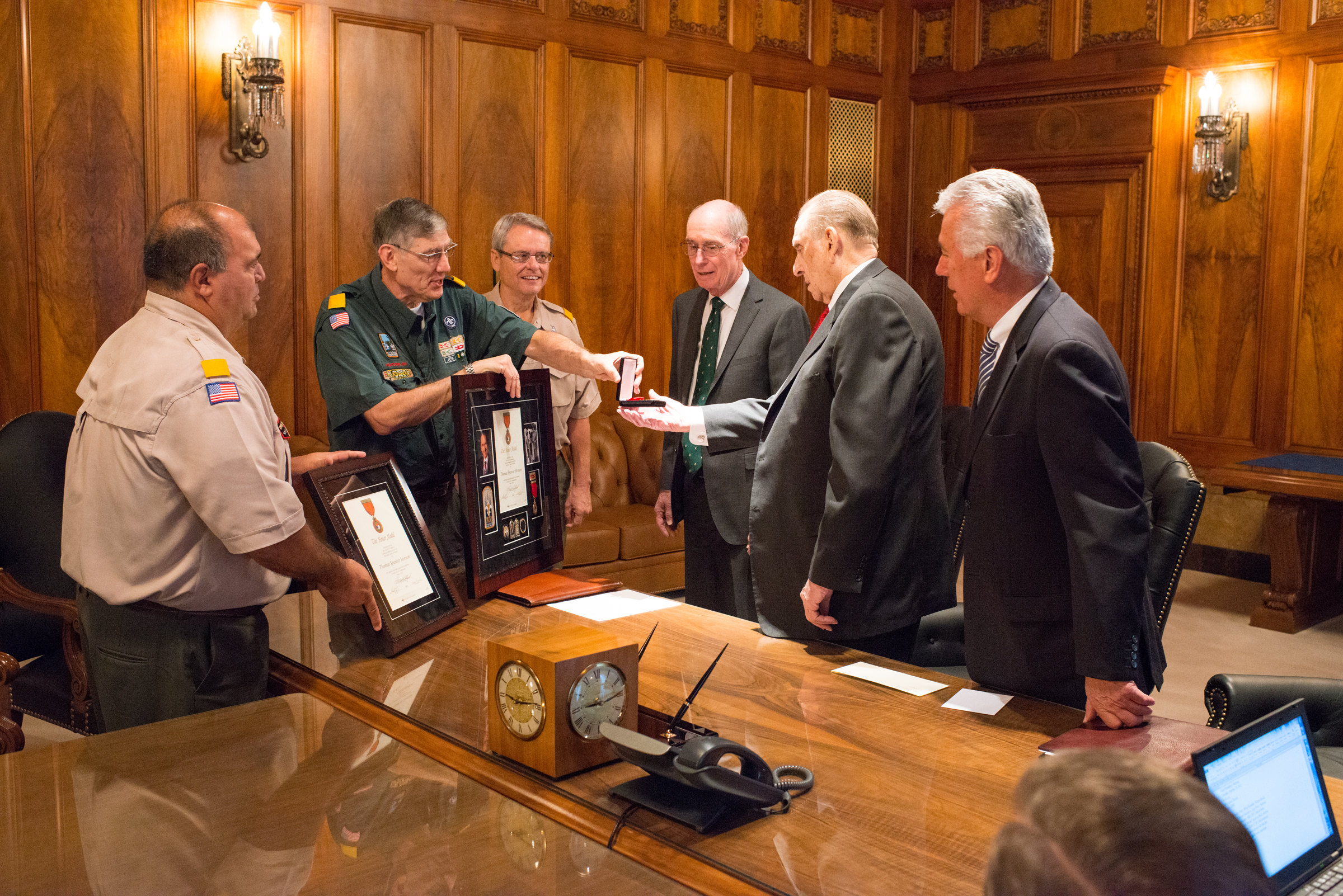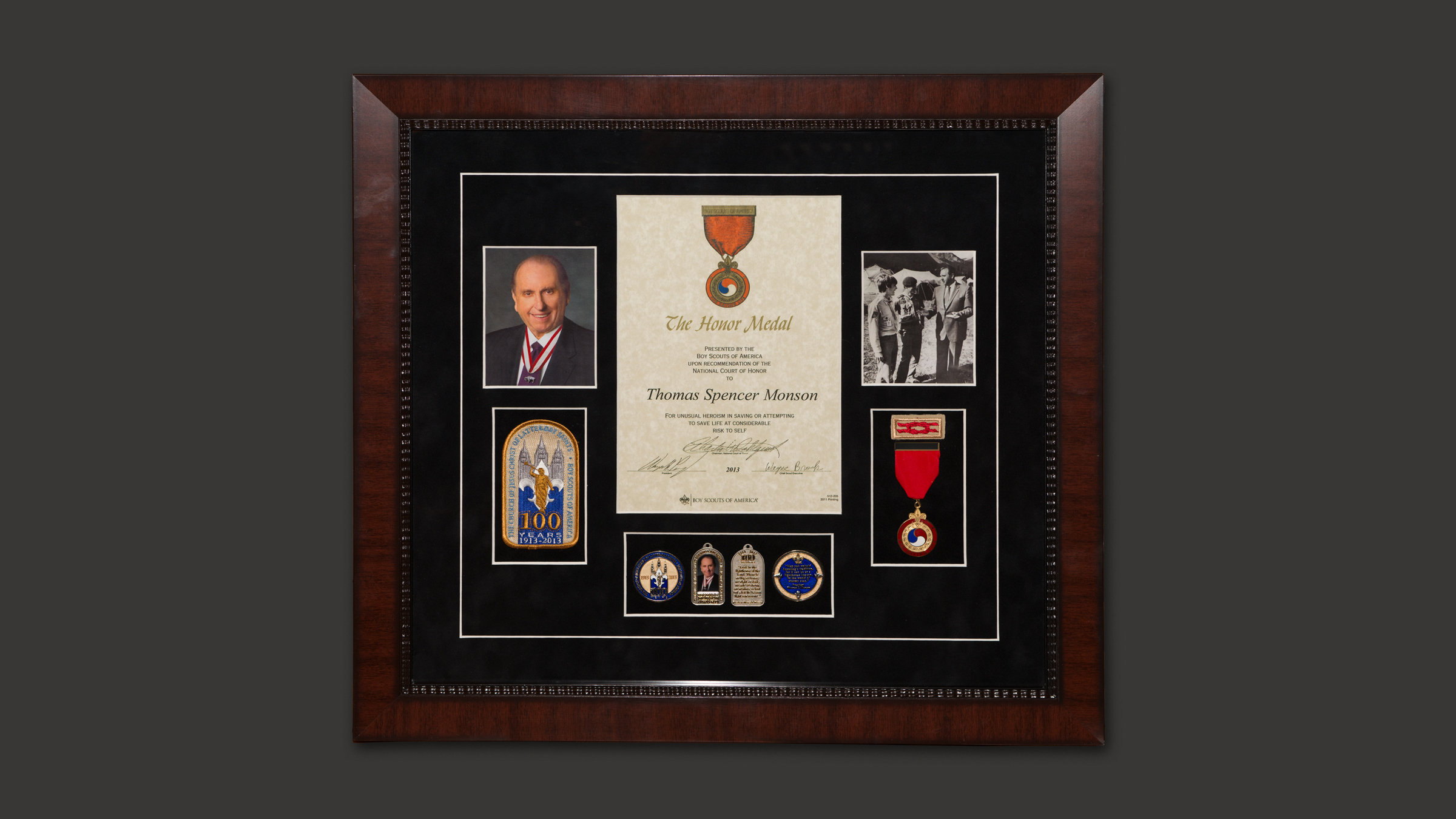 Earlier in the day, national Scouting executives presented President Monson with the Honor Medal. The award reads, “For unusual heroism in saving or attempting to save life at considerable risk to self.” He was recognized for saving a girl from drowning in a river when he was 12 years old.