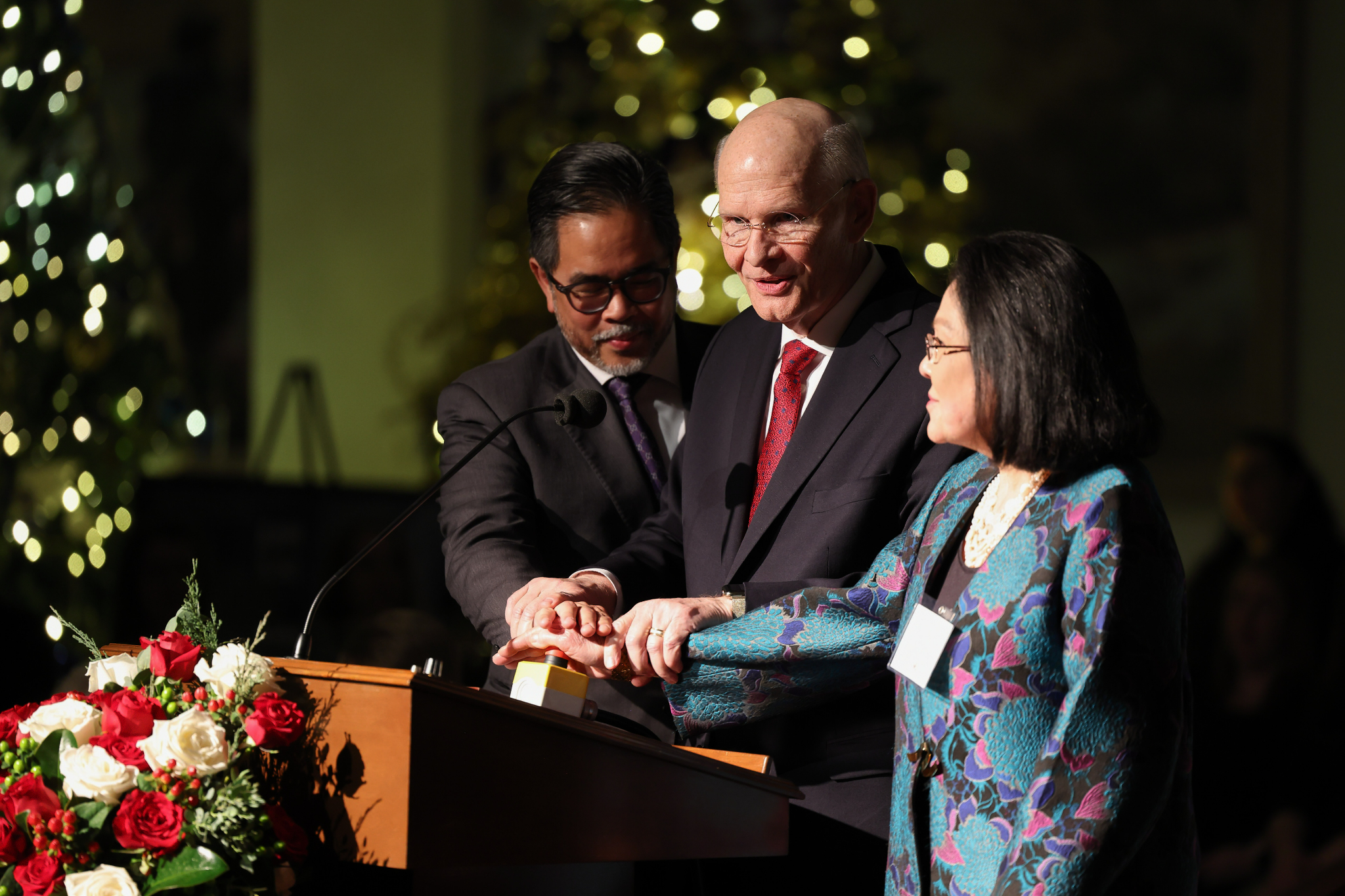The 2023 Washington D.C. Temple Festival of Lights is officially underway. Elder Dale G. Renlund of the Quorum of the Twelve Apostles was joined by the Philippines Embassy Deputy Chief of Mission Mr. Jaime Ramon T. Ascalon, Jr., and Mrs. Maria Lourdes M. Romualdez, wife of Jose Manuel G. Romauldez, Philippine ambassador to the United States, on Tuesday, November 28, 2023, to turn on more than 400,000 Christmas lights that surround the house of the Lord in the nation’s capital. Attendees included distinguished ambassadors, diplomats, and other government officials and their families.