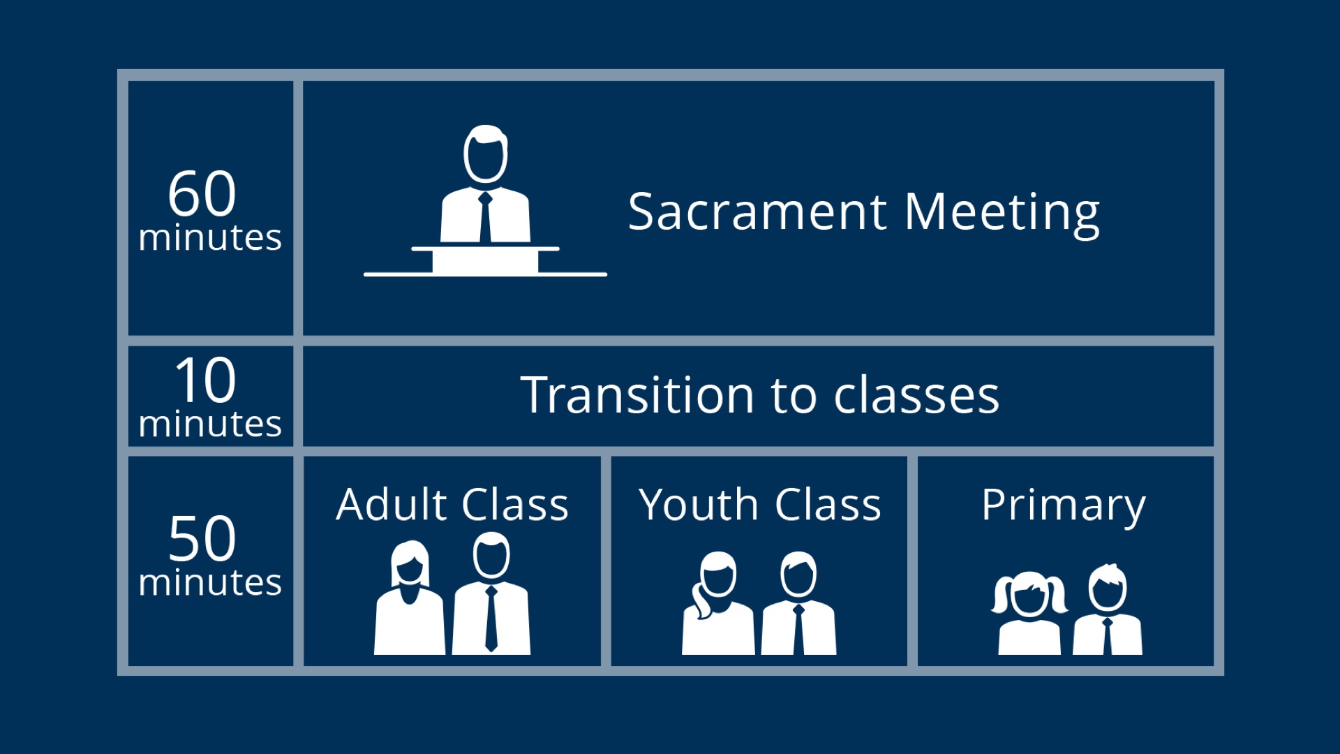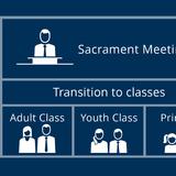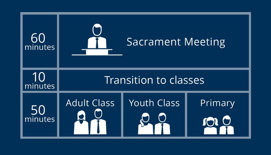 “The Sunday meeting schedule will be adjusted in the following ways, beginning in January 2019,” Elder Cook said. “The Sunday Church meetings will consist of a 60-minute sacrament meeting each Sunday, focused on the Savior, the ordinance of the sacrament, and spiritual messages. After time for transition to classes, Church members will attend a 50-minute class that will alternate each Sunday. Sunday School will be held on the first and third Sundays. Priesthood quorums, Relief Society, and Young Women meetings will be held on the second and fourth Sundays. Meetings on the fifth Sunday will be under the direction of the bishop. Primary will be held each week during this same 50-minute period and will include singing time and classes.”