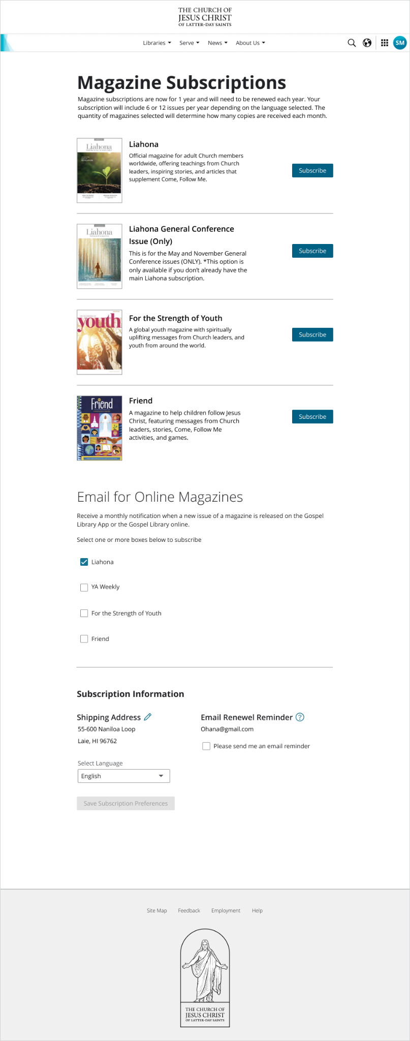 Manage subscriptions to print magazines at MagazineSubscriptions.ChurchofJesusChrist.org. Select which magazine is wanted and fill out additional information as needed. Screenshot from magazine subscriptions web page.2023 by Intellectual Reserve, Inc. All rights reserved.An adult member of a household may manage subscriptions at MagazineSubscriptions.ChurchofJesusChrist.org; sign in using a Church account. Anyone who doesn’t have a Church account may sign up for one at no cost at account.ChurchofJesusChrist.org.