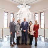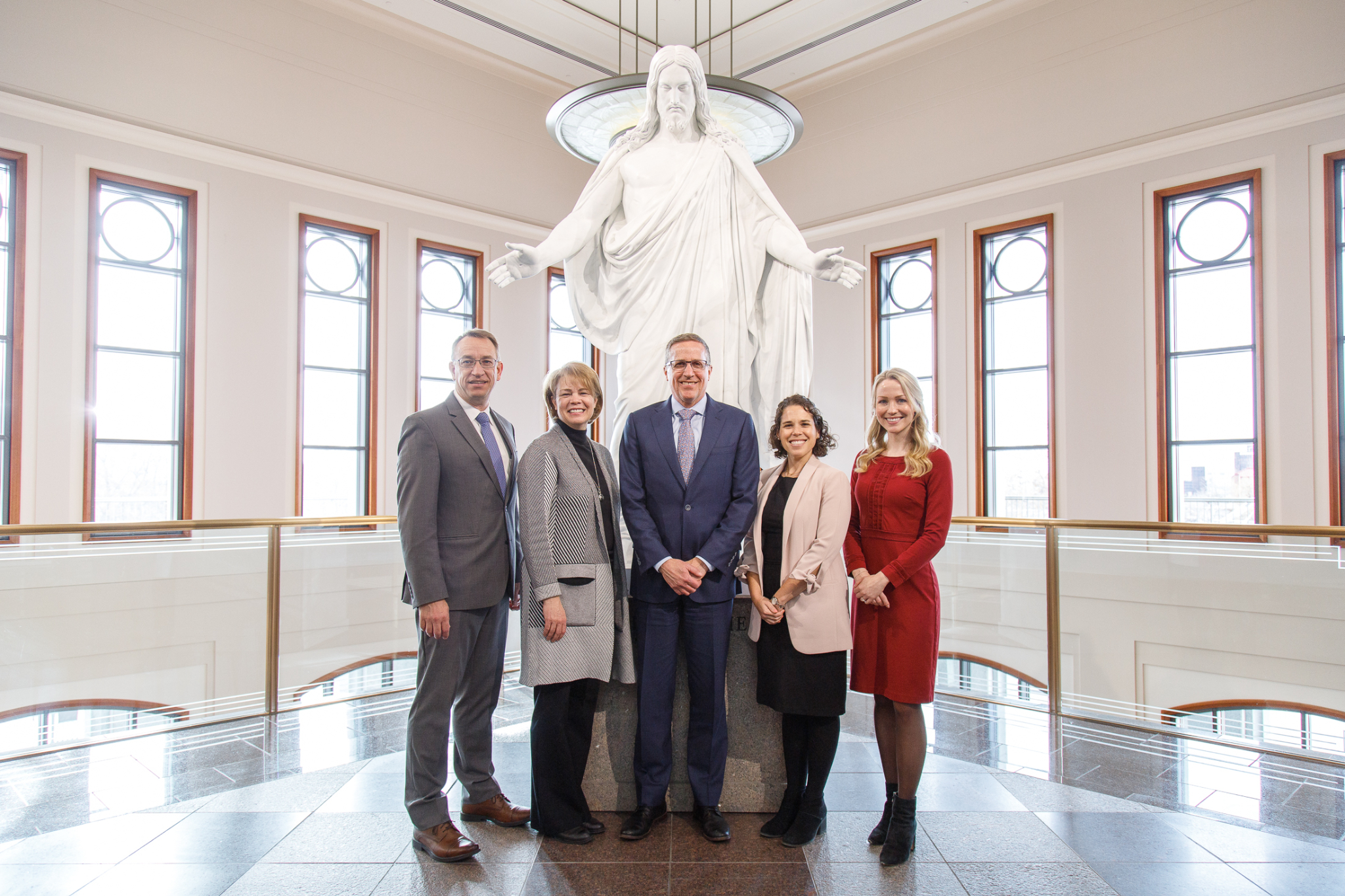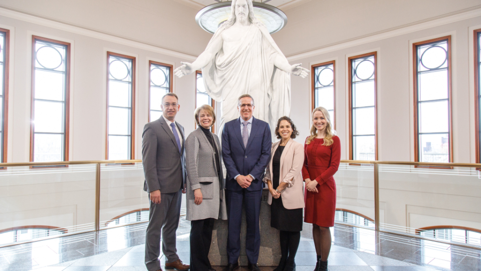 UNICEF USA leaders stand with Church humanitarian representatives in front of a Christus statue on display in the Church's Conference Center in Salt Lake City, Utah, on Thursday, January 12, 2023. Pictured from left to right: Robert Hokanson, senior manager, Humanitarian Services; Sharon Eubank, director, Humanitarian Services; Michael Nyenhuis, president and CEO of UNICEF USA; Rachel Steinberg, managing director, UNICEF USA; and Sarah Callaway, assistant director, UNICEF USA. 2023 by Intellectual Reserve, Inc. All rights reserved.“I saw the Church today really living into their mission that Jesus gave to be His hands and feet in their own communities and then around the world,” Nyenhuis concluded.