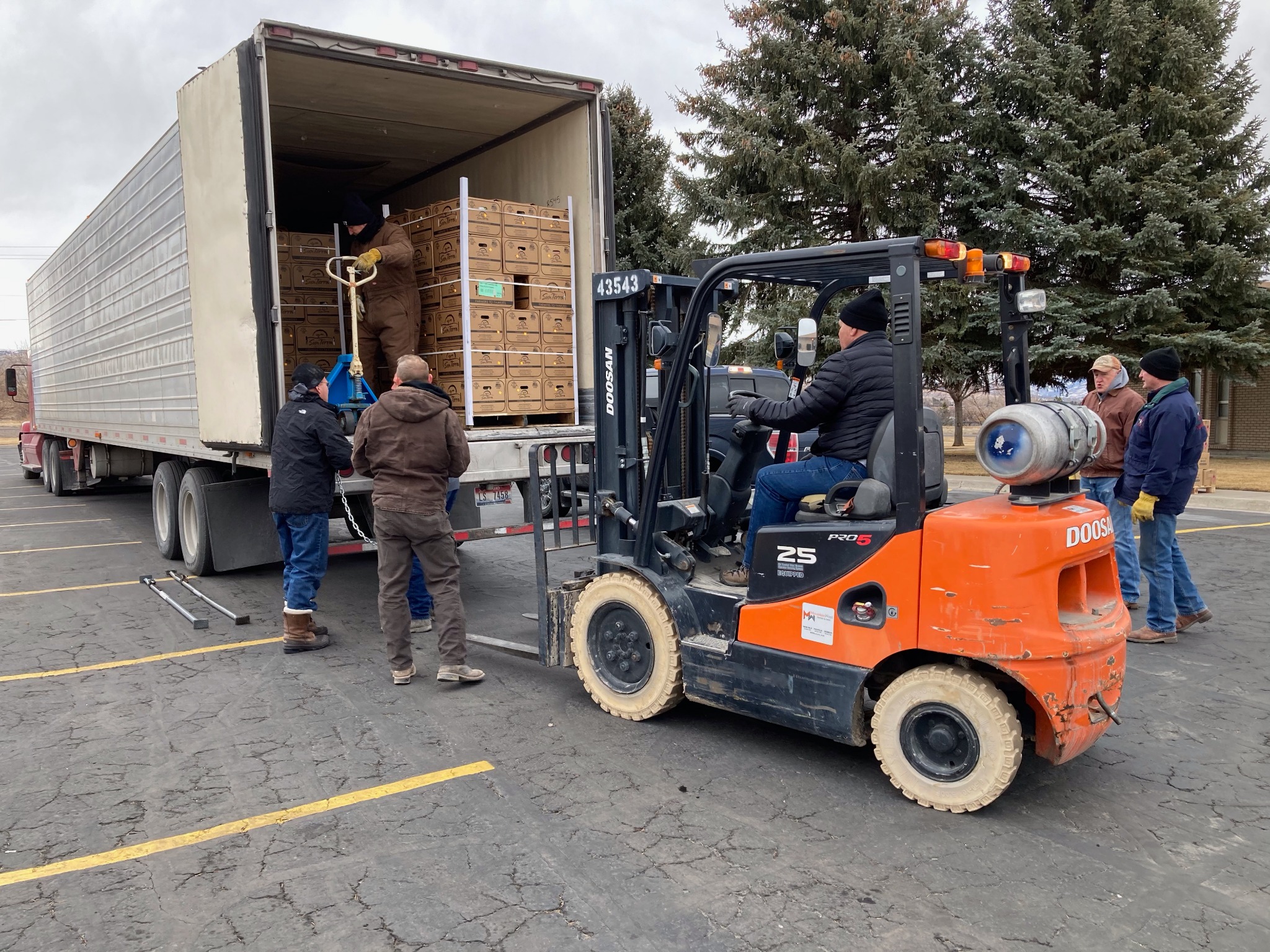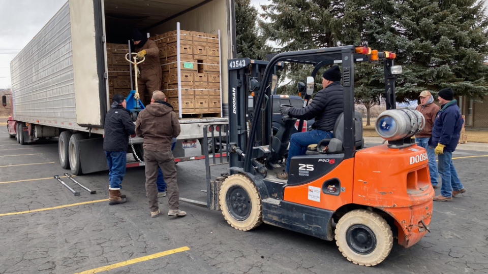 A truck delivered 40,000 pounds of food to a Church meetinghouse on the Fort Hall Reservation in southeastern Idaho on Monday, February 1, 2021. It was the third of three deliveries to the Shoshone-Bannock Tribes.