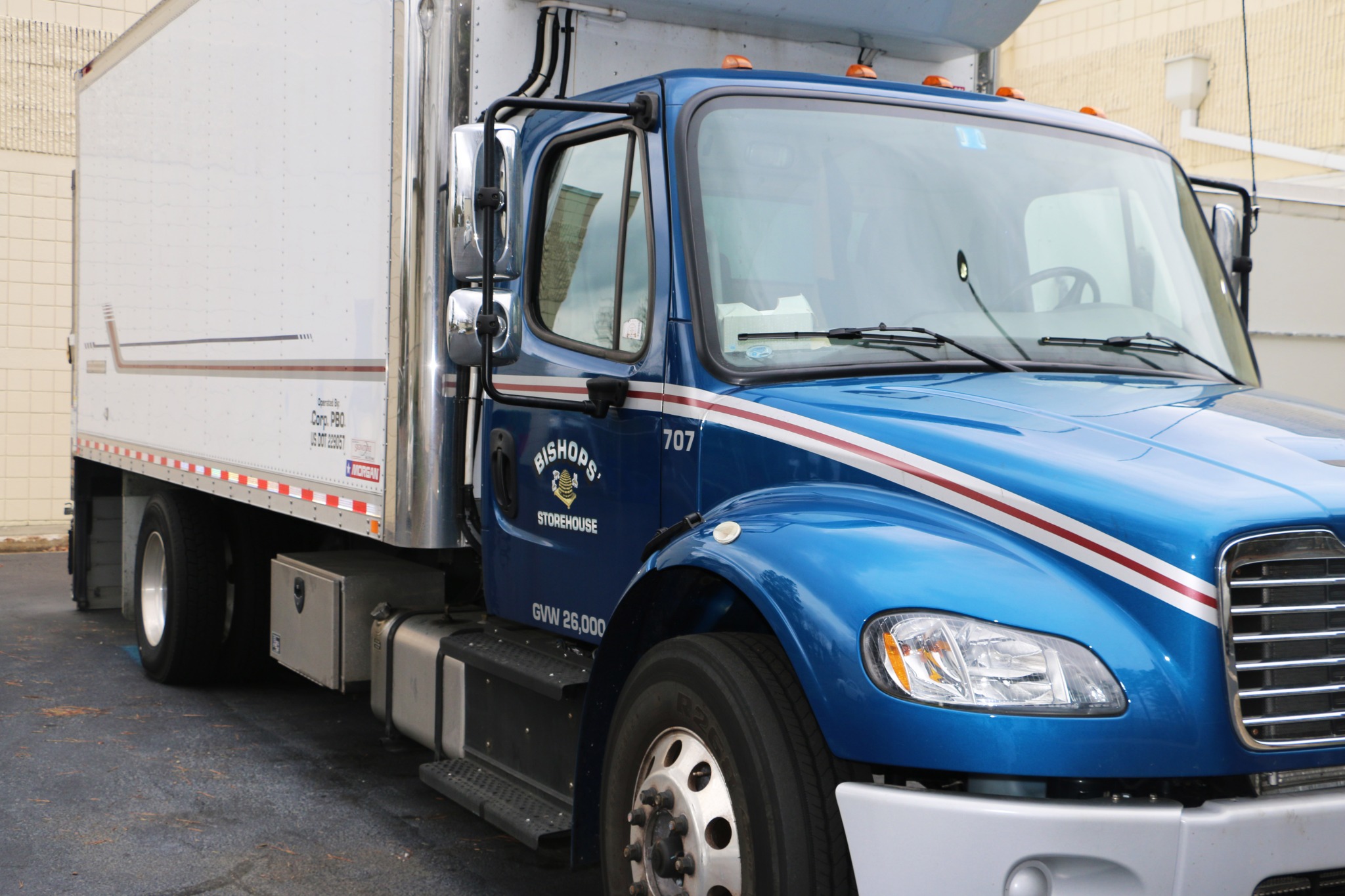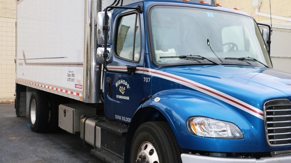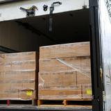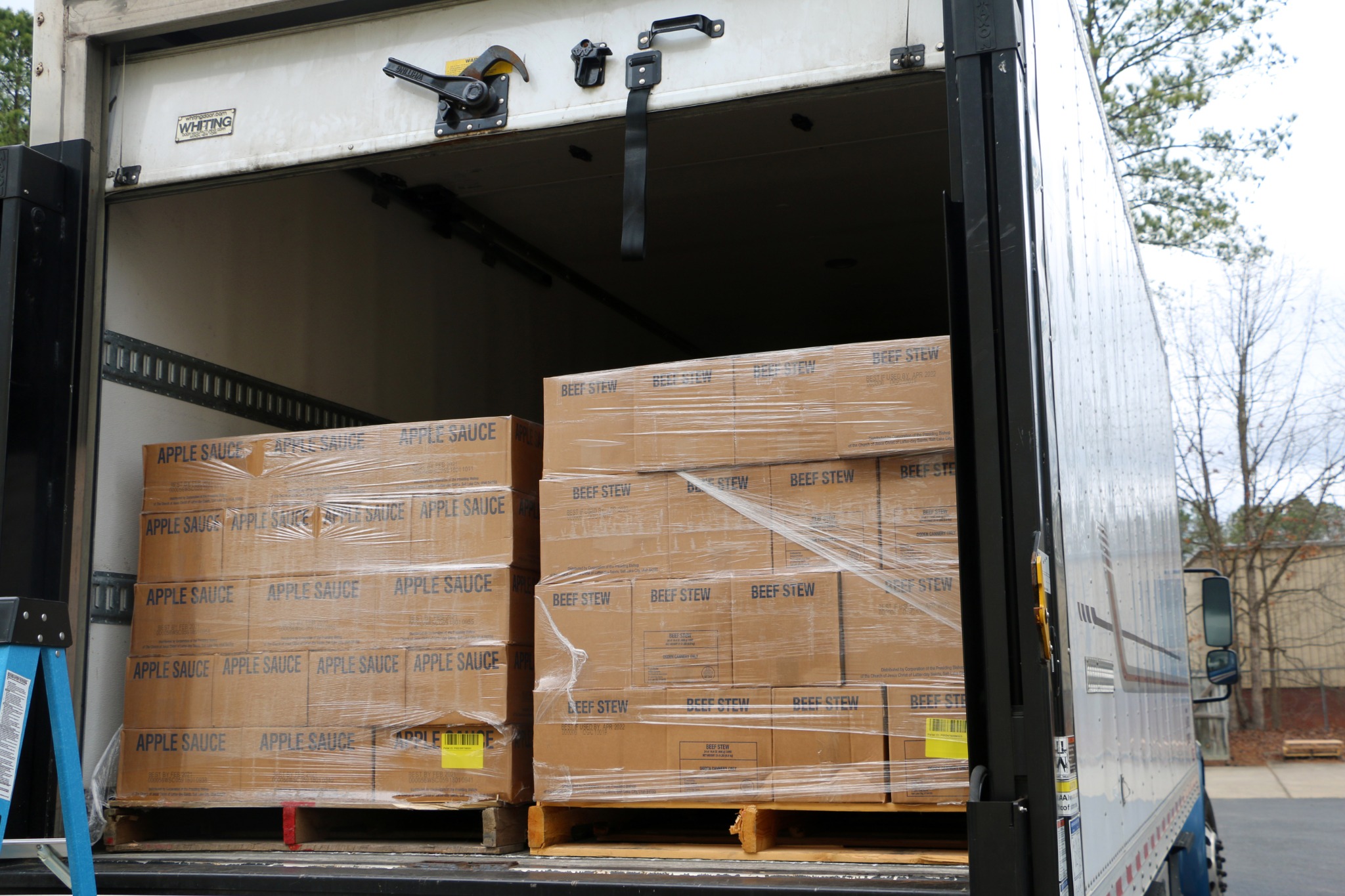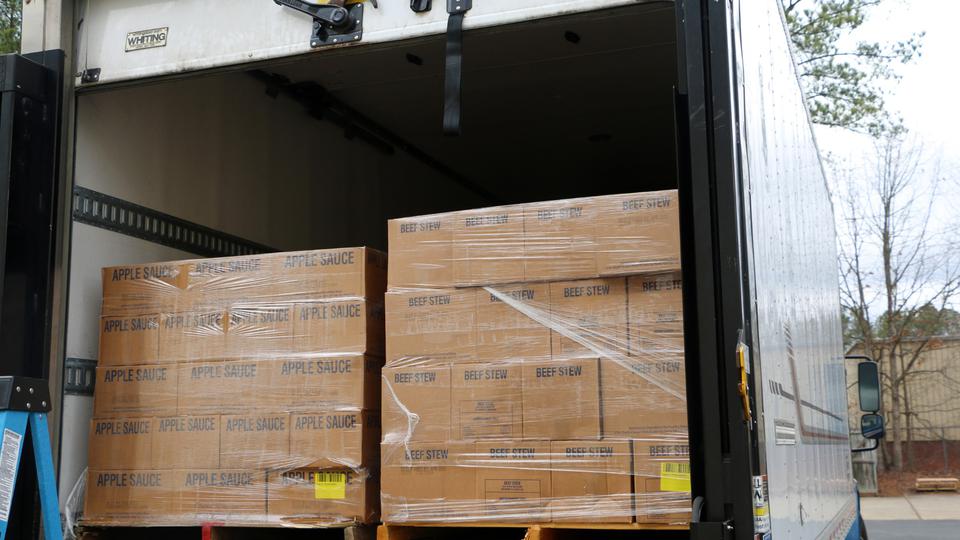 An initial delivery of eight pallets of food arrived by truck. The remaining food will be delivered to the food pantries in the coming months.