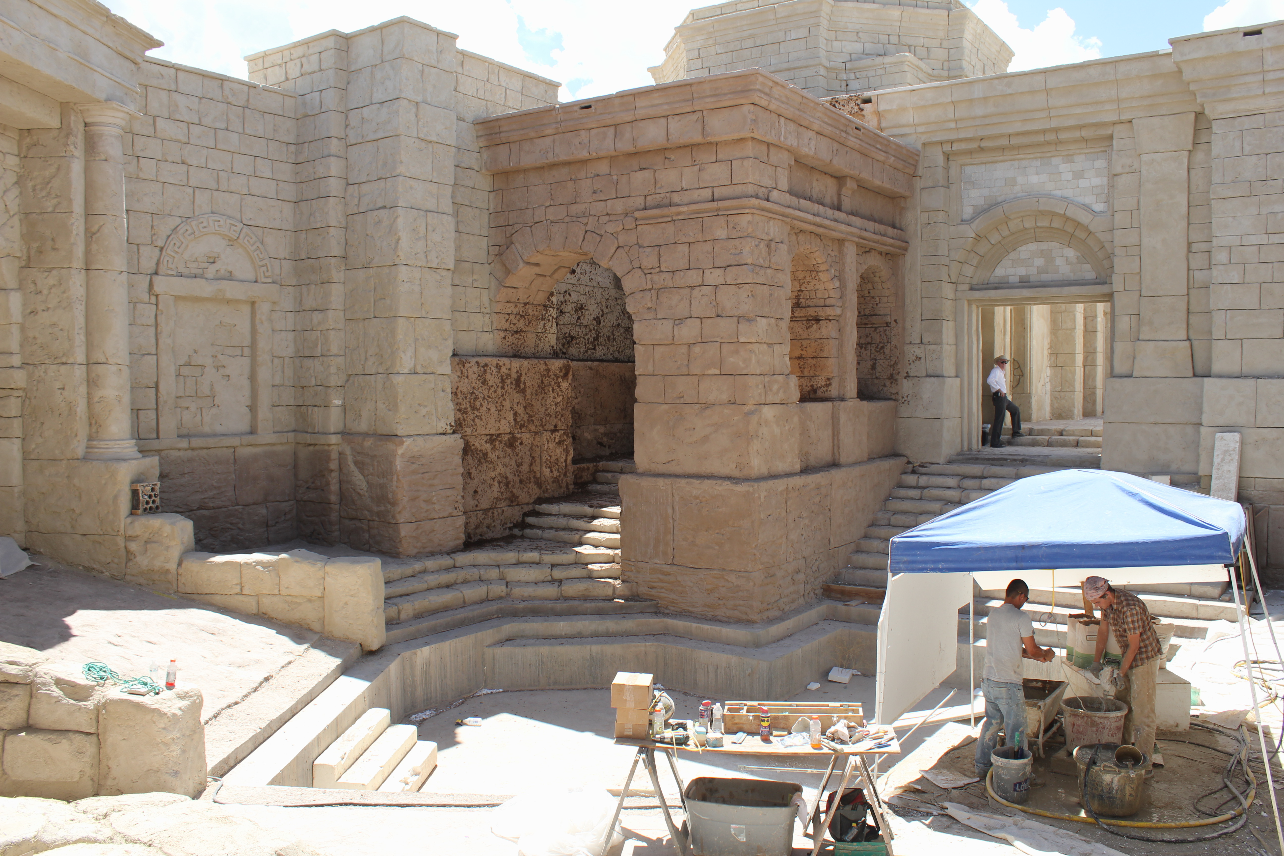 The area will be transformed by simply draining the pool and placing a cover over it. The scene where Pontius Pilate, governor of Judea, addresses a crowd just prior to allowing the Savior’s crucifixion will also be shot in the same area of the structure.