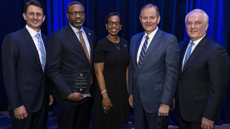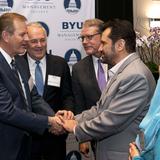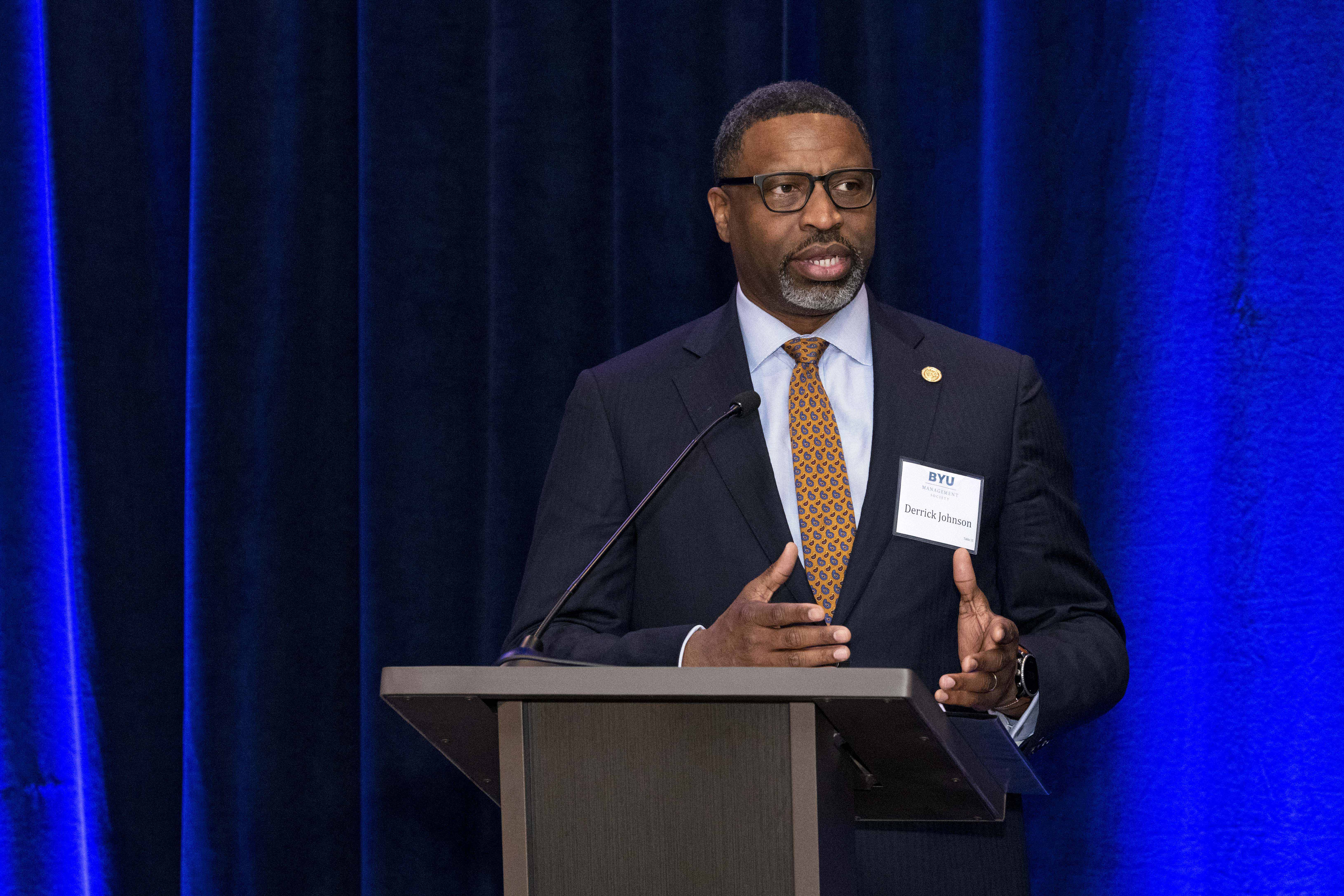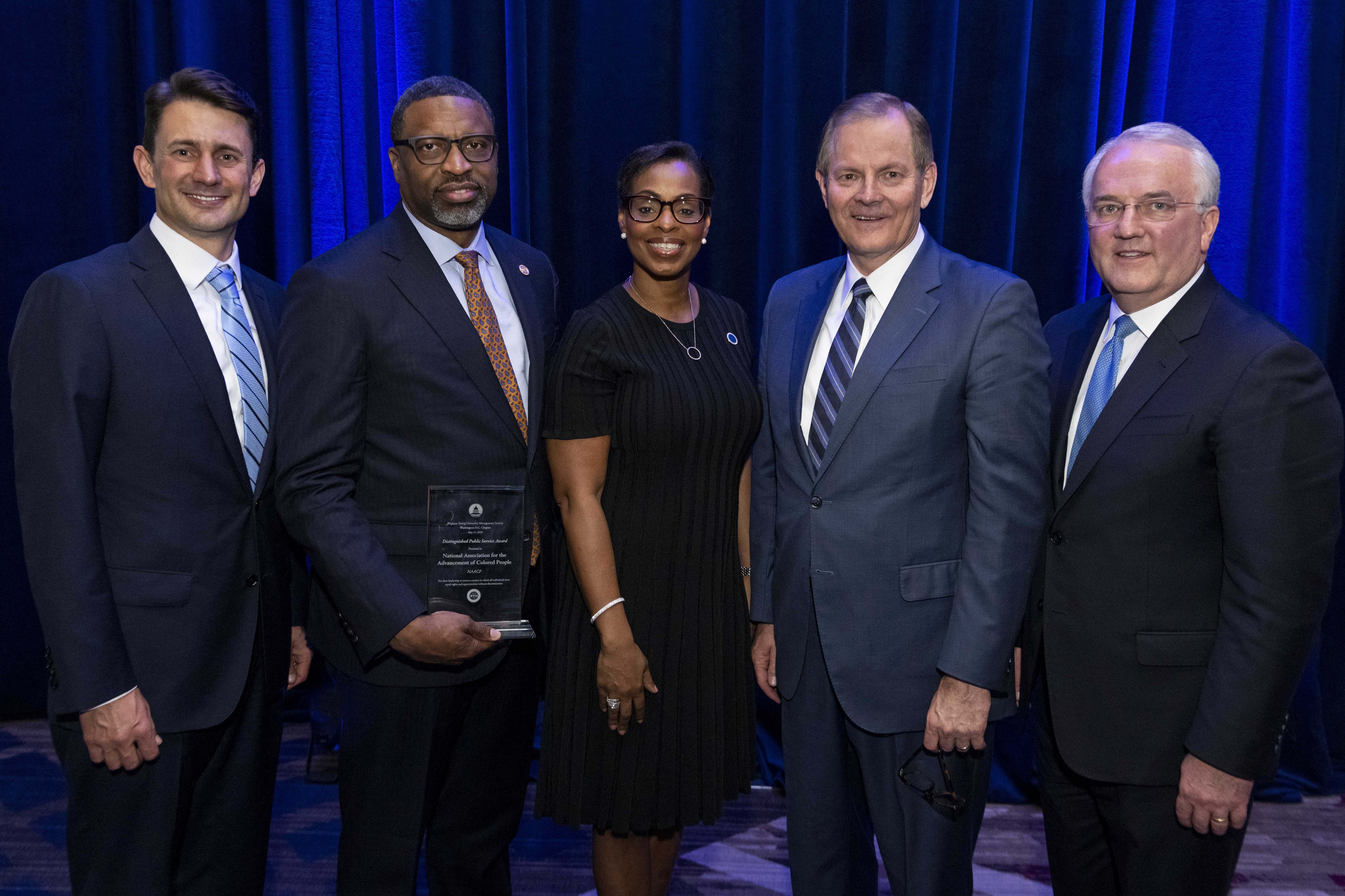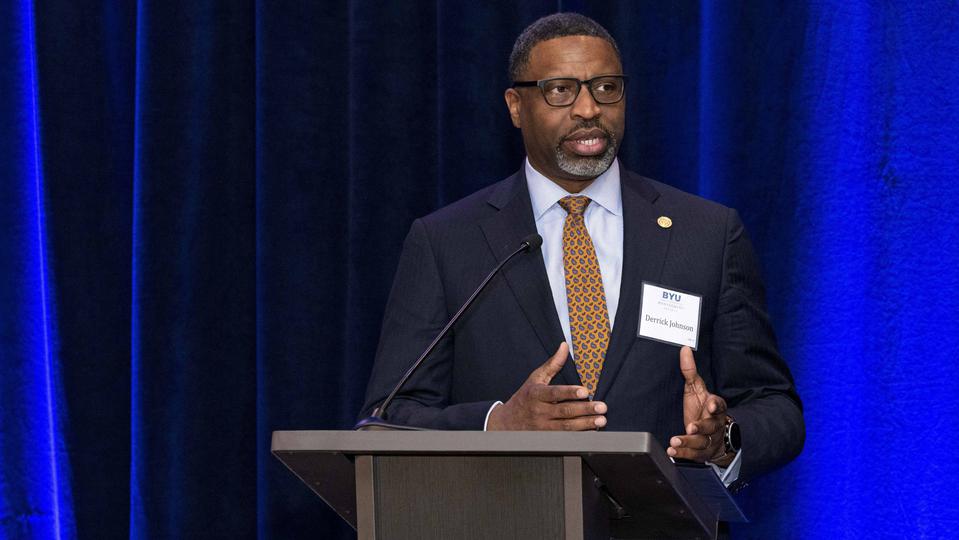 “Thank you for your friendship,” NAACP President and CEO Derrick Johnson said after receiving an award during a gala sponsored by the BYU Management Society at the Crystal Gateway Marriott hotel. “When I’m asked, ‘Why would you attend or accept an award [from] or be present with members of The Church of Jesus Christ of Latter-day Saints?’ I say, ‘Because that’s our neighbor.’”