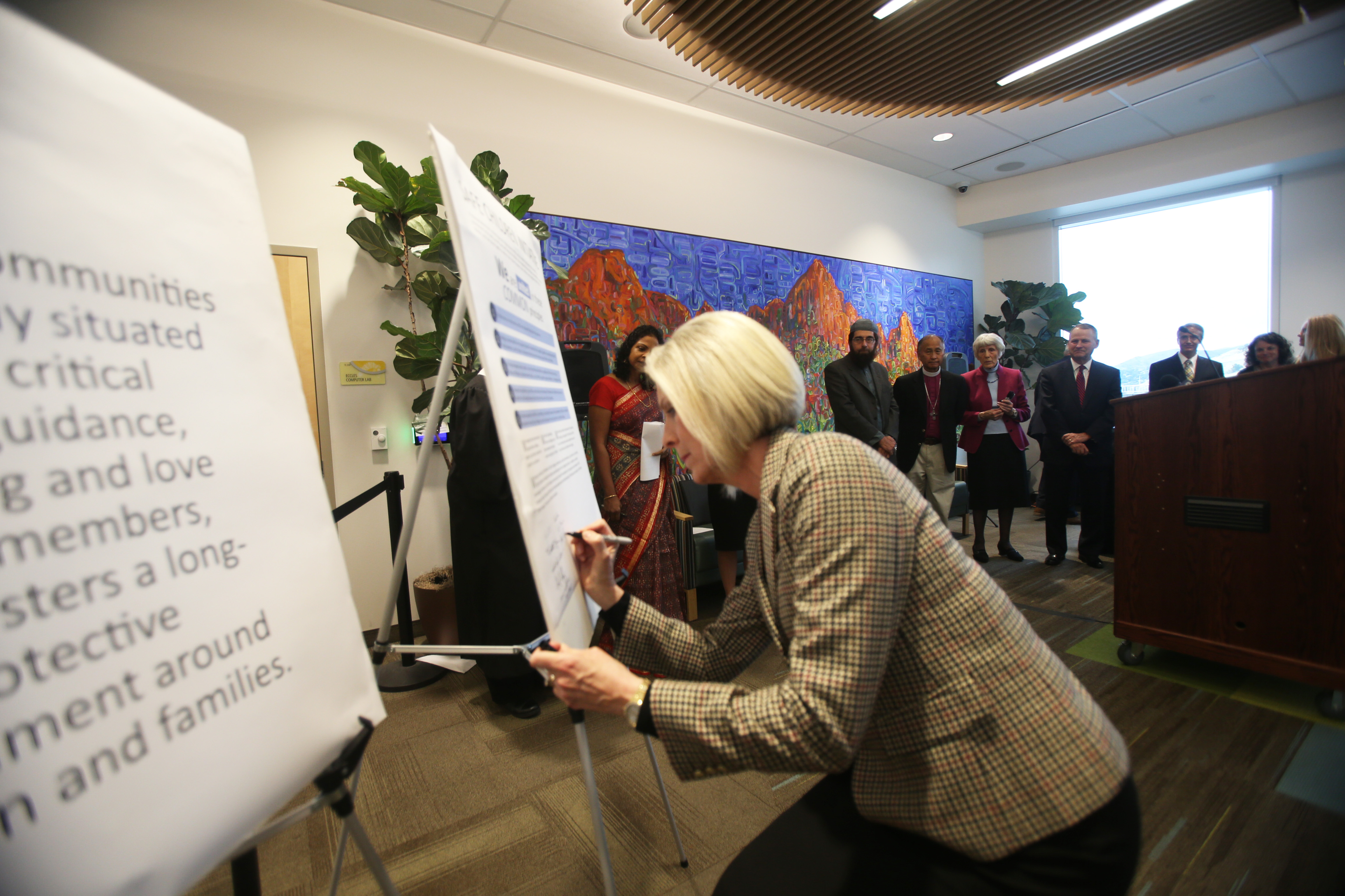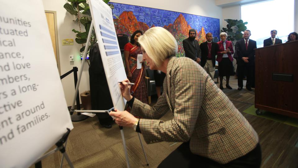 A joint statement was read and signed Wednesday morning at Primary Children’s Hospital by Elder LeGrand R. Curtis Jr. of the Seventy, Primary general president Sister Joy D. Jones, and other members of the Utah Faith Leaders Roundtable on Child Abuse Prevention.