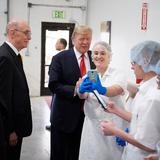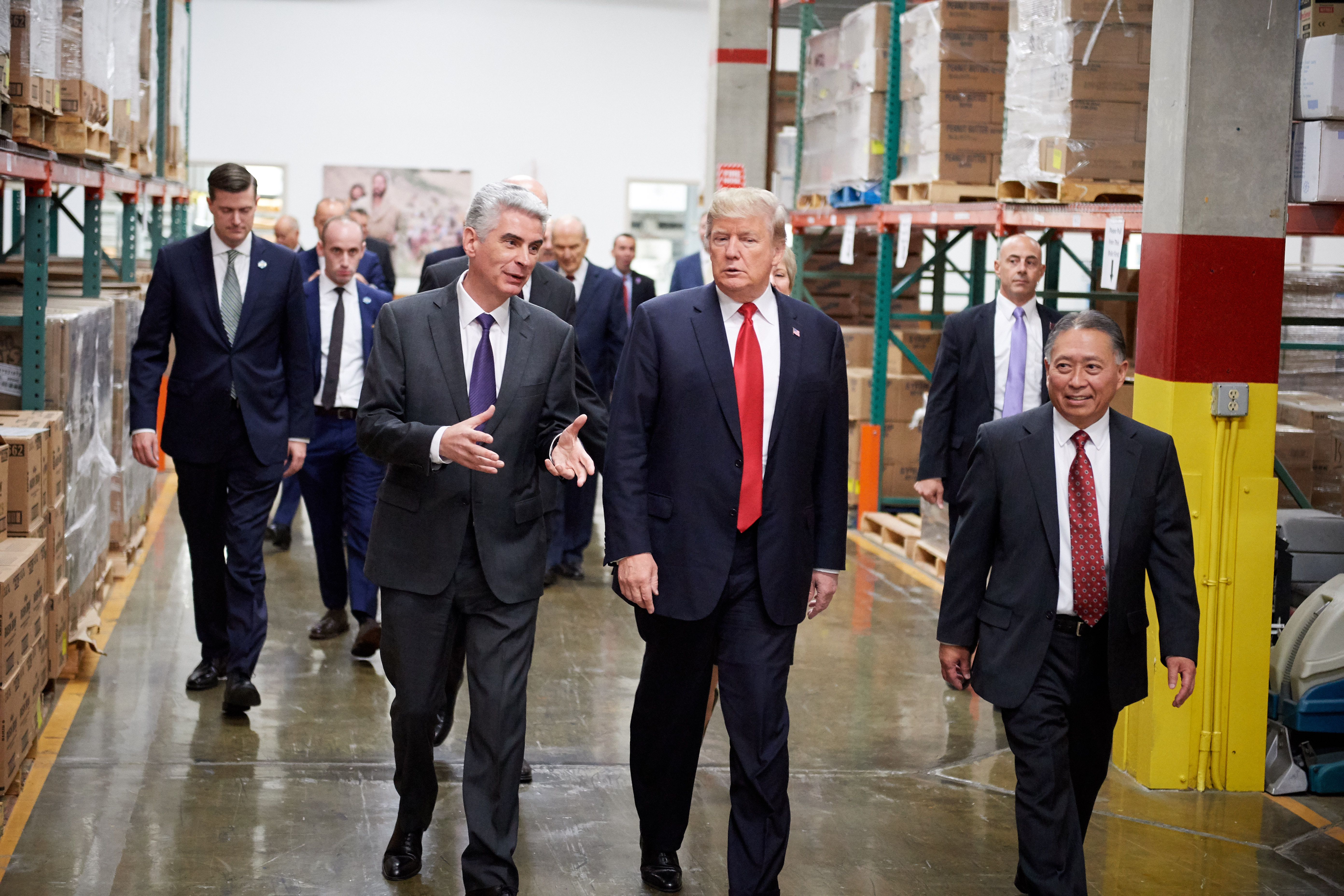 Church leaders took the president on a late-morning tour of the bishops' storehouse and Deseret Bakery, where he learned about the Church's welfare facilities and self-reliance programs, which are dedicated to serving the needy of many faiths around the world. The president was shown how a food order is filled for those in need.