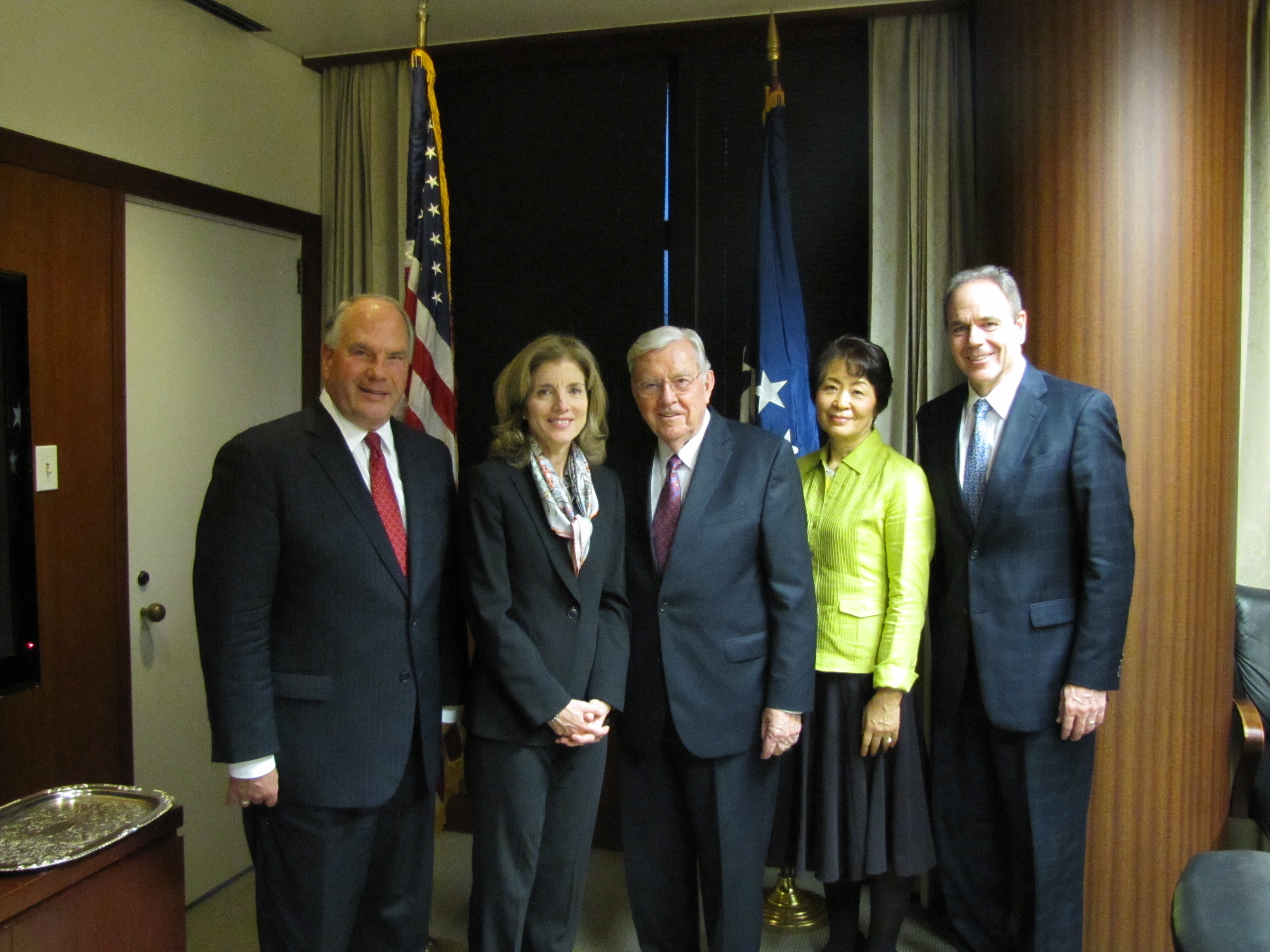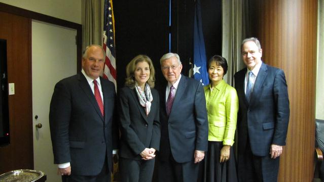 Elder M. Russell Ballard of the Quorum of the Twelve Apostles and Elder Ronald A. Rasband of the Presidency of the Seventy were accompanied by Elder Michael T. Ringwood, Asia North Area President, and Sister Mitsue Jensen, the Tokyo Shibuya Ward Relief Society president. They visited with Ambassador Kennedy, the first female U.S. ambassador to Japan, on February 23, 2015. She is also the daughter of President John F. Kennedy, the 35th president of the United States.