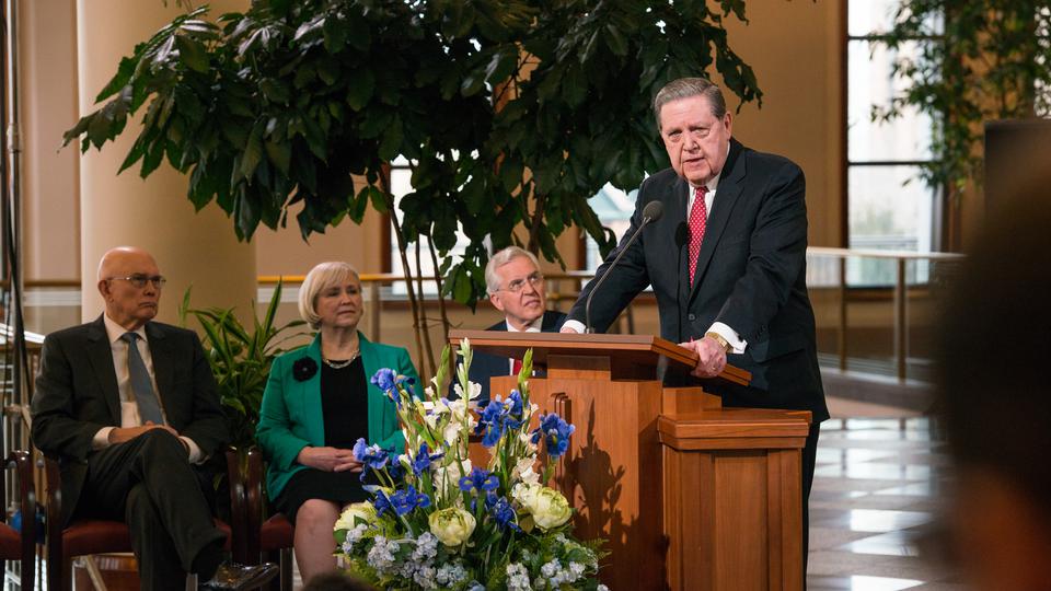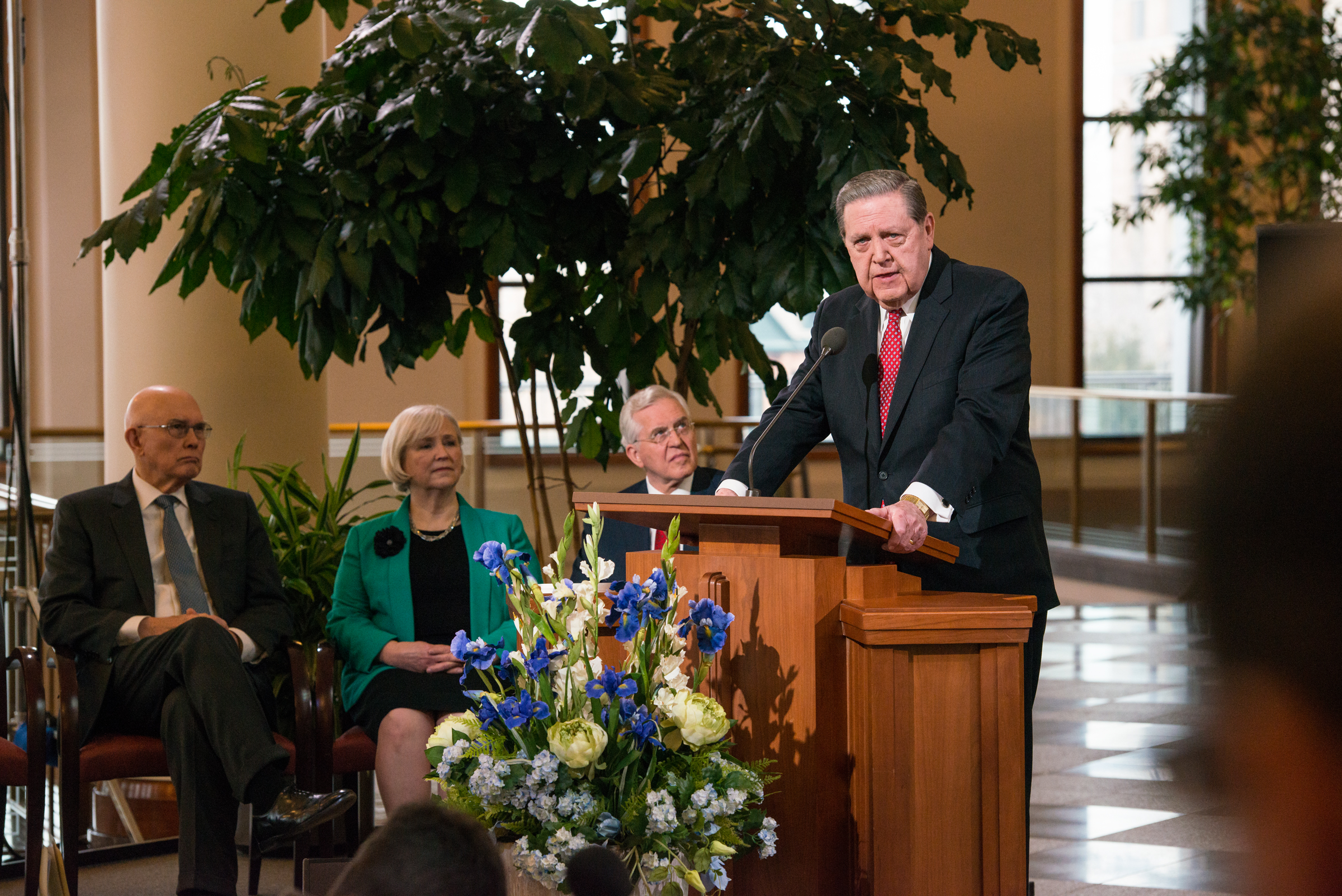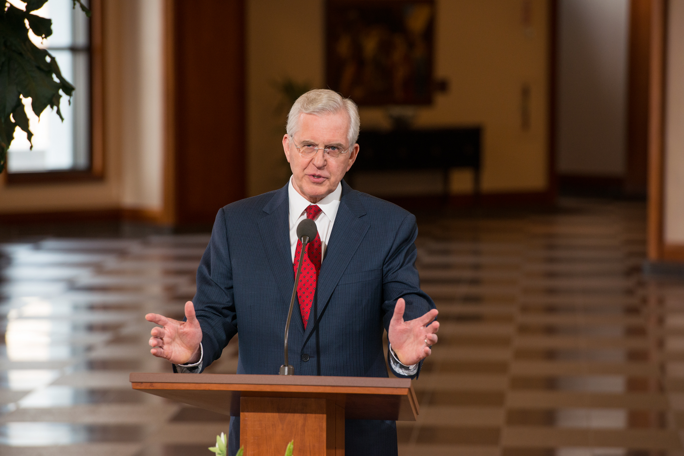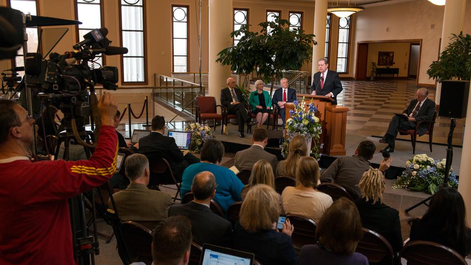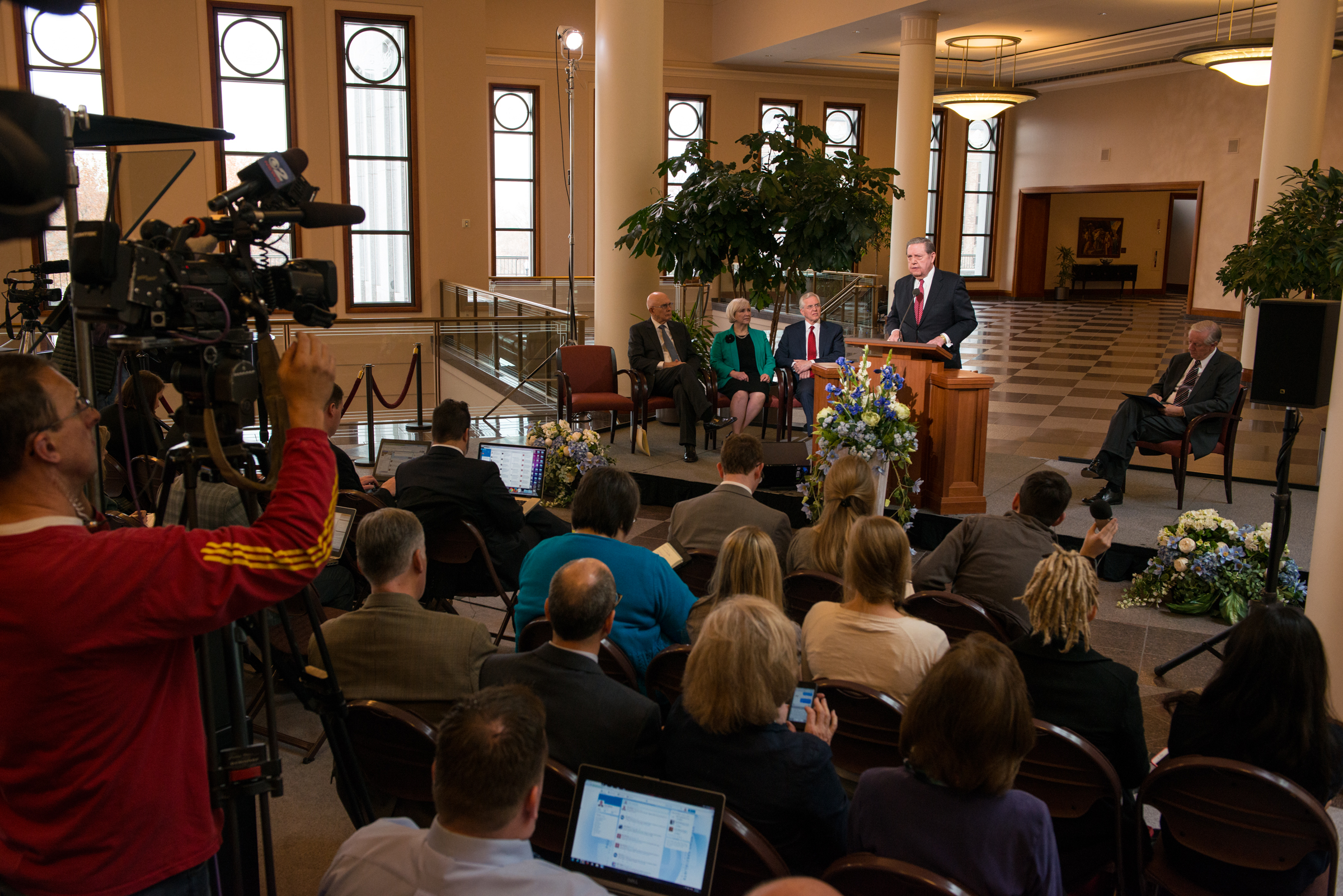 Elders Dallin H. Oaks and Jeffrey R. Holland of the Church’s Quorum of the Twelve Apostles and Sister Neill F. Marriott of the Church’s Young Women general presidency each spoke on behalf of the Church, outlining the issue and the Church’s position and approach. Elder D. Todd Christofferson, also one of the Twelve Apostles, introduced the news conference and the speakers.