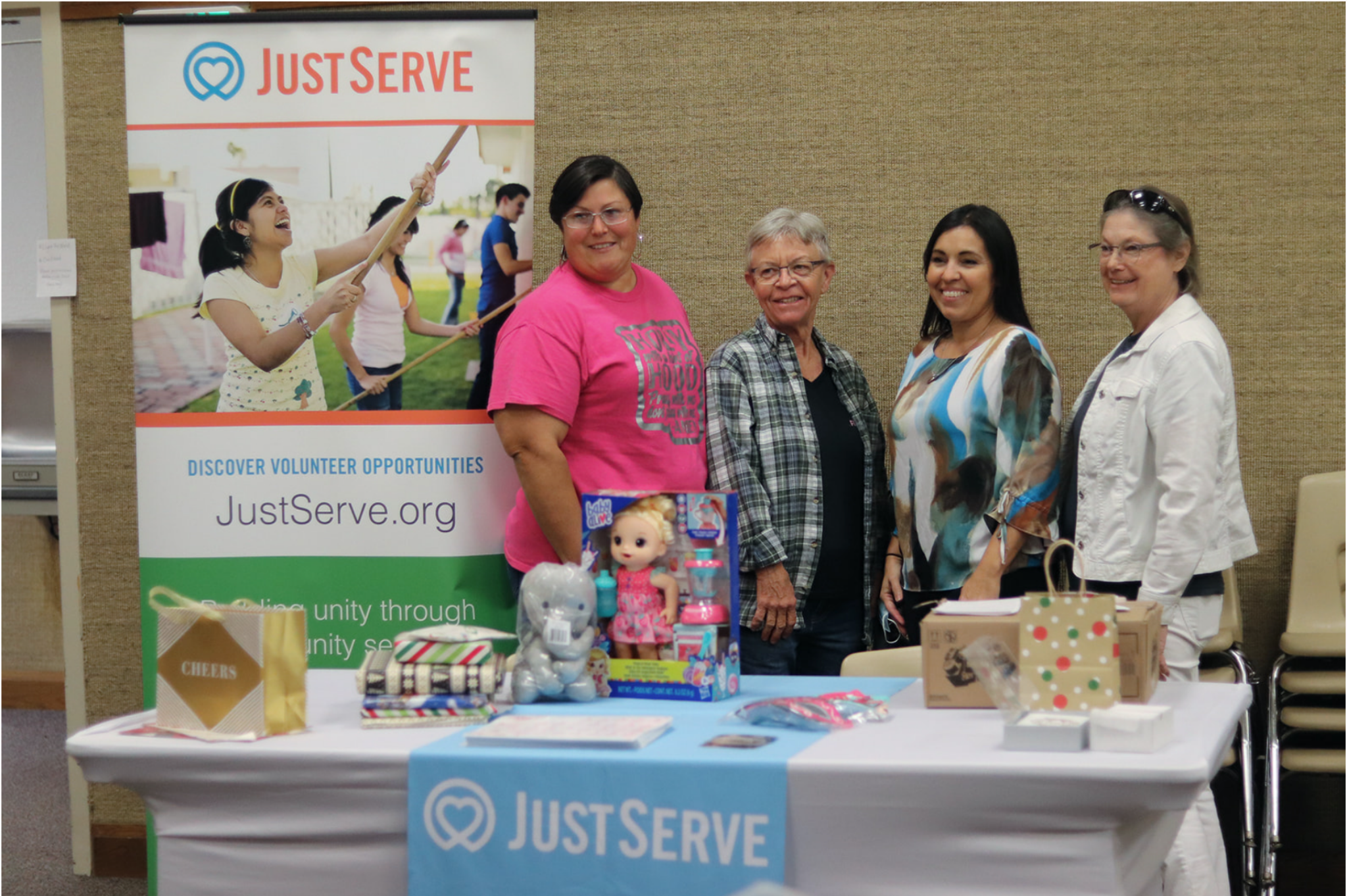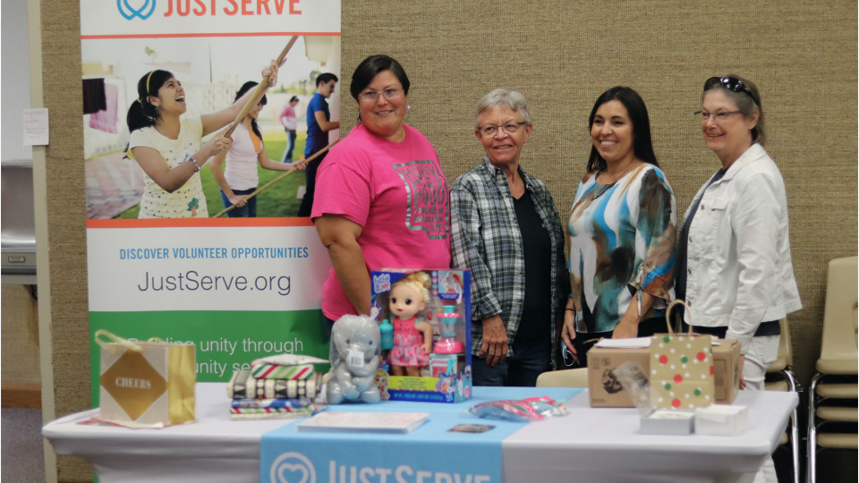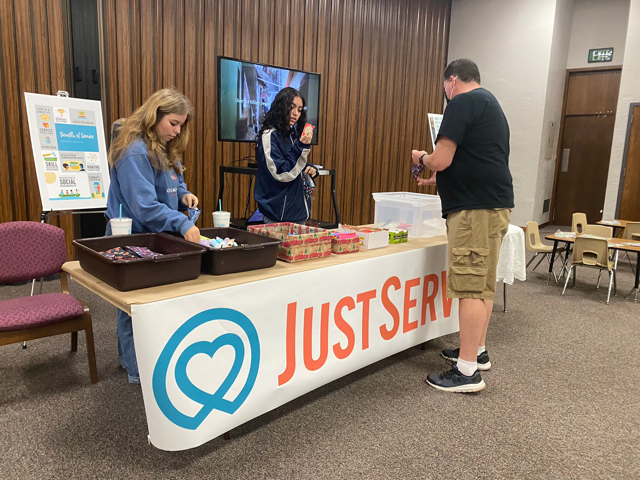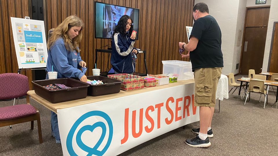There were tables with JustServe service projects happening at the same time as the blood drive. Camden showed people at his stake center how to assemble kits for homeless women in the Orlando area.