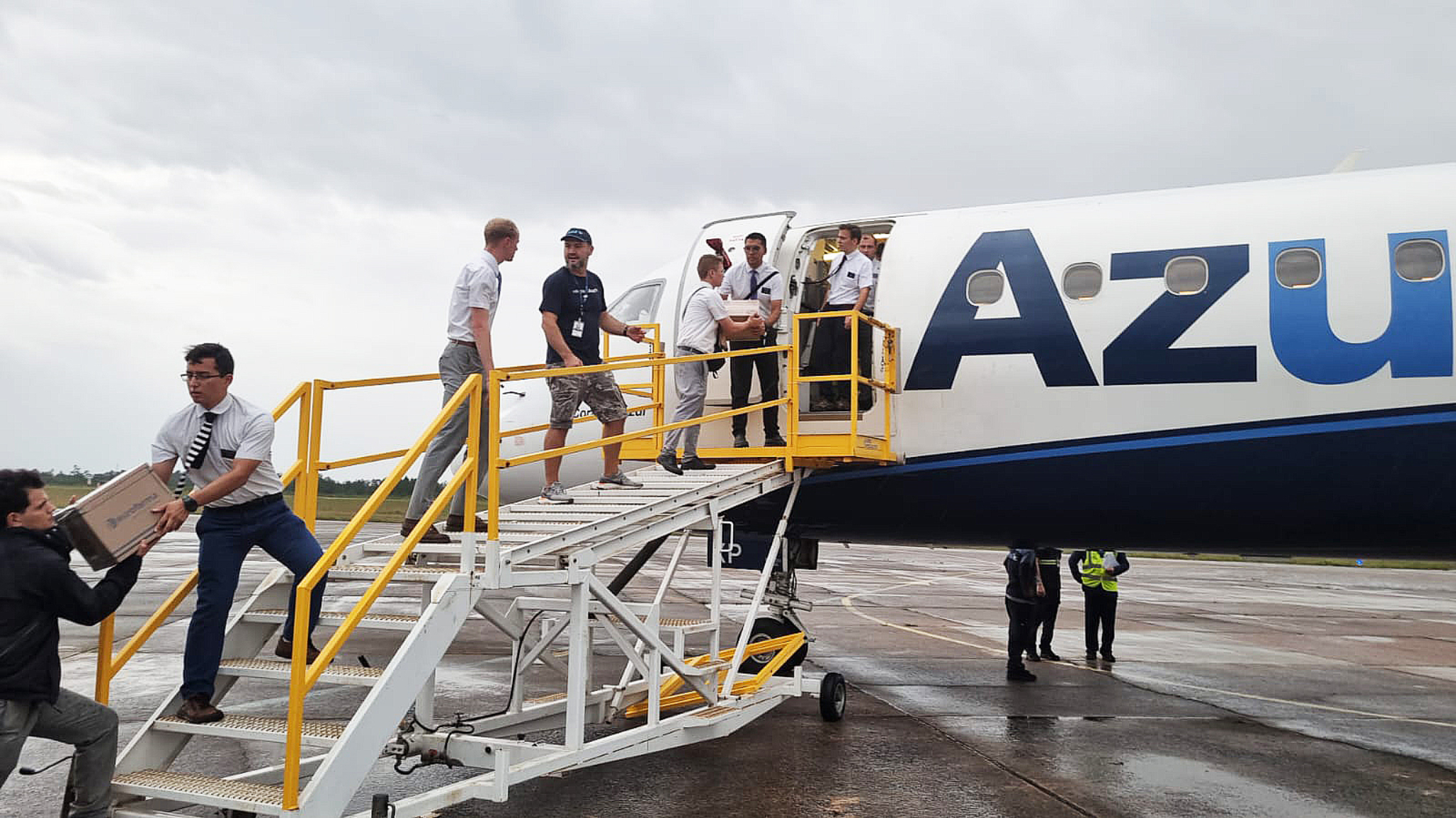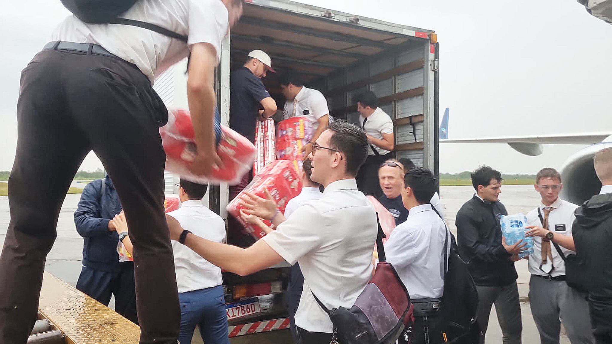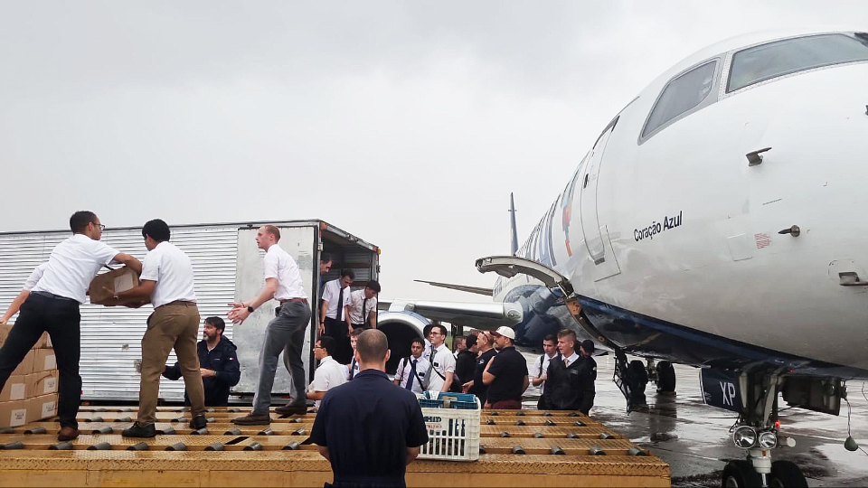 On Wednesday, May 8, missionaries from the Church helped unload emergency supplies from an Azul airplane at the military airport in the city of Canoas.