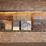 A memorial with remnants of the original structure is encased in an underground tunnel entrance to the buildings.