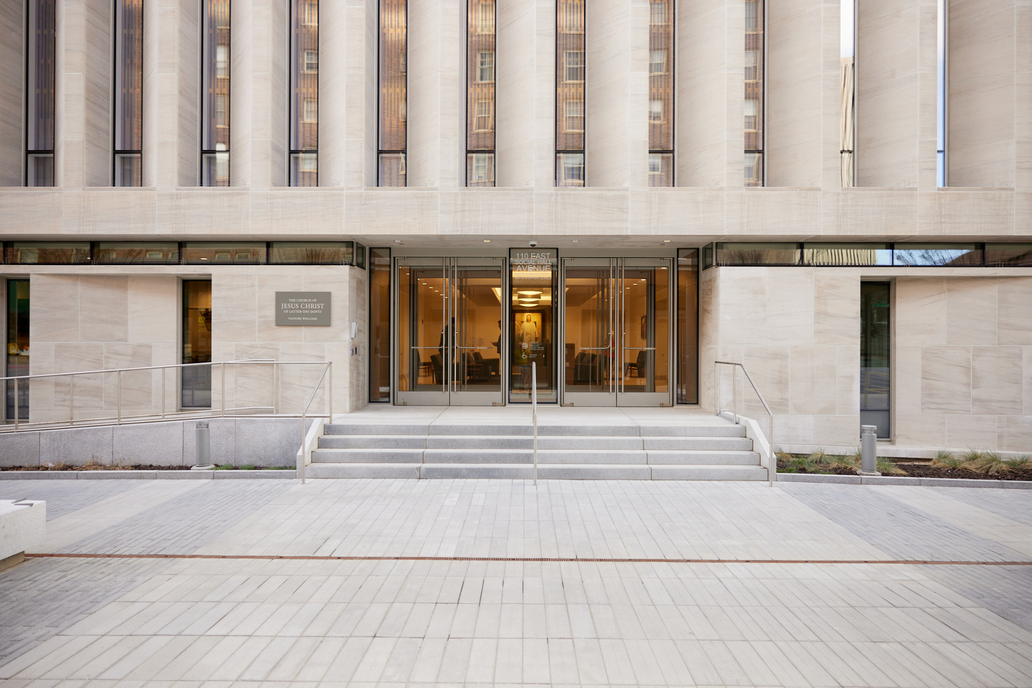 The 39,000-square-foot, four-story meetinghouse is at the base of the new office tower 95 State and has a separate address from the office tower. A steeple was placed next to the meetinghouse entrance that faces Social Hall Avenue, once the location for Latter-day Saint pioneers to gather for social events. The original structure, known as Social Hall, was built in 1852 under the direction of President Brigham Young.
