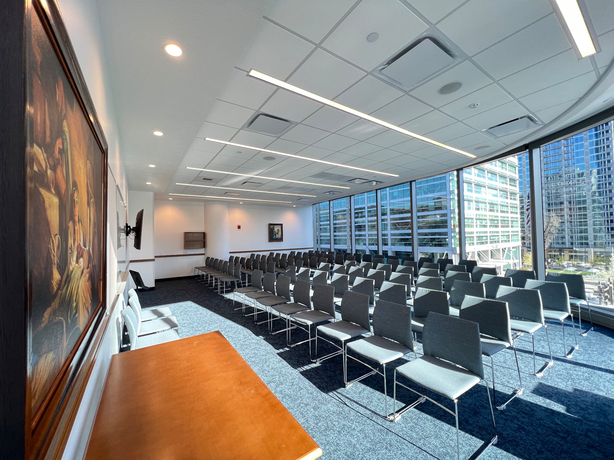 The development also includes a roof terrace, which can be used by office tenants during the day and Church groups in the evenings, and a Sunday School room, where the women’s Relief Society organization meets, that has all the features of a traditional classroom combined with a spectacular view.
