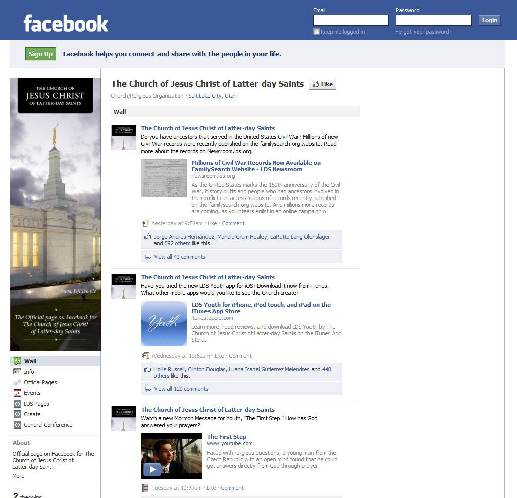The Church and its members contribute to the conversation and have steadily built a substantial social media presence. For example, according to the popular website AllFacebook.com (not associated with Facebook), five of the Church’s official Facebook pages are ranked among the top 100 in the “Church/Religious Organization” category — including two in the top 25. AllFacebook.com lists 2,970 pages under Facebook’s “Church/Religious Organization” category.