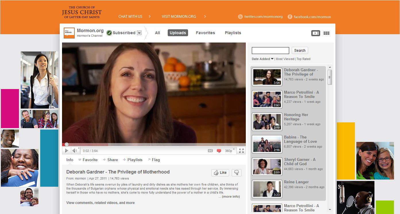 Also as of 13 May 2011, the Church’s Mormon Messages YouTube channel was ranked number 2 in video views (20,656,000) in the “Nonprofits & Activism” category. YouTube channels the Church administers include: