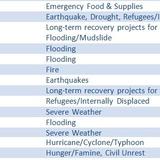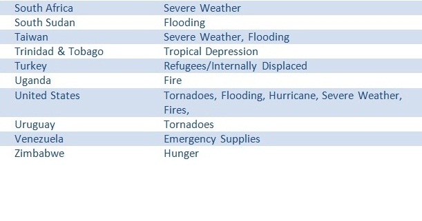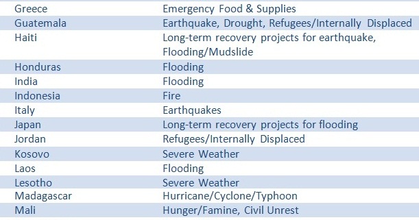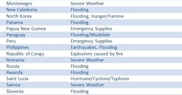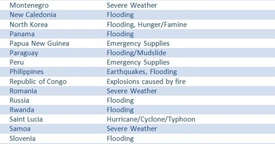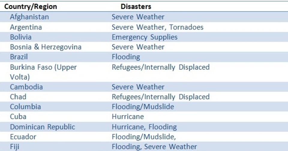 The following table lists the countries and regions assisted, along with the types of disasters experienced:
