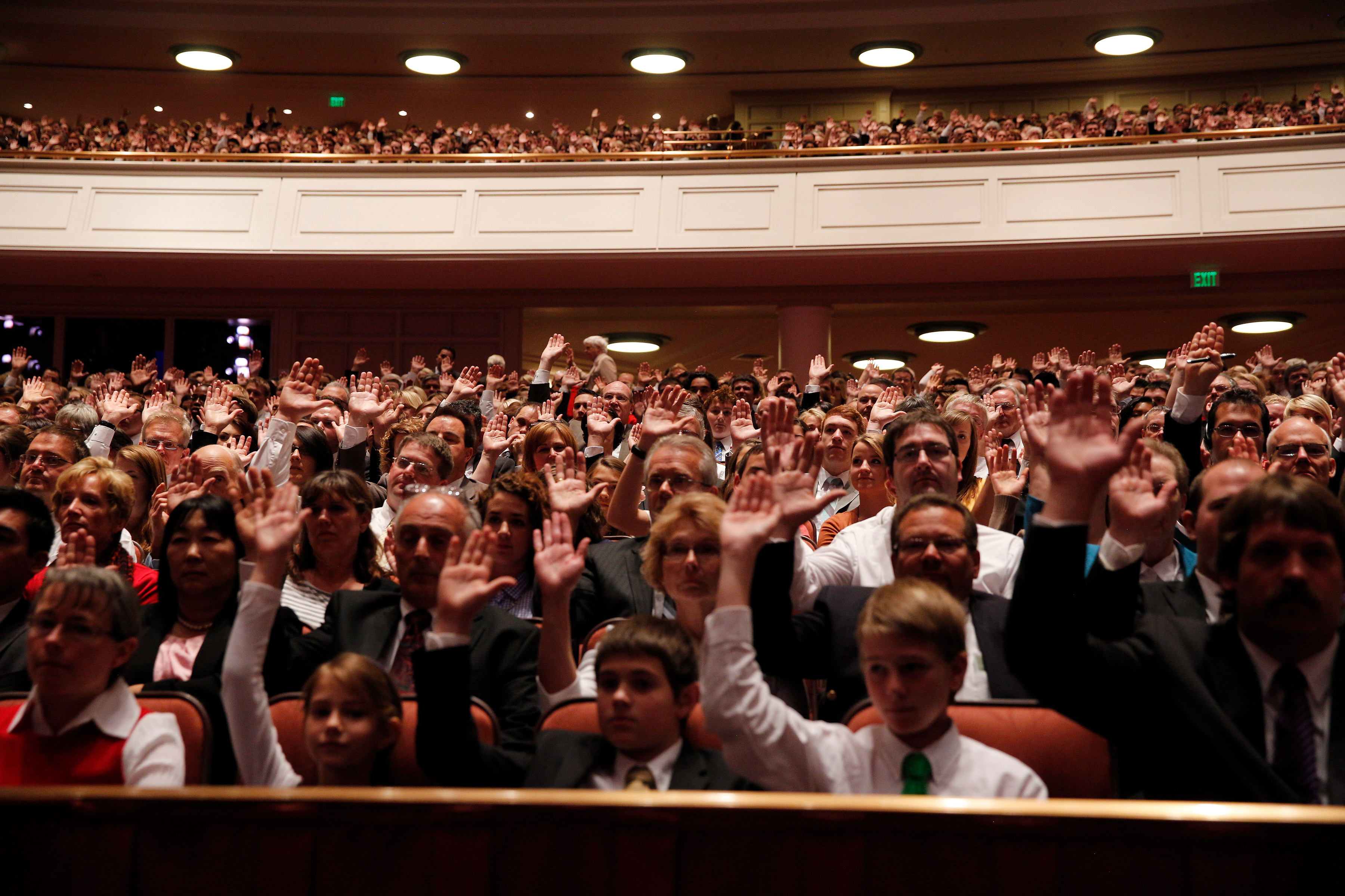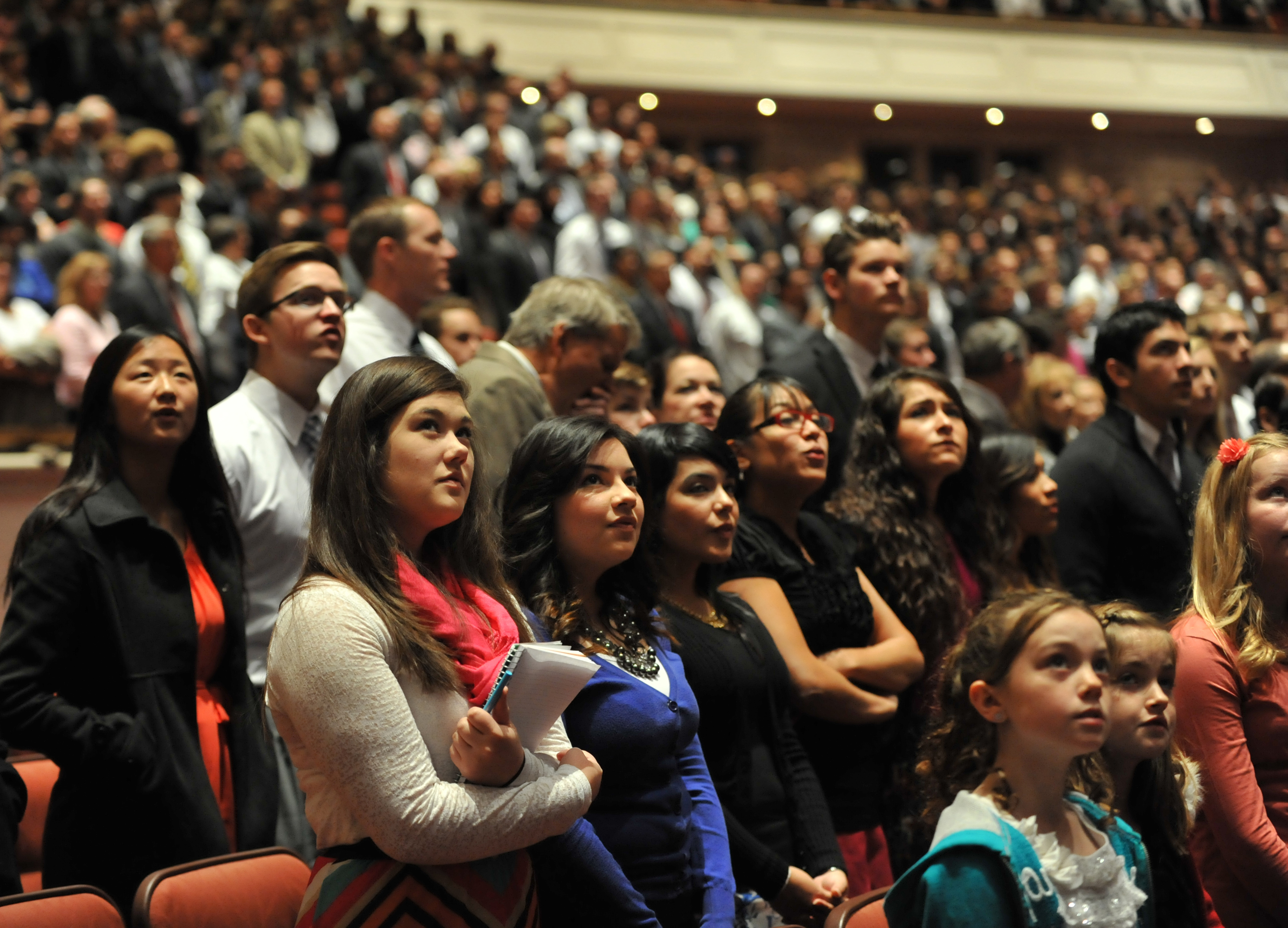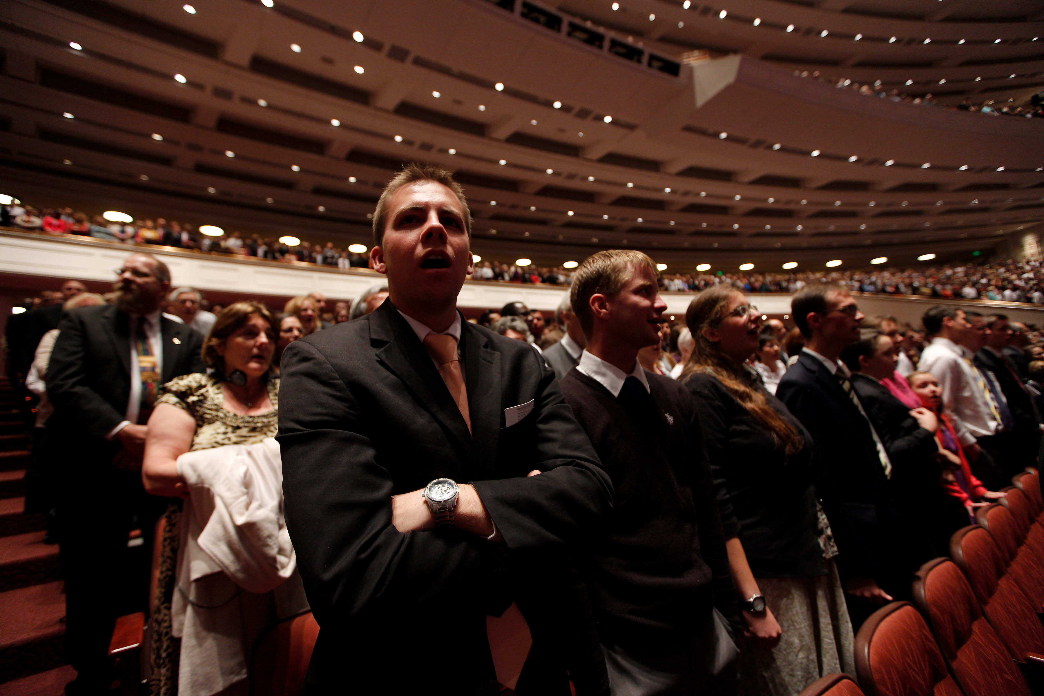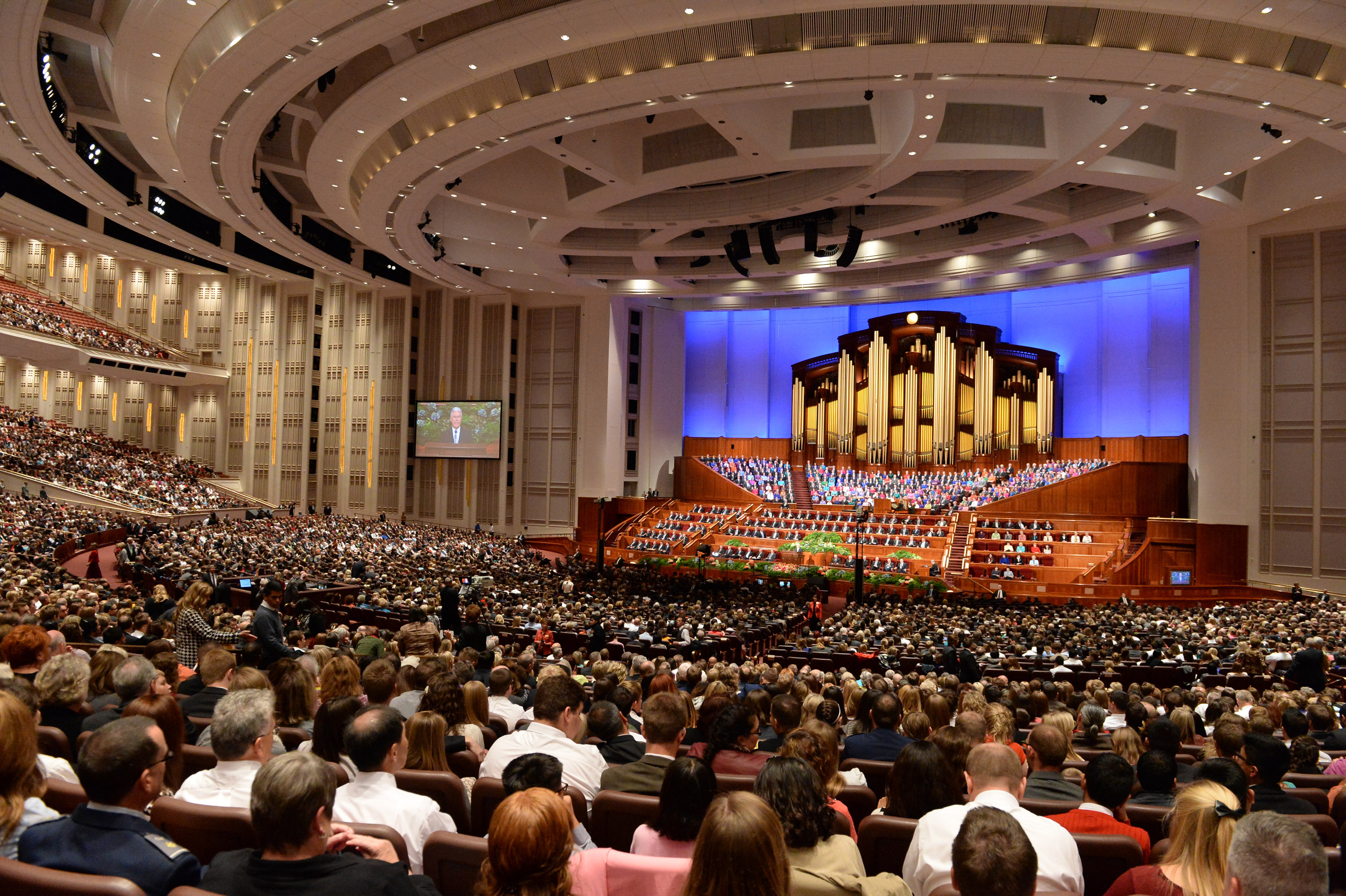 General conferences of The Church of Jesus Christ of Latter-day Saints take place every six months, originating in the 21,000-seat Conference Center in Salt Lake City and reaching a global audience estimated to be in the millions. The proceedings are available in multiple languages via television, radio, satellite and Internet broadcasts. Five sessions of the conference will be held Saturday and Sunday, 6-7 April 2013, in the Conference Center in Salt Lake City, Utah.