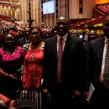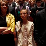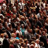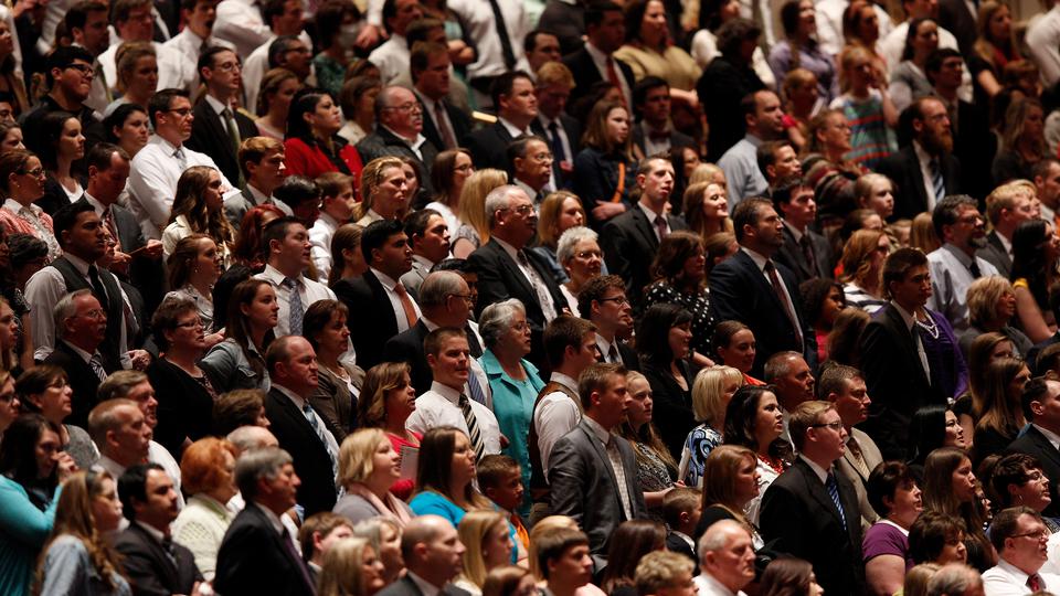- Conference goers sing the hymn “Choose the Right” during the Saturday morning session of general conference, 5 April 2014