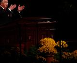 - President Thomas S. Monson smiles as he takes the stand prior to the Saturday afternoon session of general conference, 5 April 2014