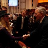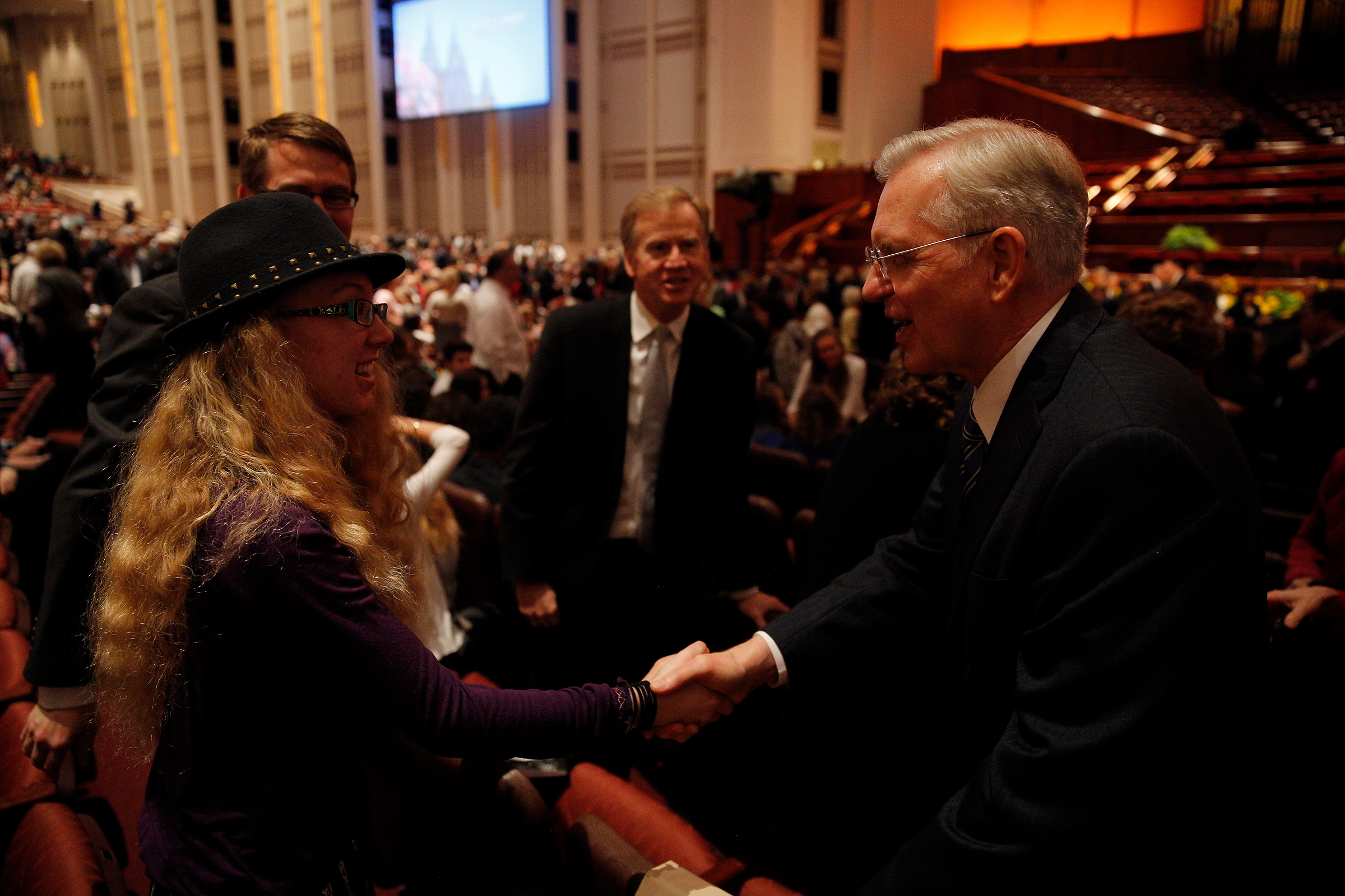 - Elder D. Todd Christofferson of the Quorum of the Twelve Apostles greets conference goers prior to the Saturday morning session of general conference, 5 April 2014