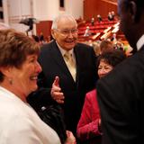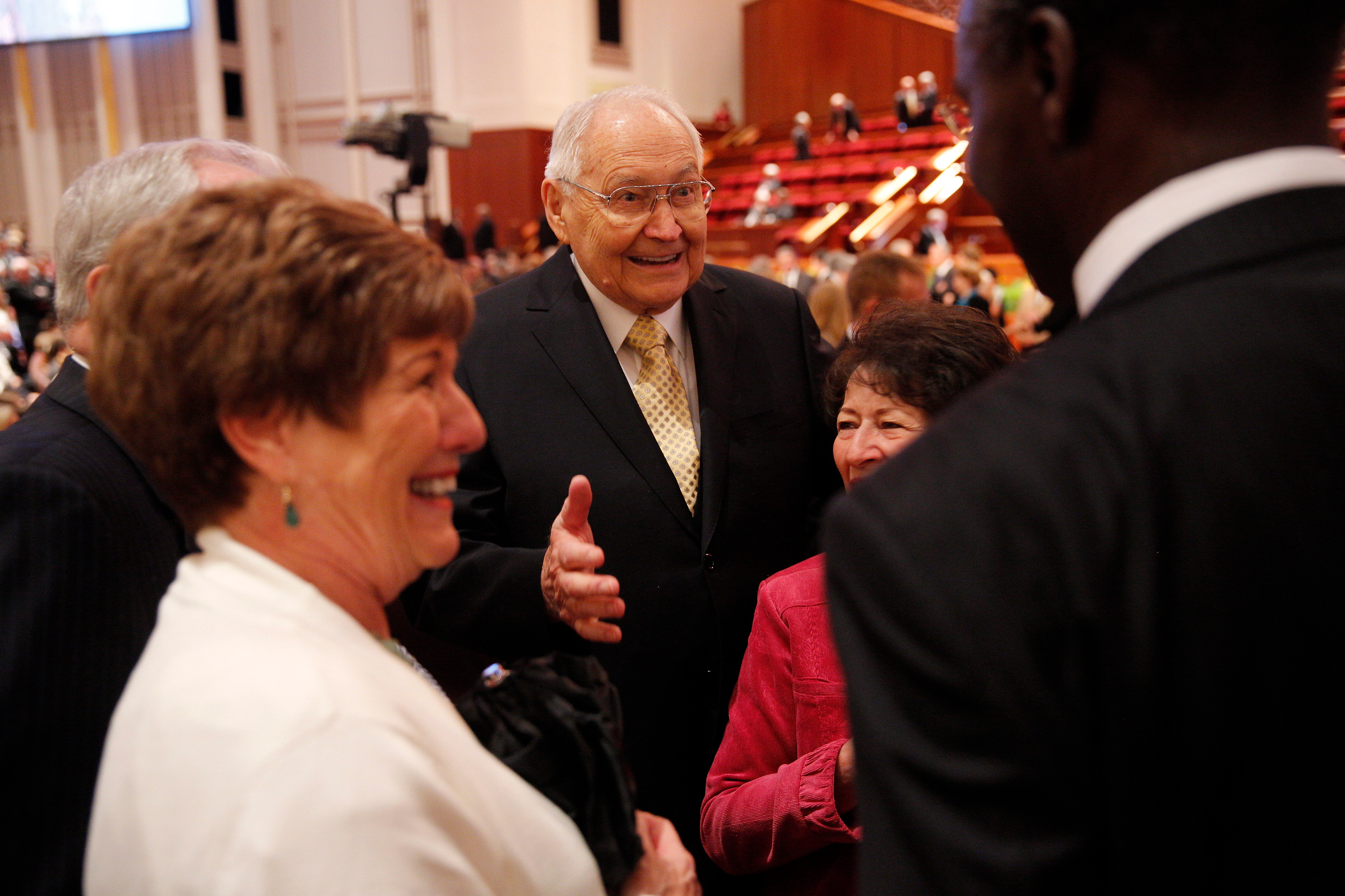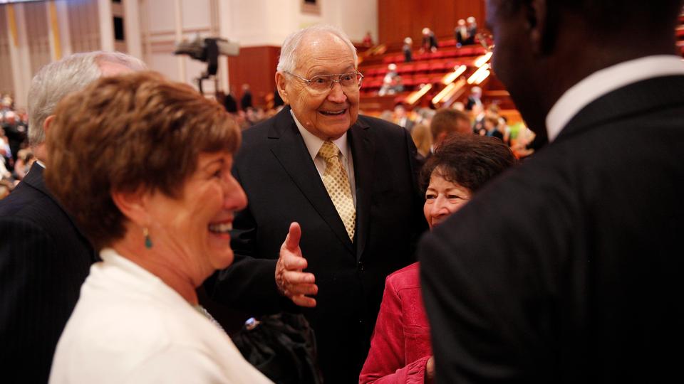 - Elder L. Tom Perry of the Quorum of the Twelve Apostles and wife Barbara greet conference goers prior to the Saturday morning session of general conference, 5 April 2014