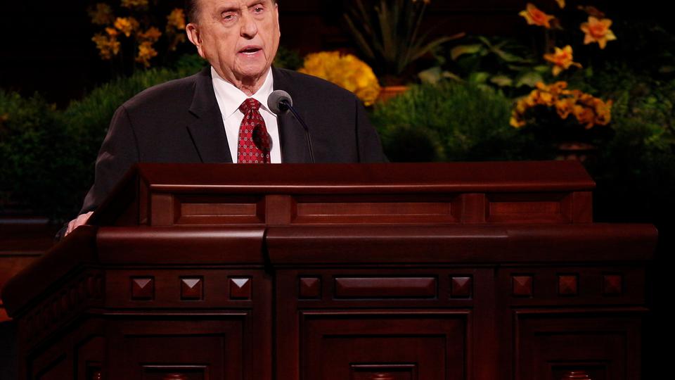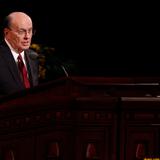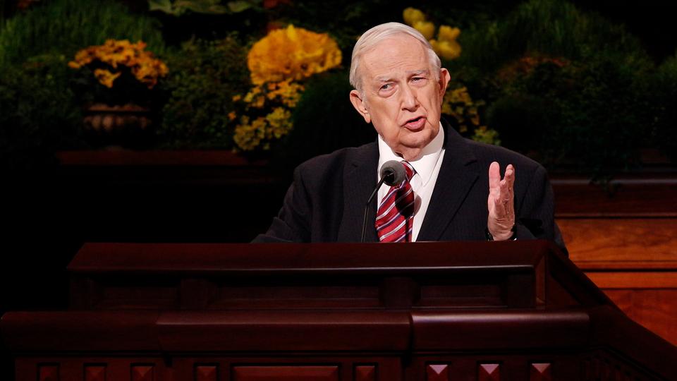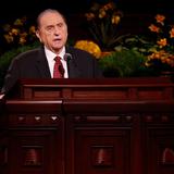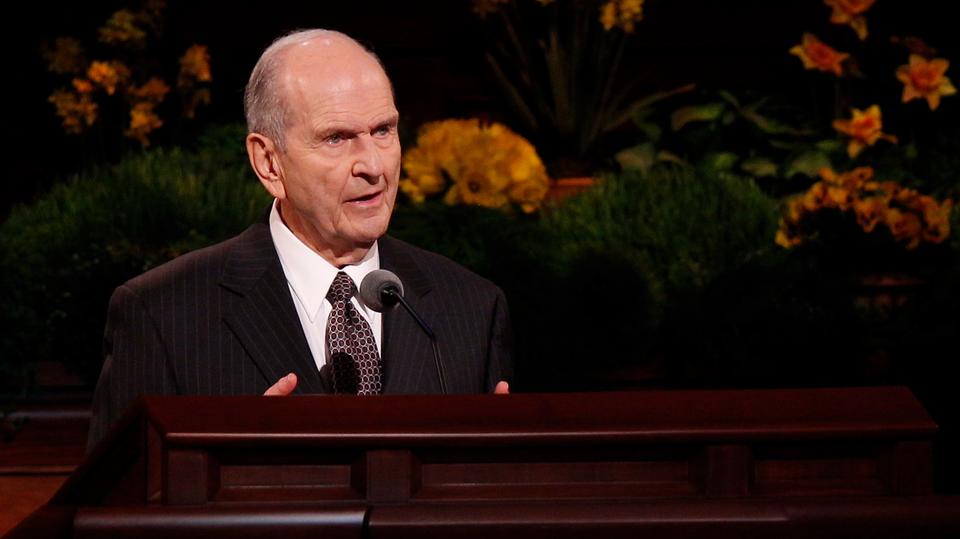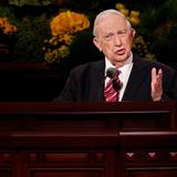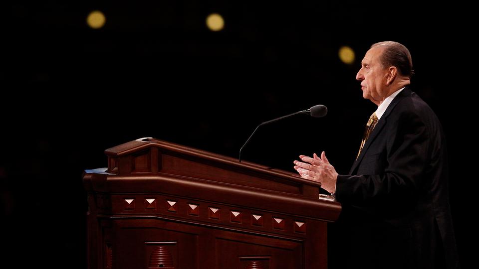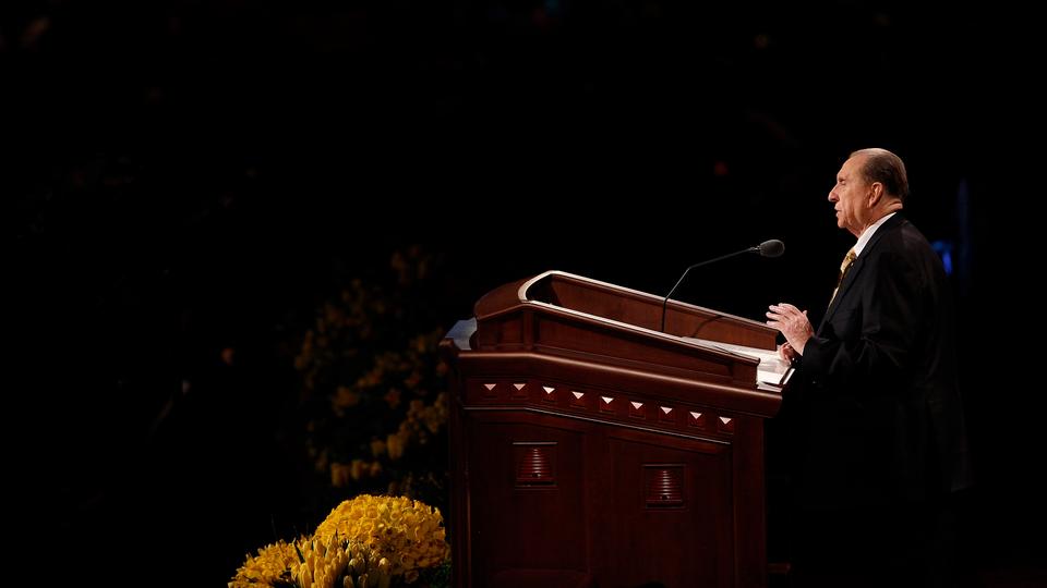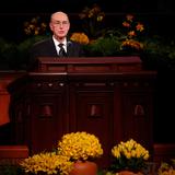 - President Thomas S. Monson speaks at the Sunday morning session of general conference, 6 April 2014