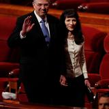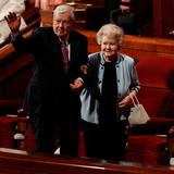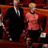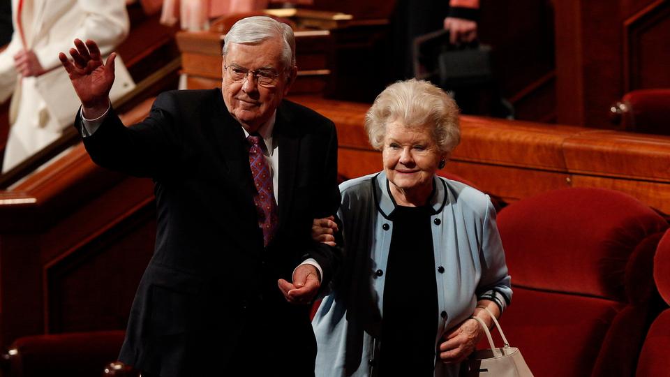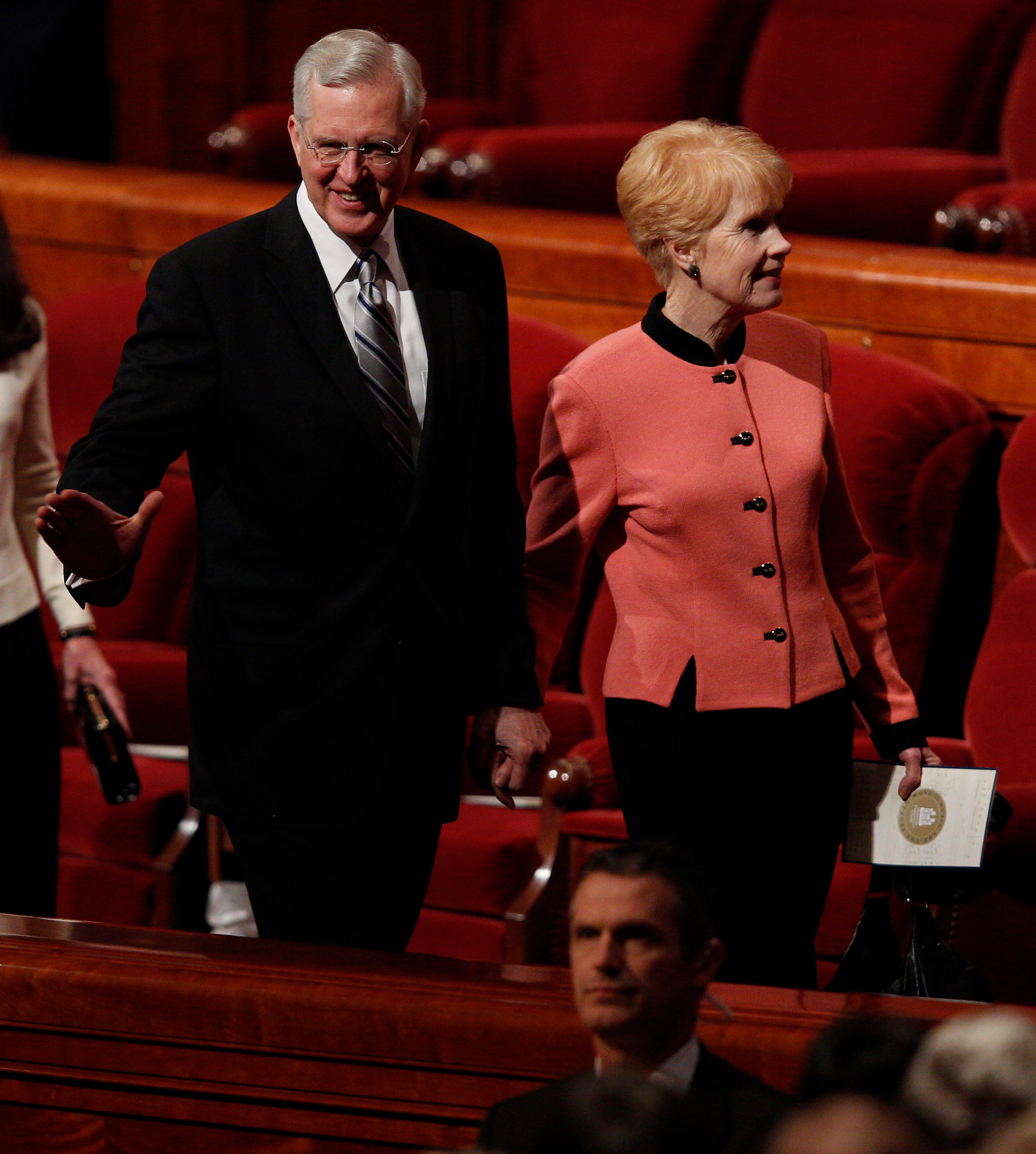 - President Dieter F. Uchtdorf and wife Harriet leave the stand of the Conference Center in Salt Lake City, Utah following the Sunday morning session of general conference, 6 April 2014