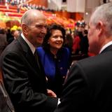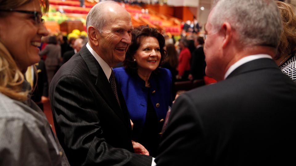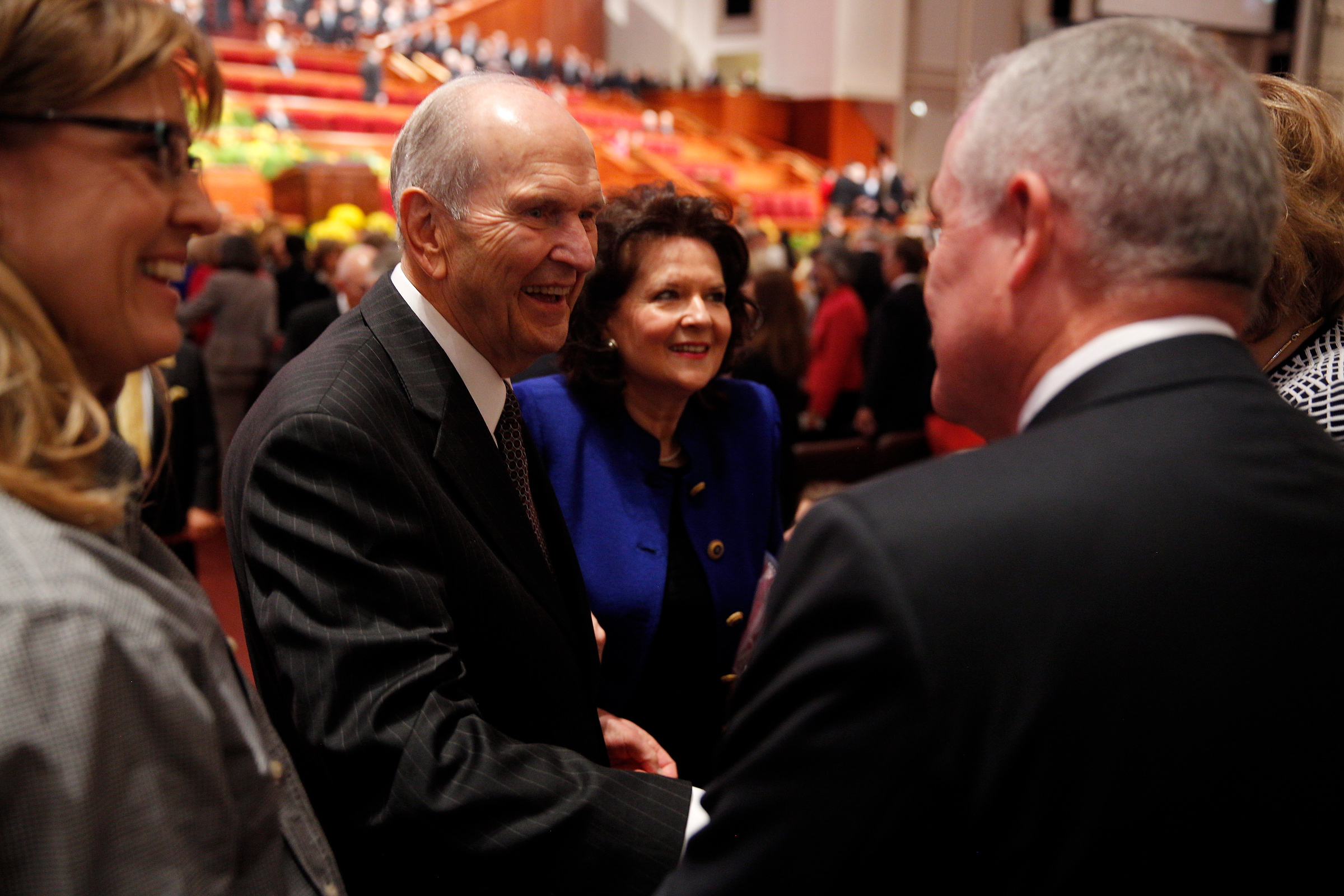 - Elder Russell M. Nelson of the Quorum of the Twelve Apostles and wife Wendy greet conference goers prior to the Saturday morning session of general conference, 5 April 2014