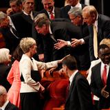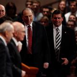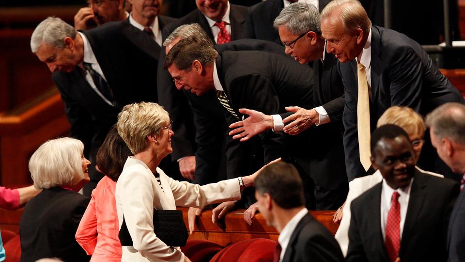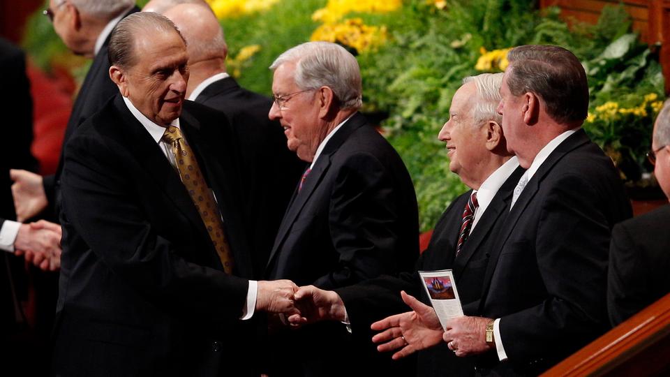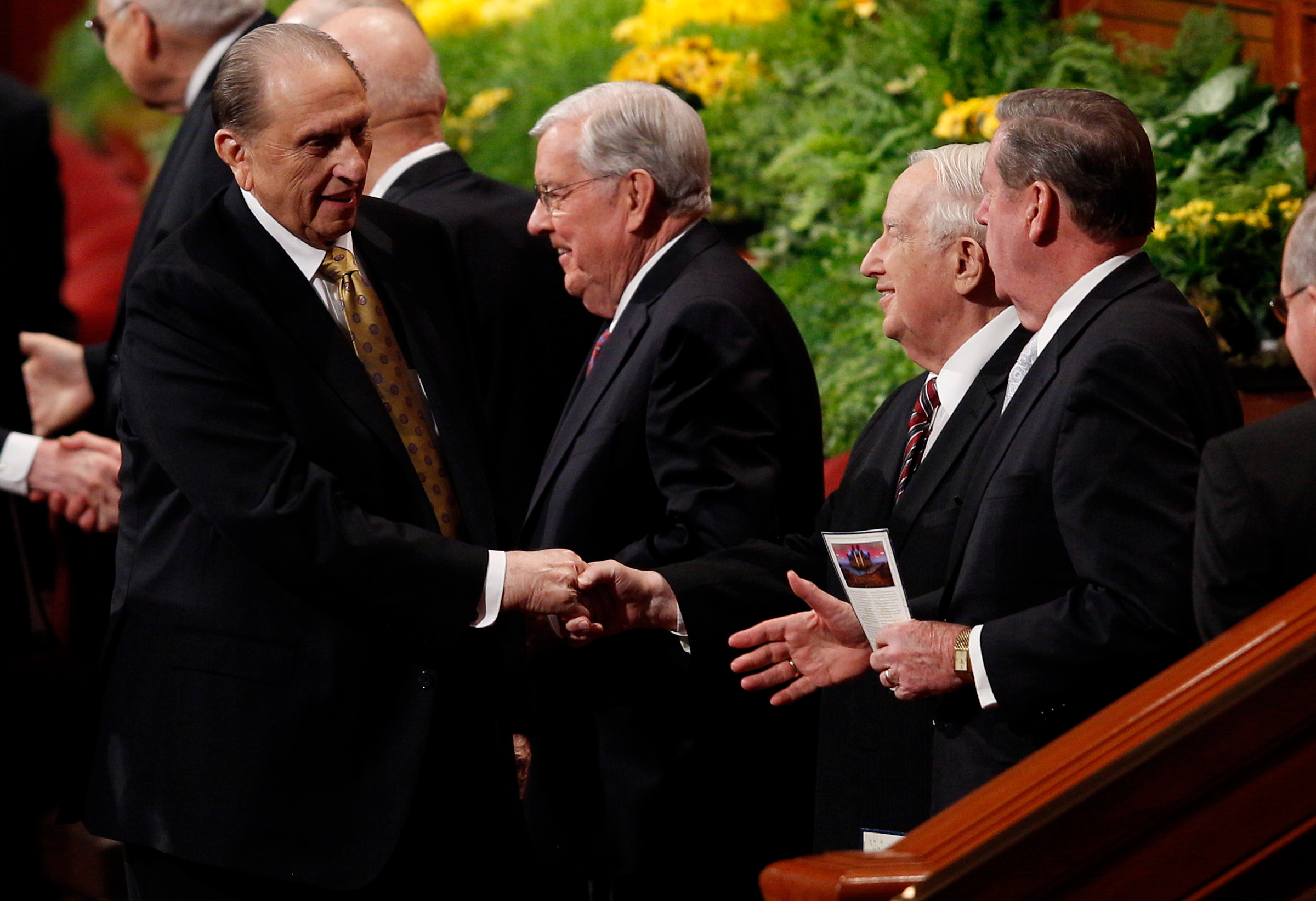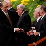 - President Thomas S. Monson shakes hands with members of the Quorum of the Twelve Apostles following the Sunday morning session of general conference, 6 April 2014