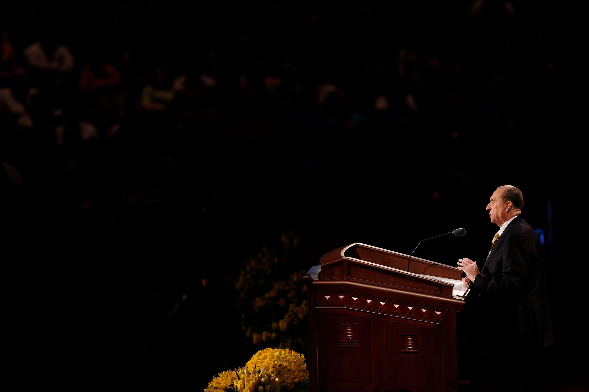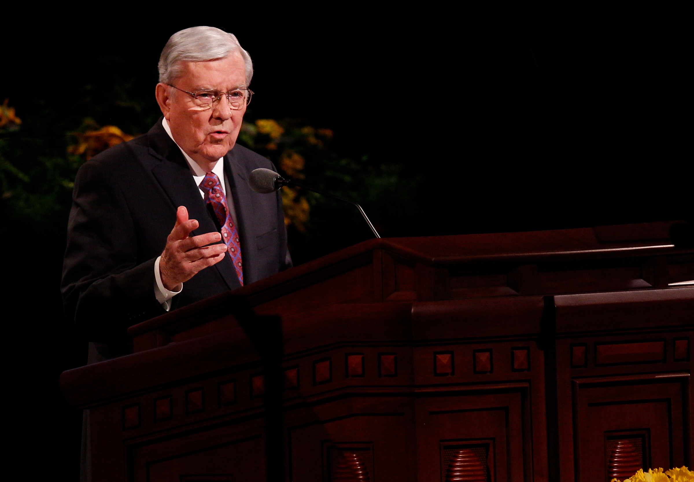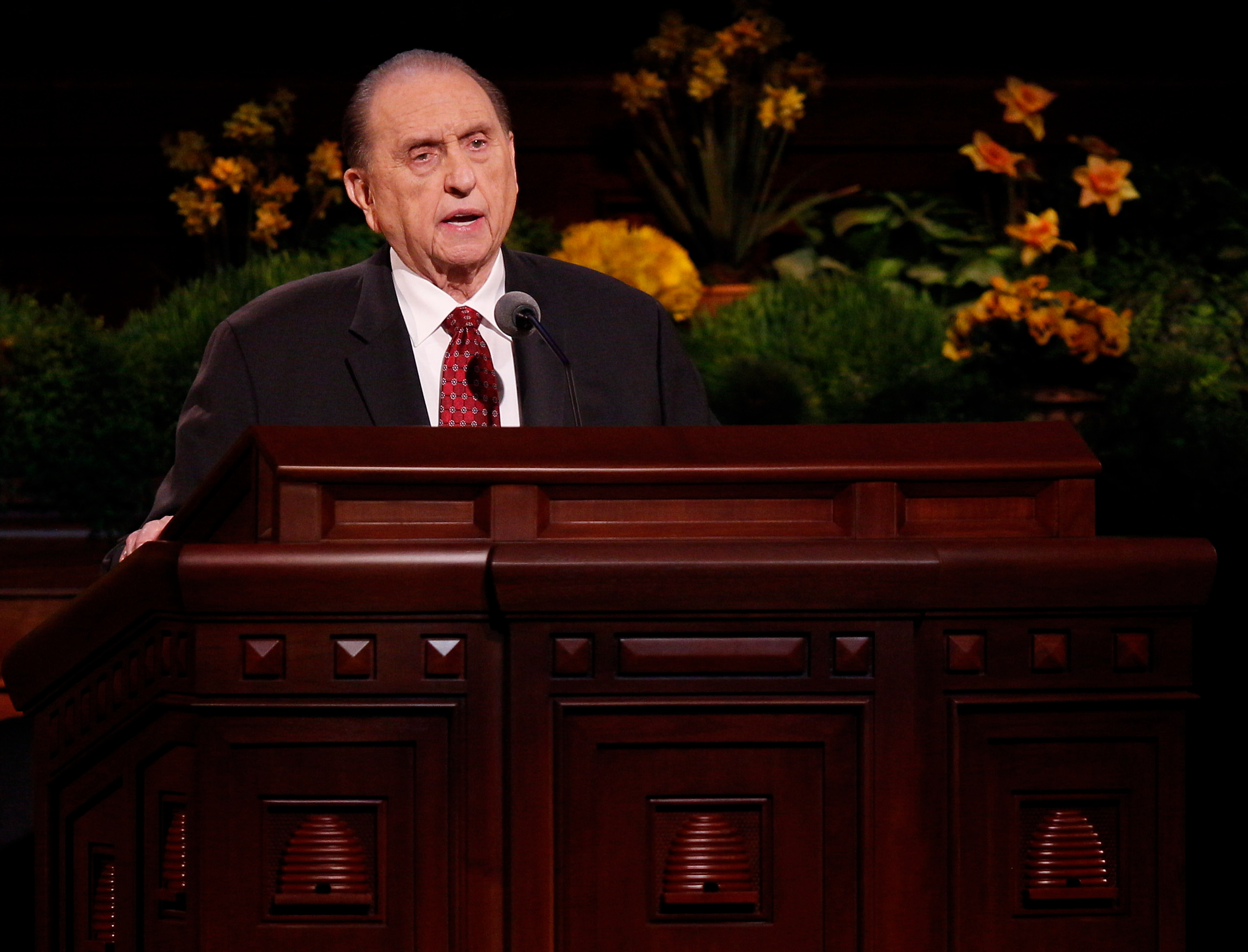 - President Thomas S. Monson speaks at the conclusion of general conference at the Sunday afternoon session in Salt Lake City, 6 April 2014
