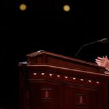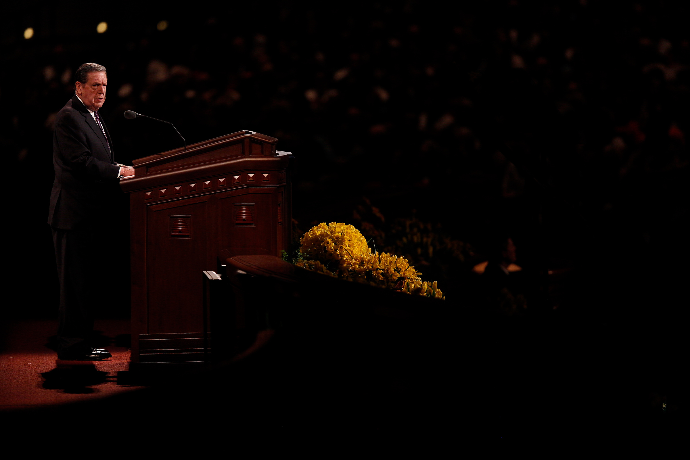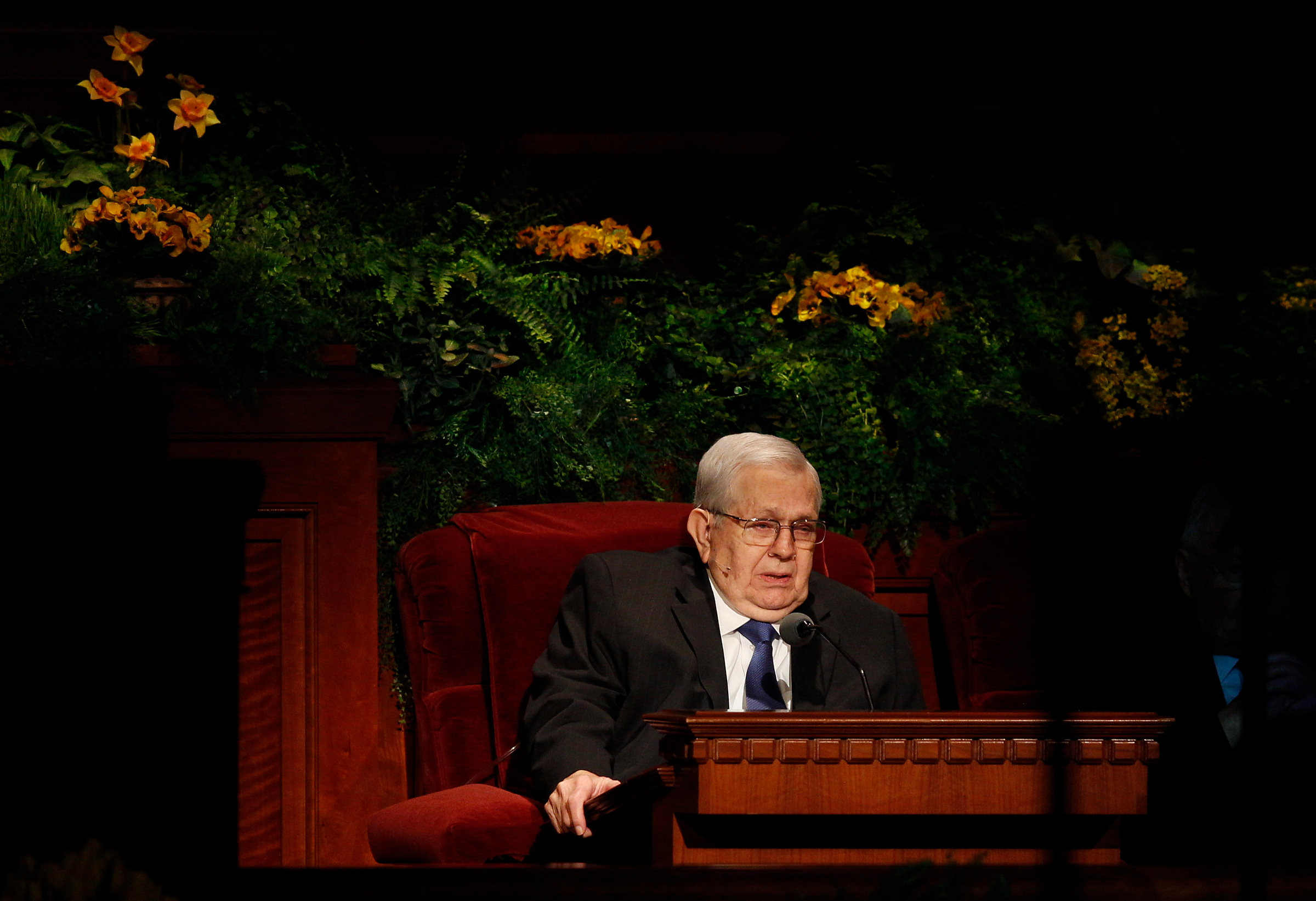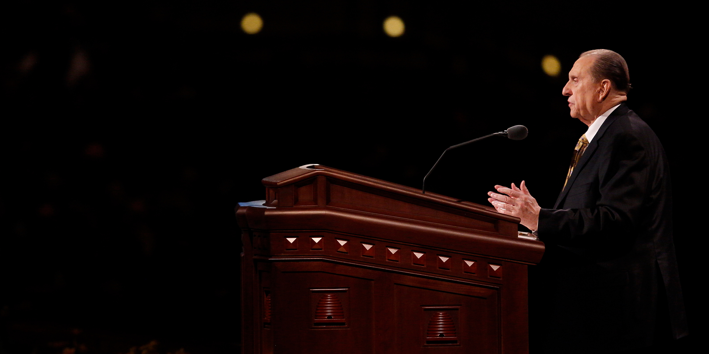 - President Thomas S. Monson speaks at the conclusion of general conference at the Sunday afternoon session in Salt Lake City, 6 April 2014