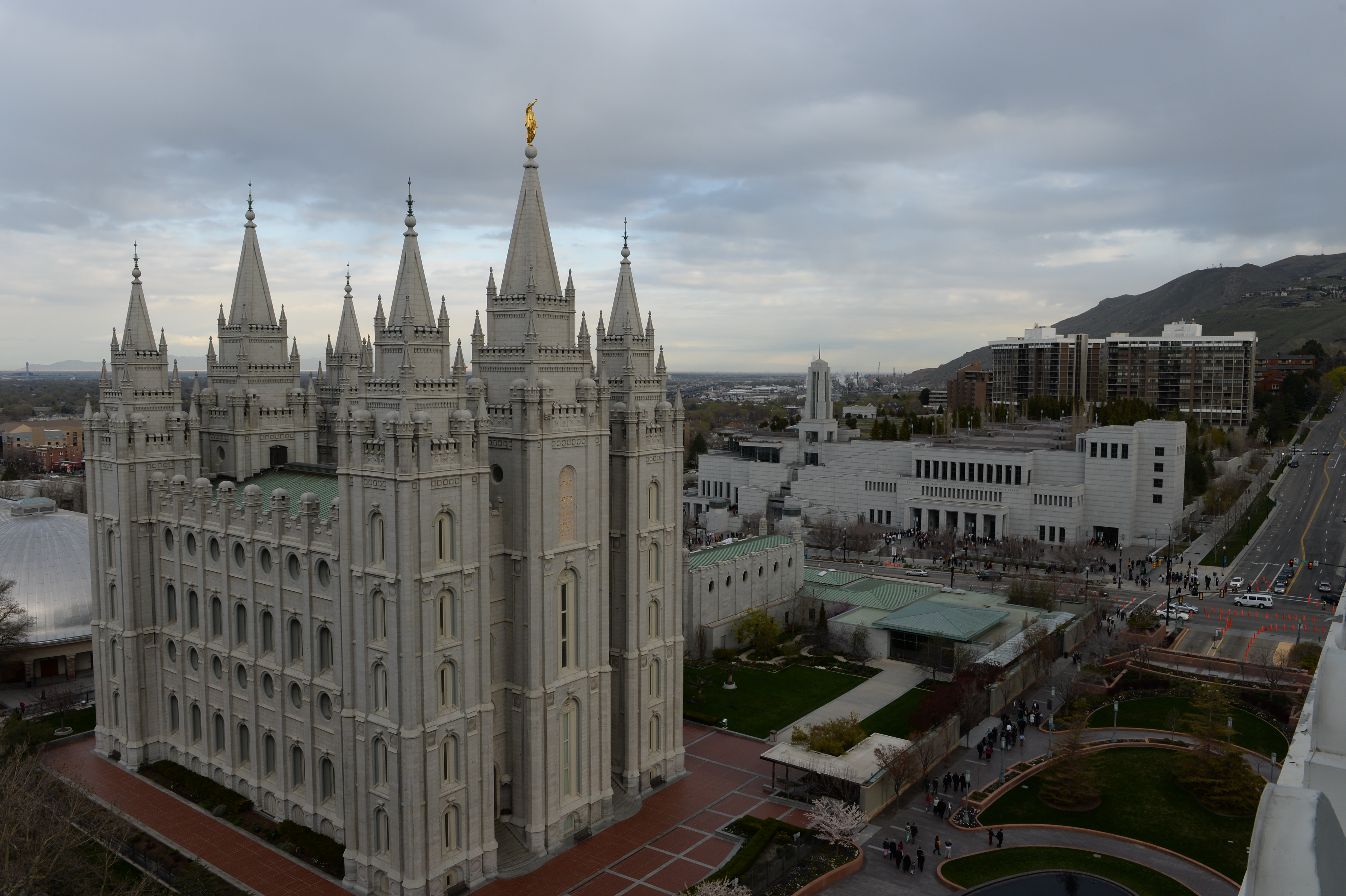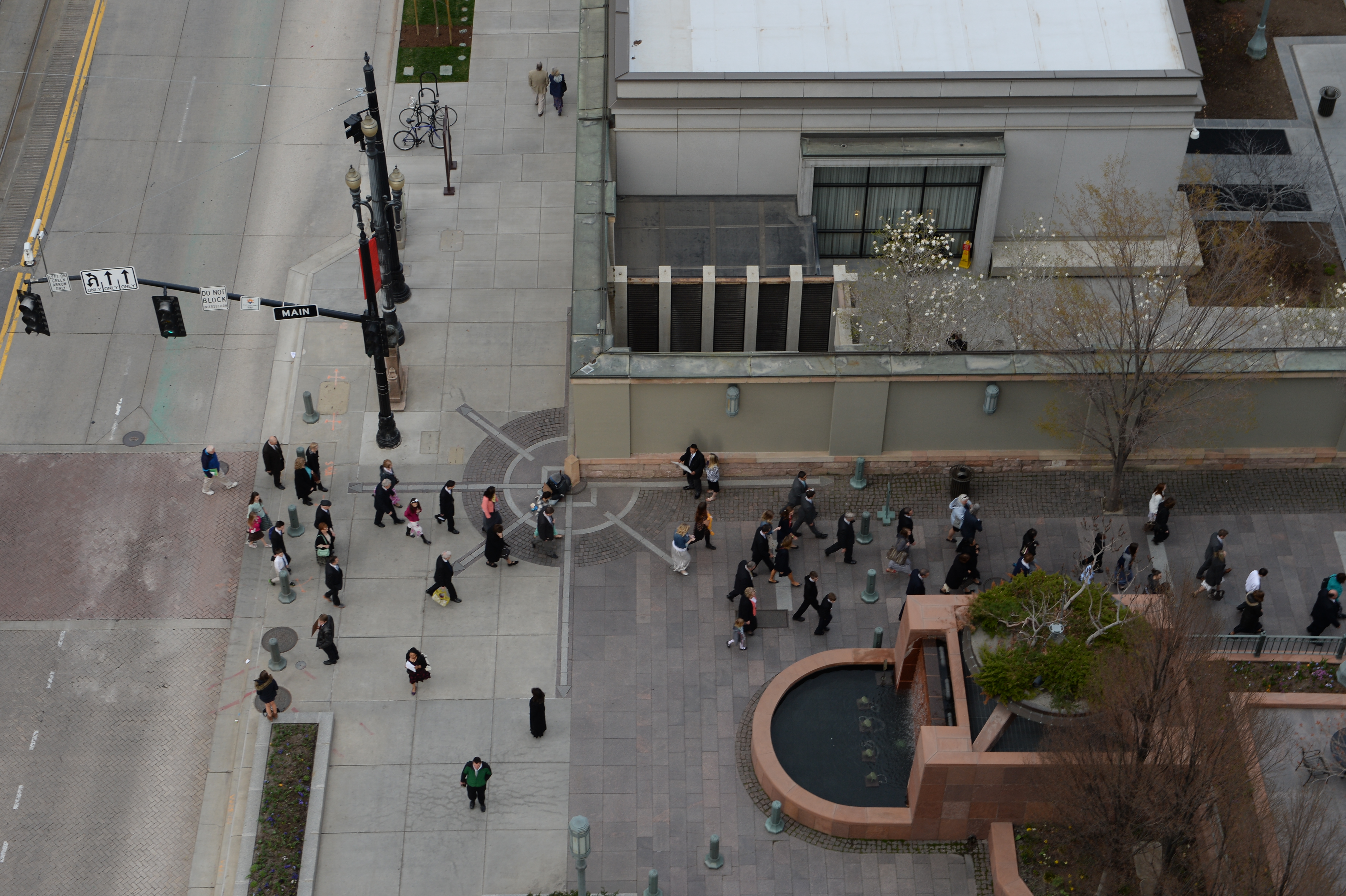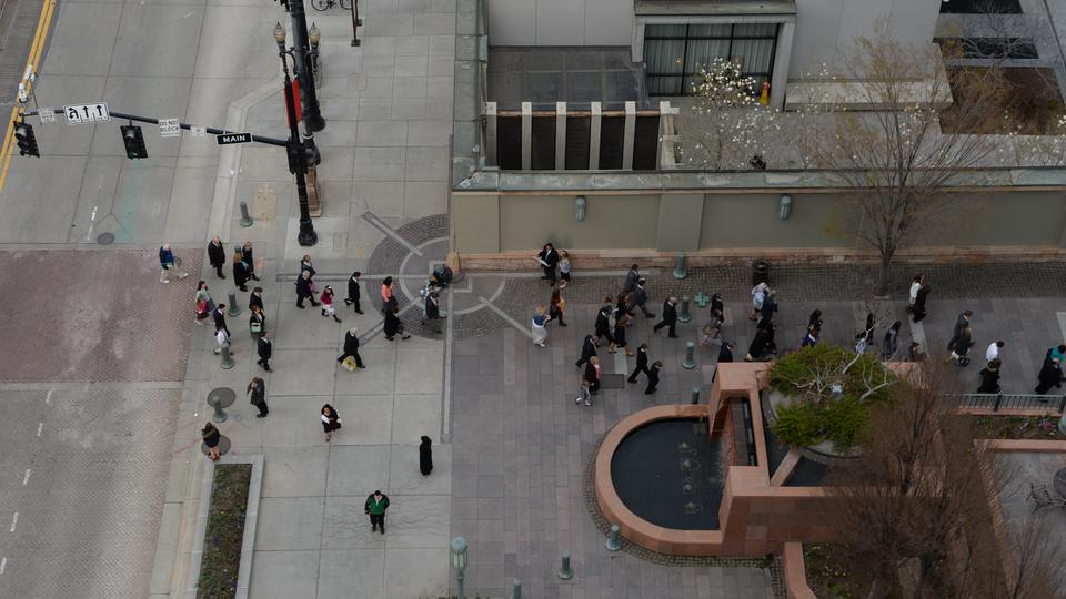 - A bird’s eye view of conference goers as they walk on the Plaza near the Salt Lake City Temple, Saturday 5 April 2014