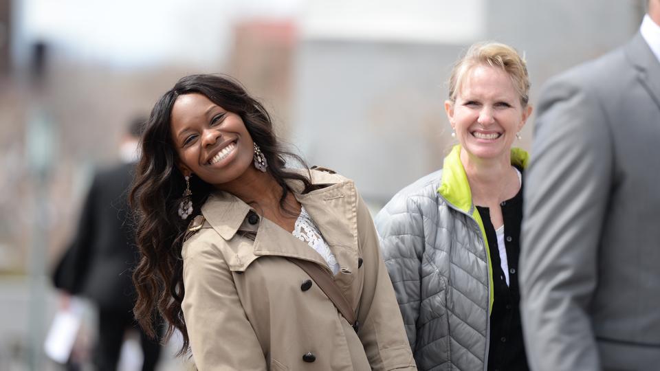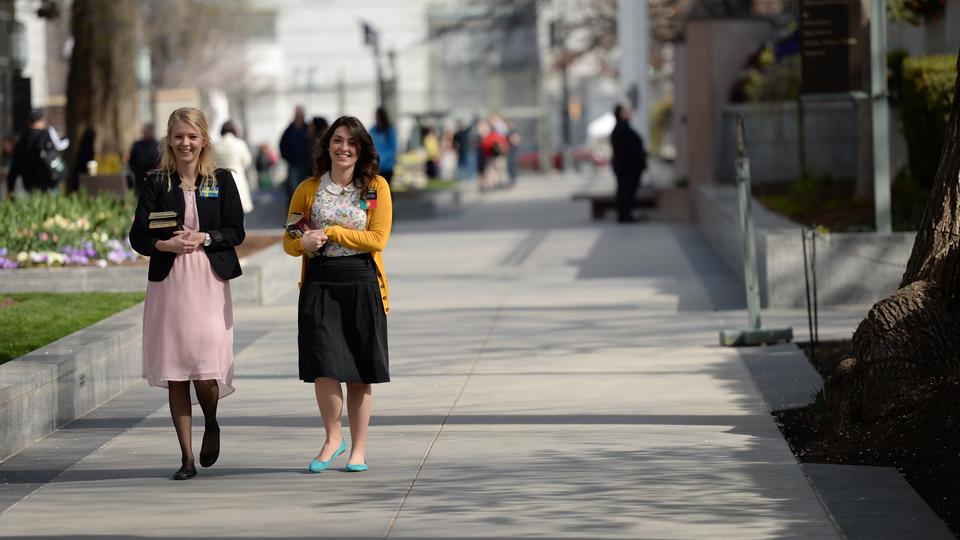 - Sister Missionaries for The Church of Jesus Christ of Latter-day Saints smile as they walk on Temple Square during conference weekend, Saturday 5 April 2014