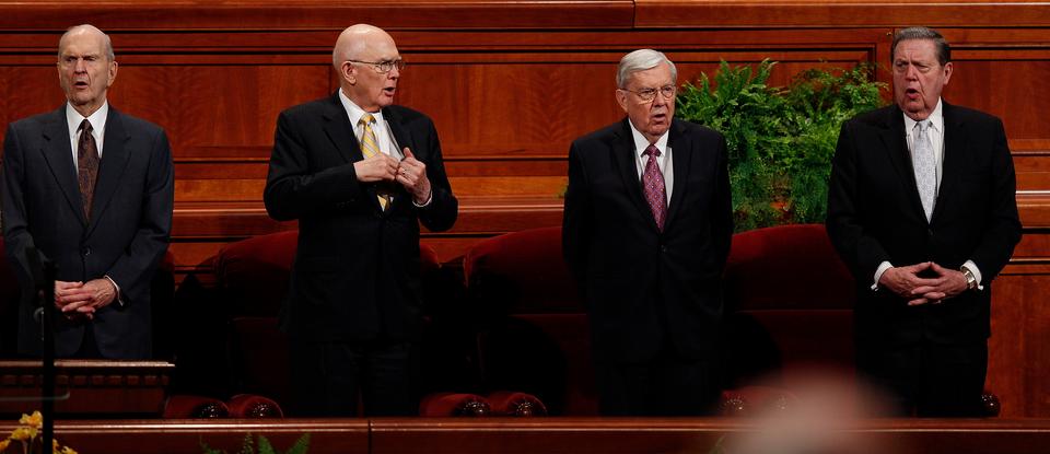 - Members of the Quorum of the Twelve Apostles sing during the Sunday afternoon session of general conference at the Conference Center in Salt Lake City, Utah, 6 April 2014
