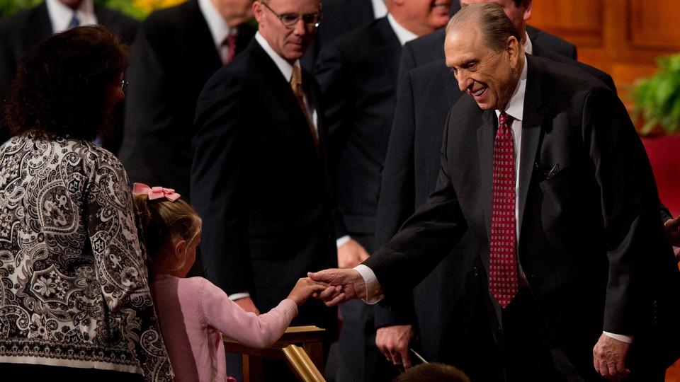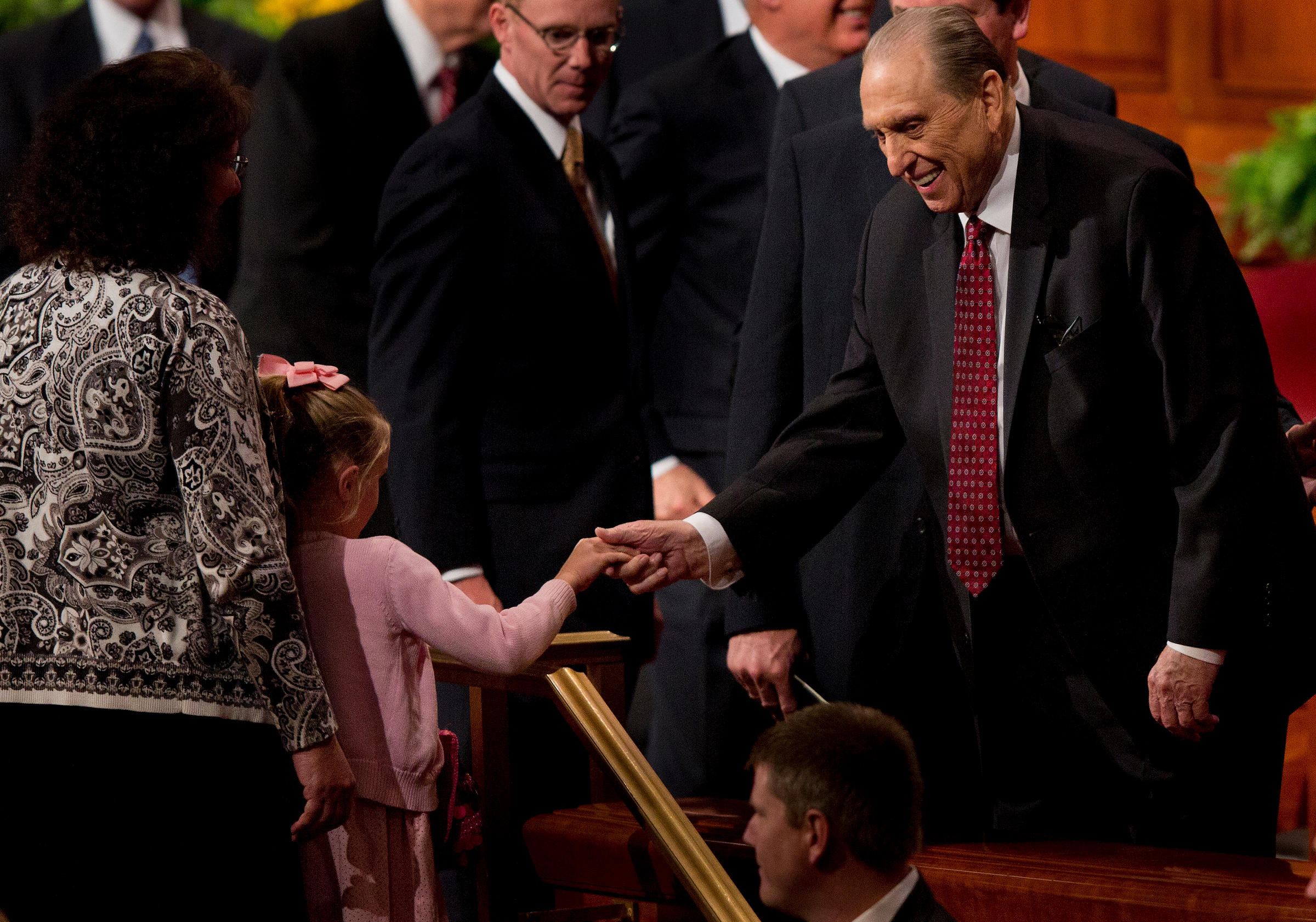 - President Monson greets a young girl as he exits the Saturday morning session of general conference, 5 April 2014