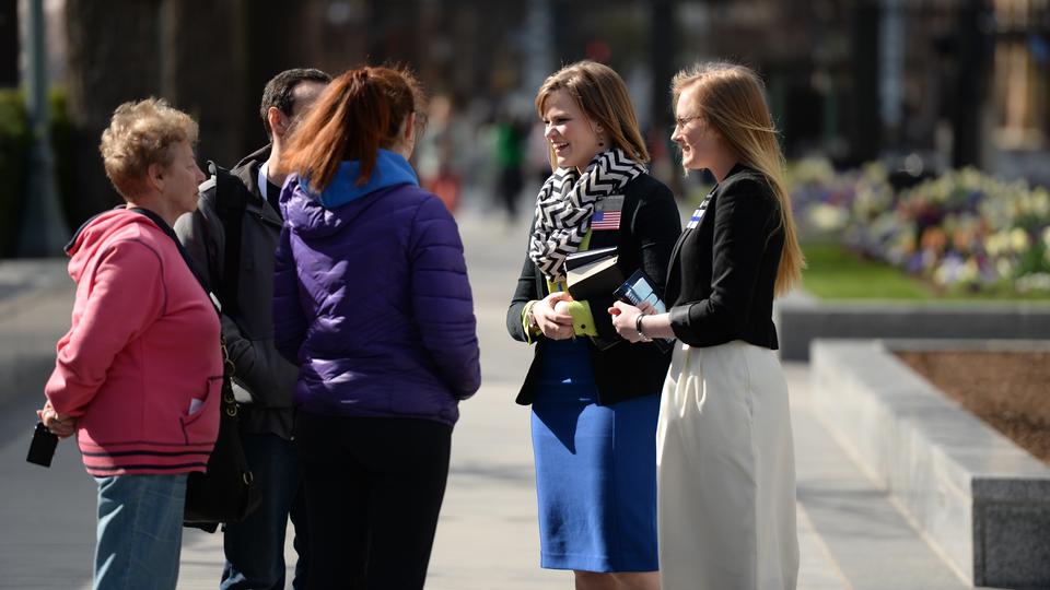 - Sister Missionaries for The Church of Jesus Christ of Latter-day Saints talk with a family on Temple Square during conference weekend, Saturday 5 April 2014