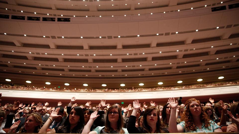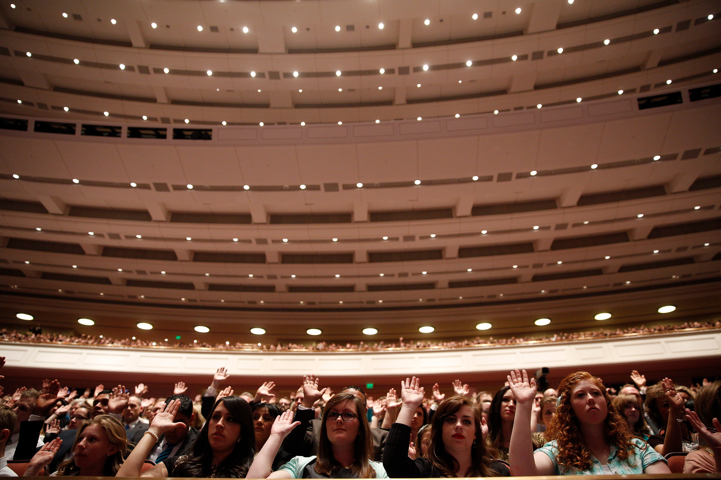 - Mormons attending the Saturday afternoon session of general conference raise their hands to sustain the general leaders of The Church of Jesus Christ of Latter-day Saints, 5 April 2014