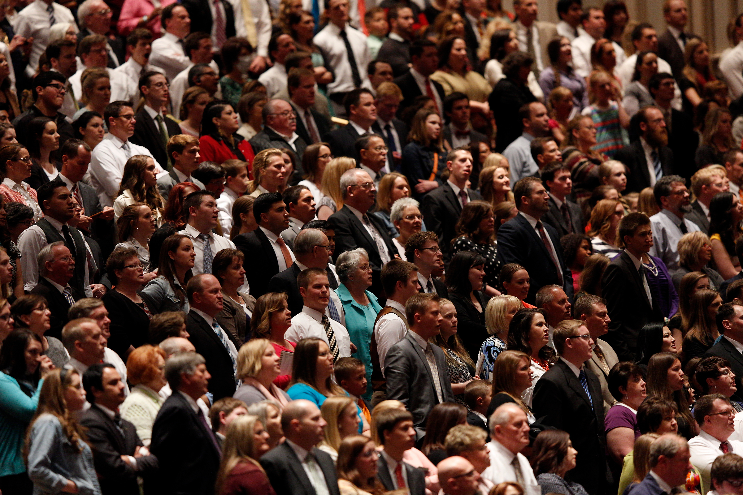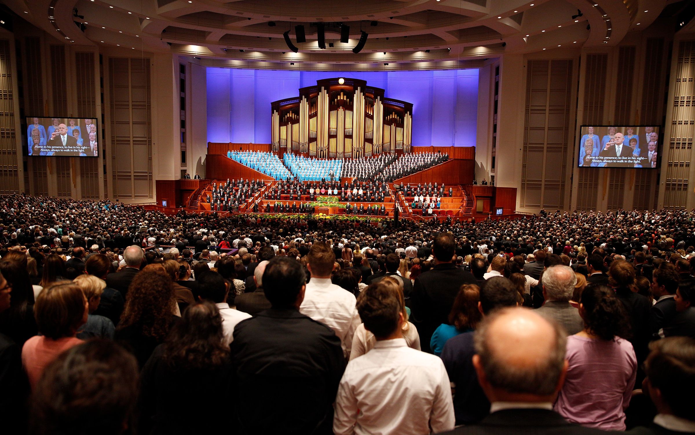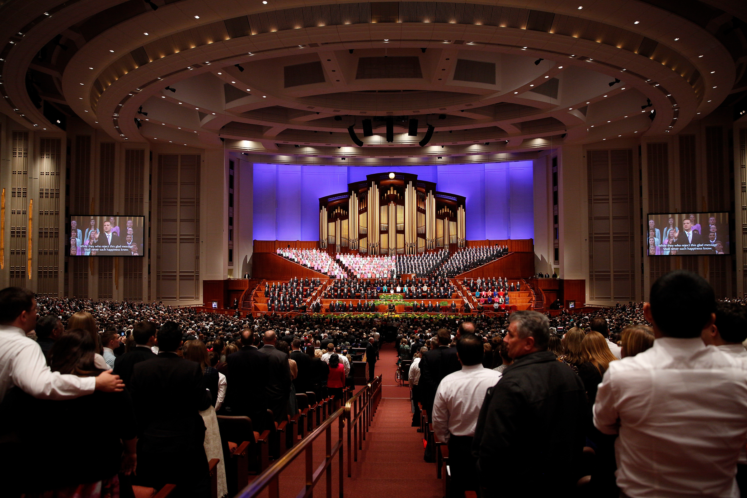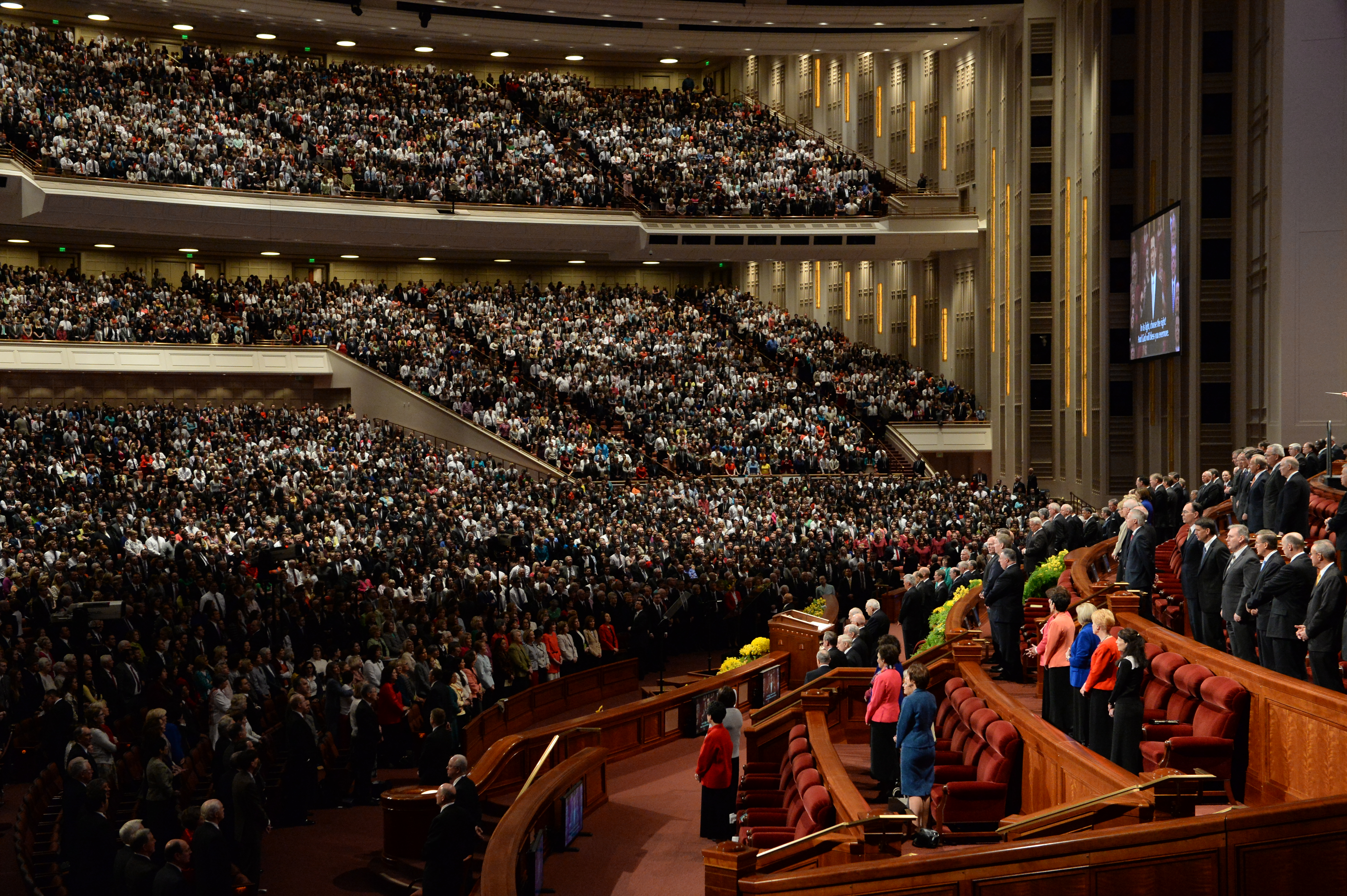 - The congregation and leaders stand to sing in the Conference Center in Salt Lake City, Utah during the Saturday morning session of general conference, 5 April 2014
