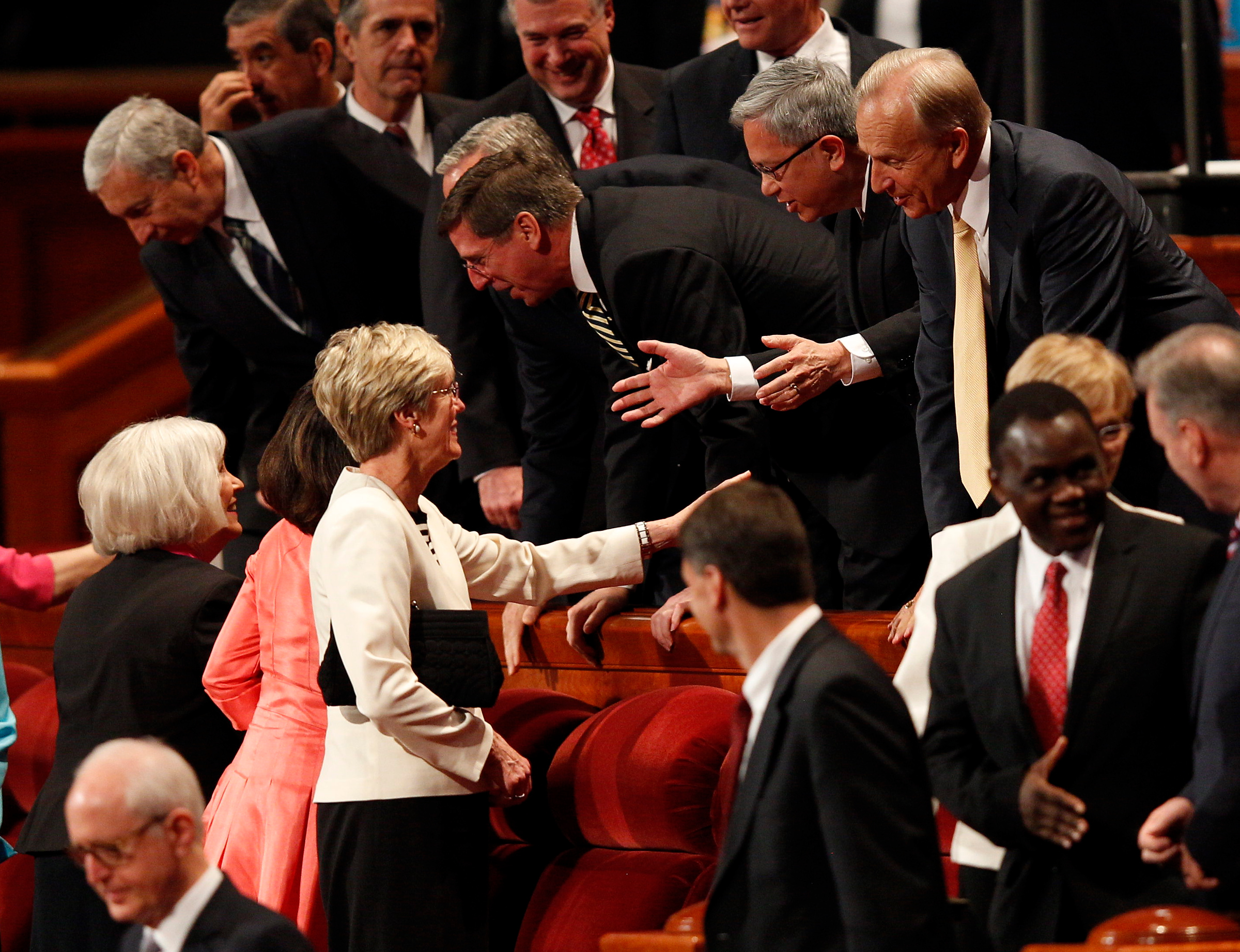 - General leaders of The Church of Jesus Christ of Latter-day Saints visit with each other following the Sunday morning session of general conference, 6 April 2014