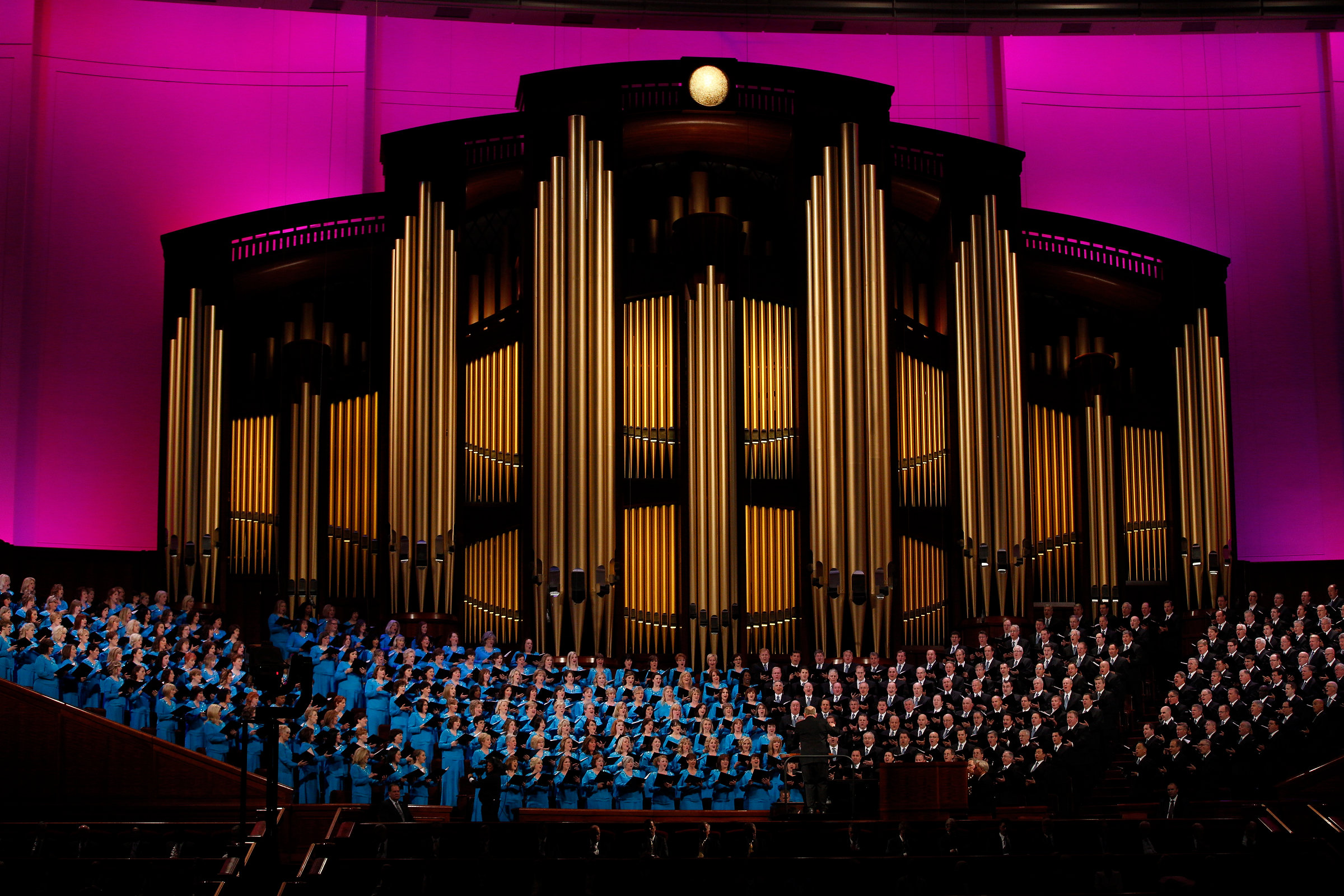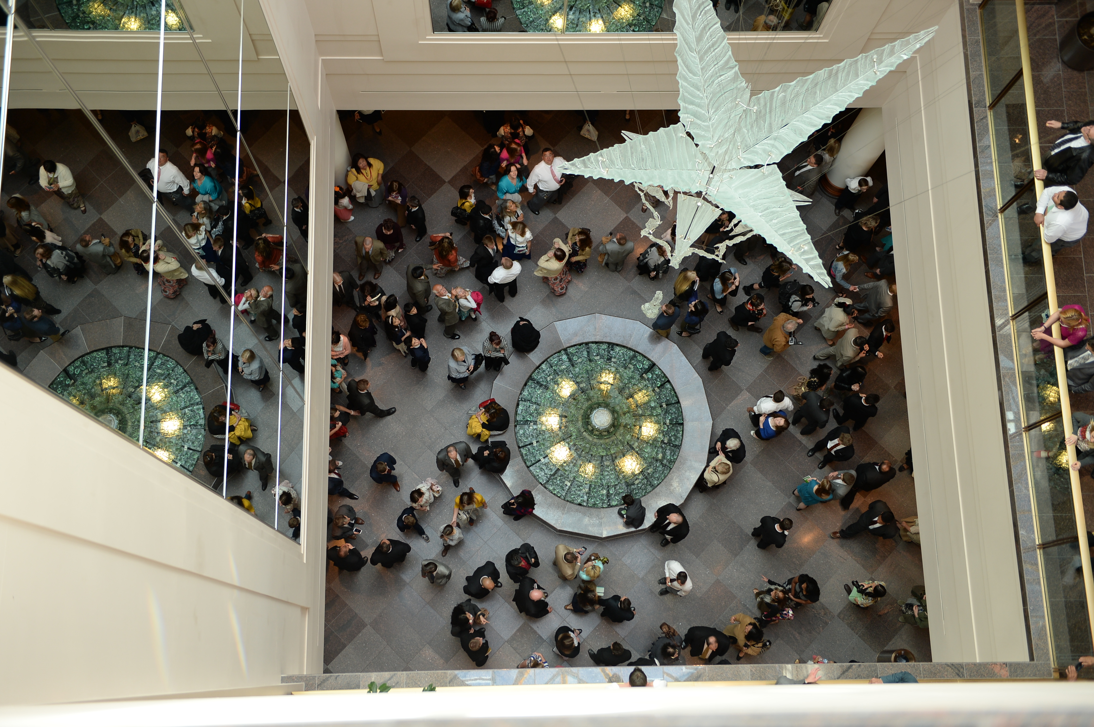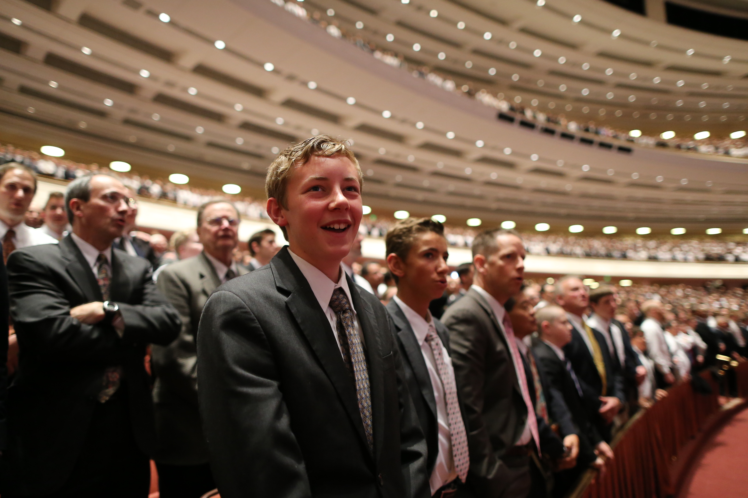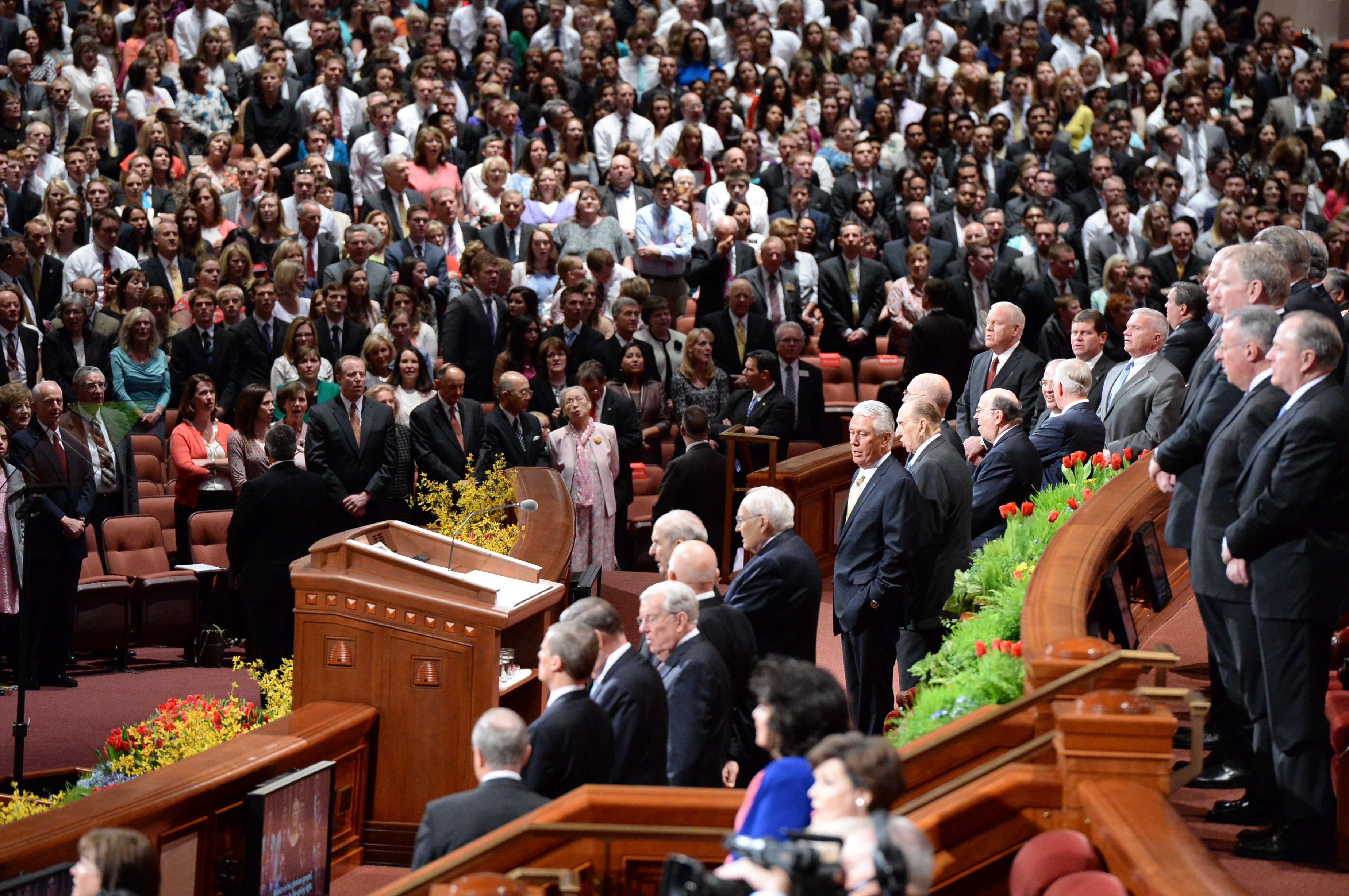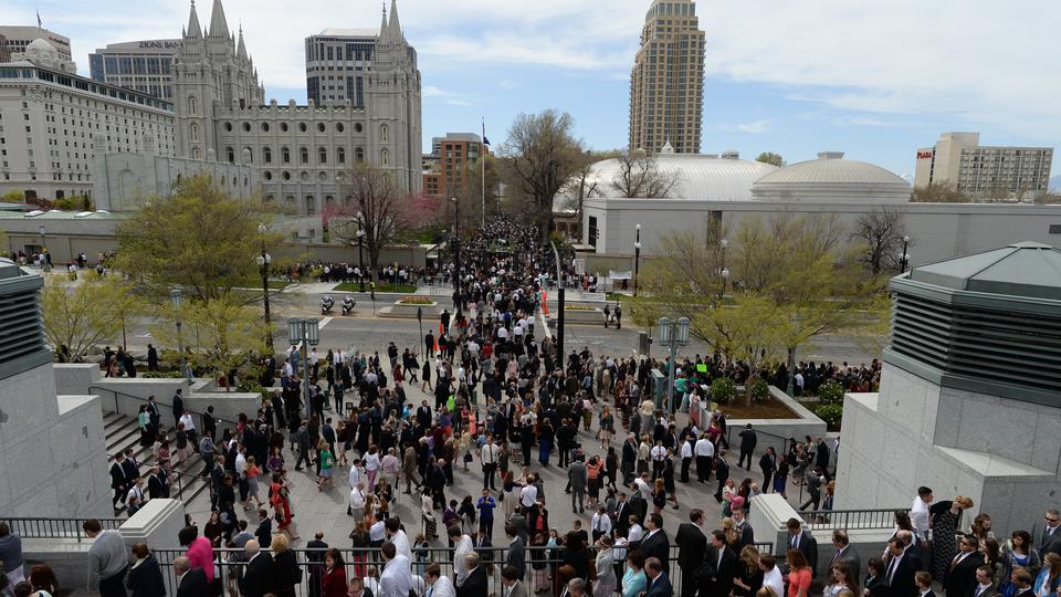 General conferences of The Church of Jesus Christ of Latter-day Saints take place every six months, originating in the 21,000-seat Conference Center in Salt Lake City and reaching a global audience estimated to be in the millions. The April 4–5 proceedings were interpreted live into 80 languages and are available in over 94 languages total via television, radio, satellite and Internet broadcasts. Six sessions of the conference will be held on March 28, April 4 and April 5, 2015, in the Conference Center in Salt Lake City, Utah.