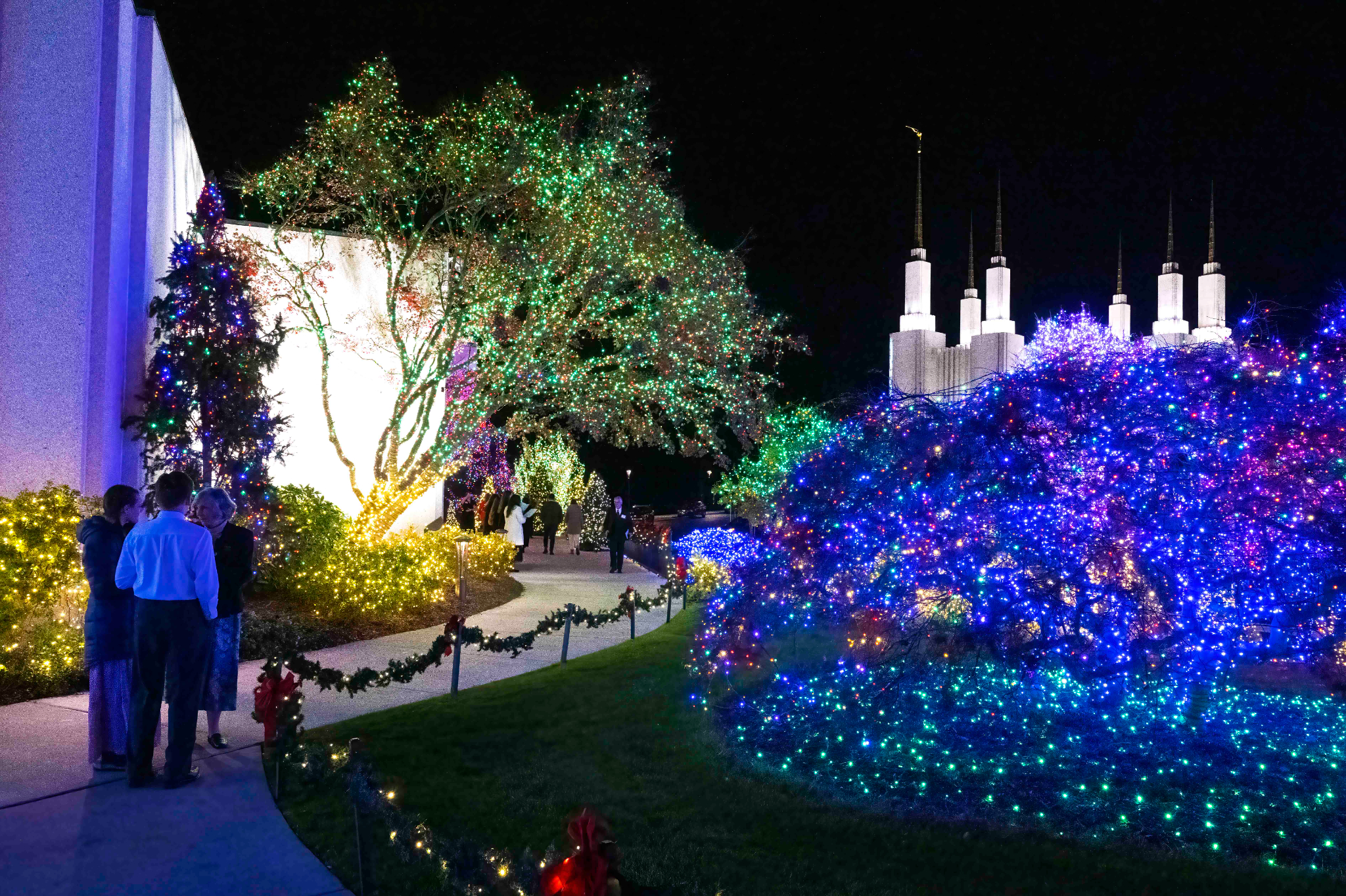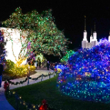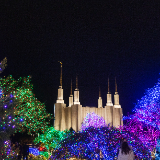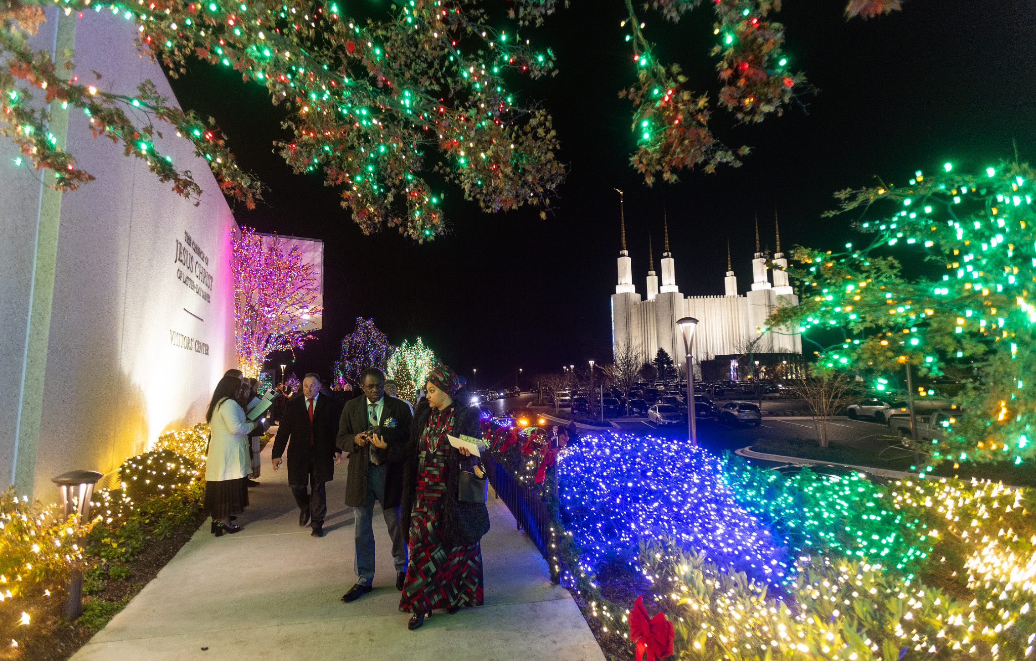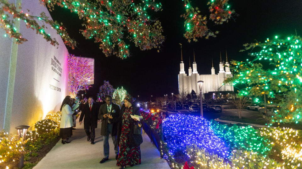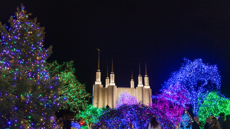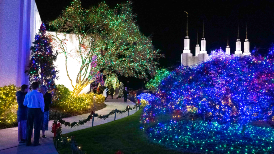 Green, red, white, purple and blue lights will illuminate the temple grounds each night from December 1 through January 2. In addition to the lights and decorated Christmas trees on the temple grounds, visitors can see 87 crèche displays, or nativities, from 64 countries inside the temple’s Visitors’ Center.