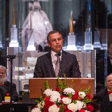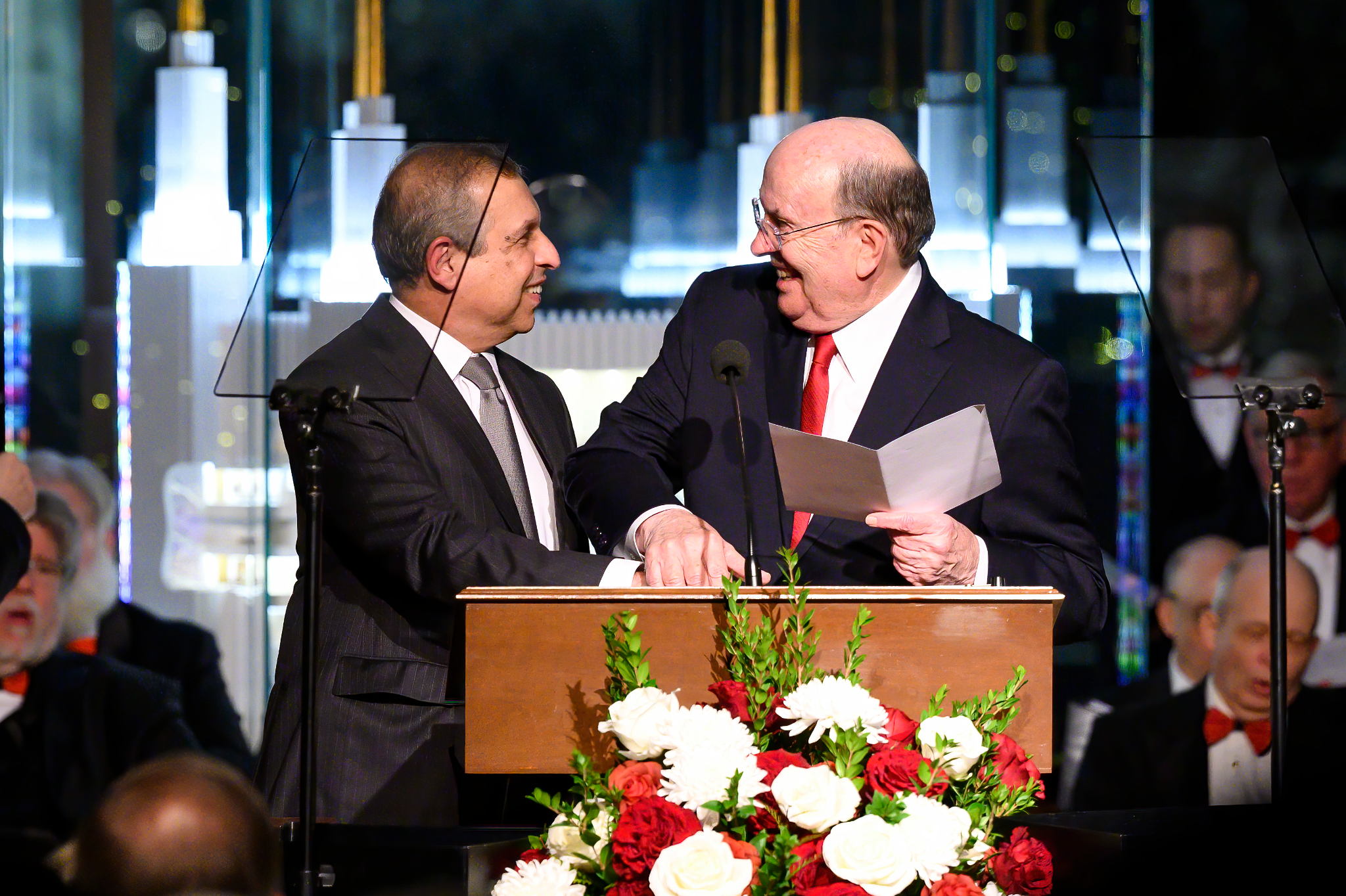 The ceremony took place in the lobby of the temple Visitors’ Center. Dozens of invited ambassadors, diplomats, and interfaith leaders attended the lighting ceremony. They faced a window that looked out at the brightly lit temple.