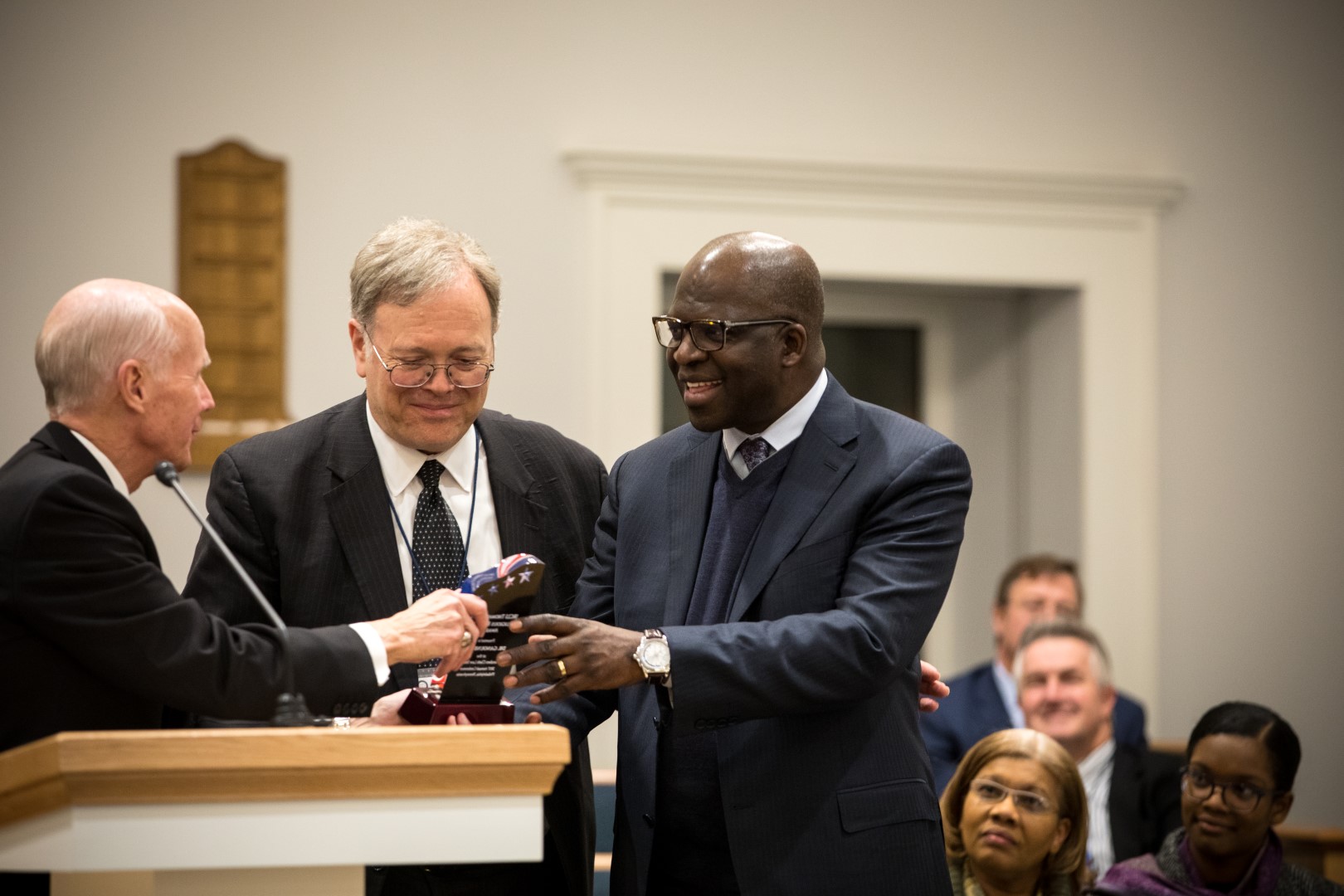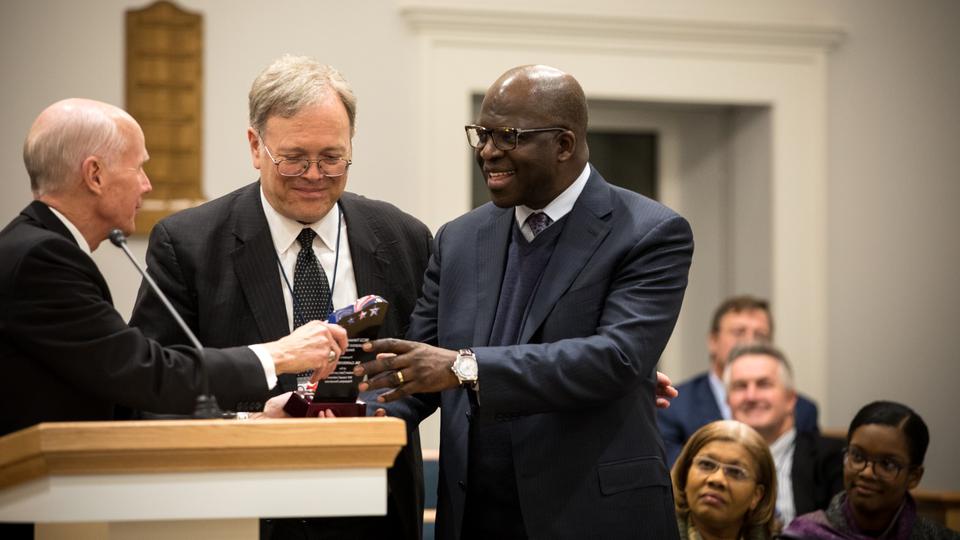 In presenting the award, Elder Lance B. Wickman, general counsel for The Church of Jesus Christ of Latter-day Saints and emeritus member of the Seventy, thanked Dr. Diop for being a friend of the Church like Thomas L. Kane was a friend to the Church.