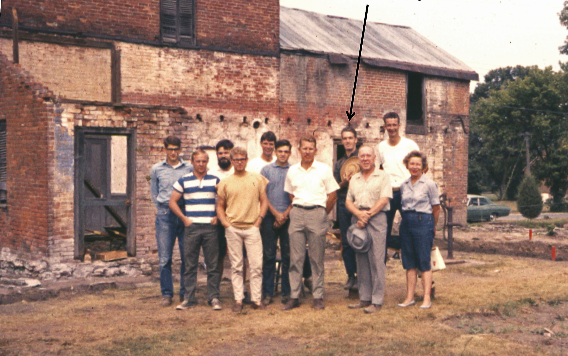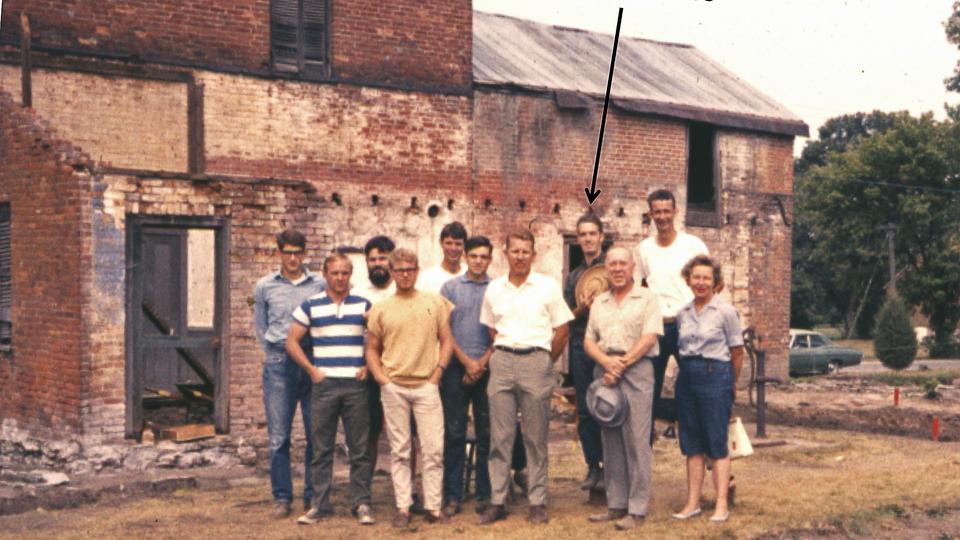 Don Enders and a group of archeologists and students working on the Jonathan Browning home and gun shop in Nauvoo, Illinois, in 1968. Enders is identified by the black arrow.