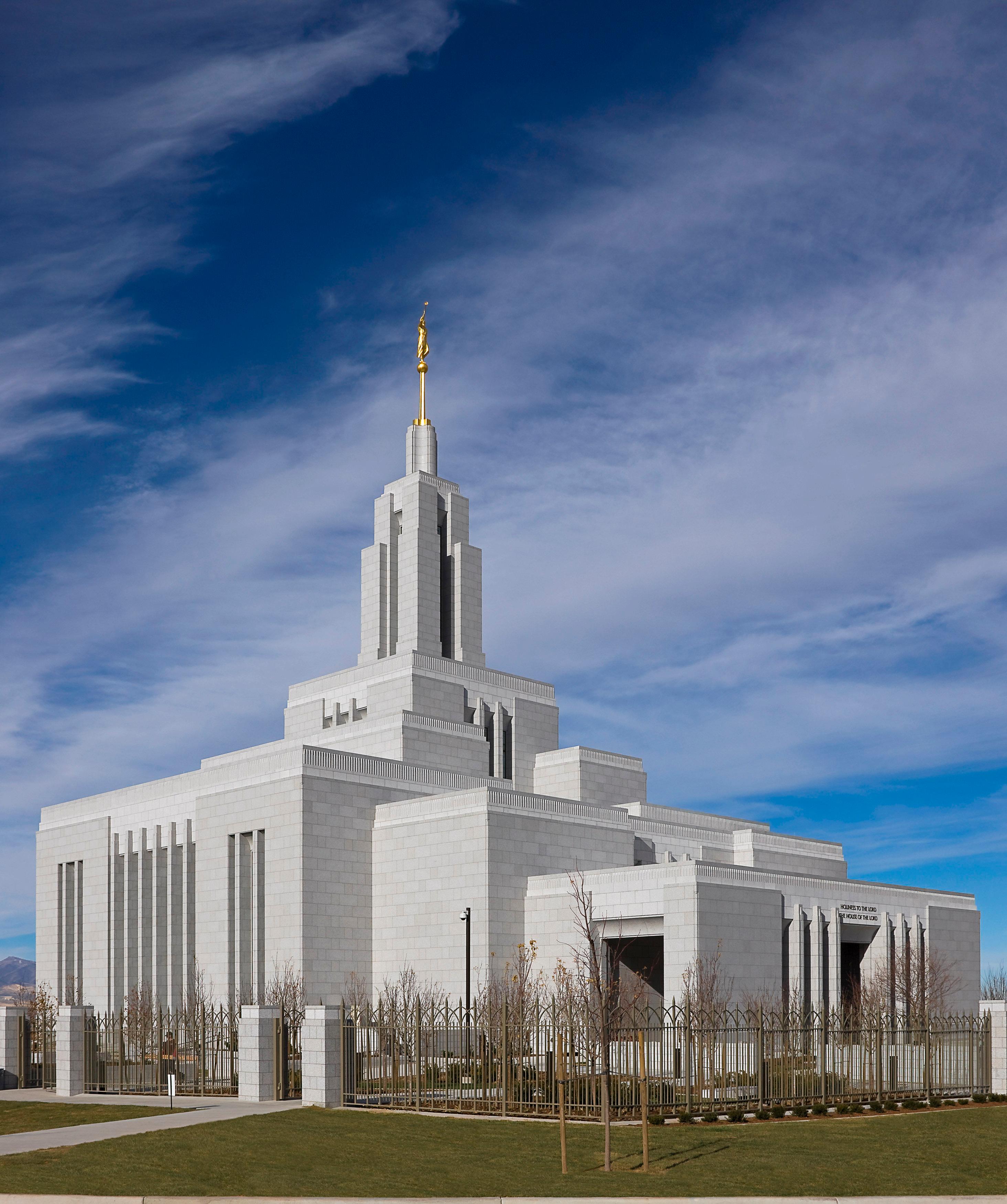 Now, with the mountains of Corner Canyon as a backdrop, the Draper Utah Temple rises more than 168 feet to the top of its angel Moroni statue. Its exterior is made of white granite from China, and its interior includes limestone from France and Makore wood from Central Africa. Art-glass and murals were created by local artists.