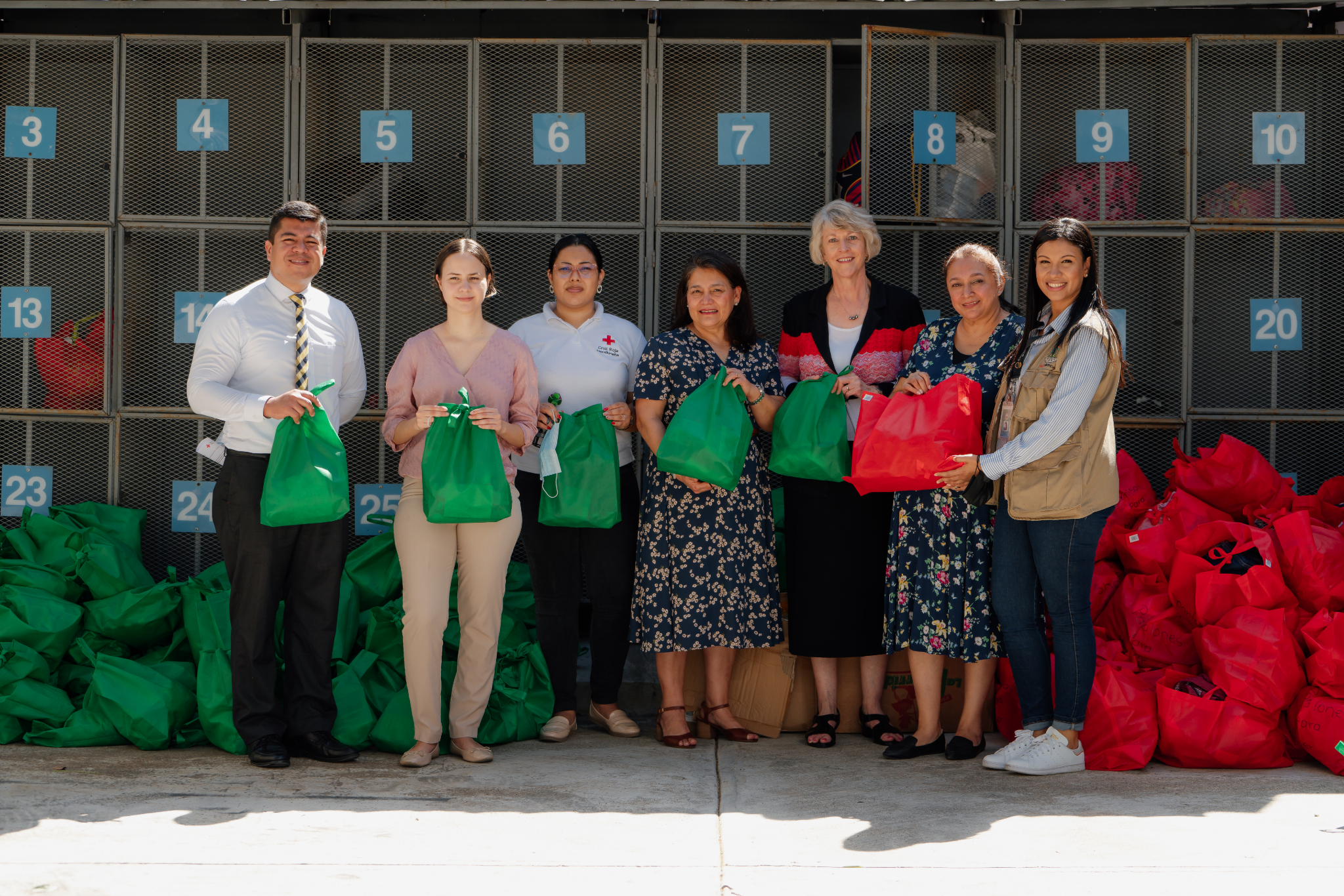 La hermana Ruth Renlund, tercera desde la derecha, ayuda con una donación de la Iglesia de kits de higiene y ropa para migrantes durante una asignación en Honduras con su esposo, el élder Dale G. Renlund, del Cuórum de los Doce Apóstoles, en febrero de 2023.2023 by Intellectual Reserve, Inc. All rights reserved.Mientras estuvo en Honduras, la hermana Renlund participó en un proyecto de servicio en el que la Iglesia donó kits de higiene y ropa para familias migrantes que habían regresado del Centro de Atención a Niños y Familias Migrantes, que es operado por la Cruz Roja Hondureña.